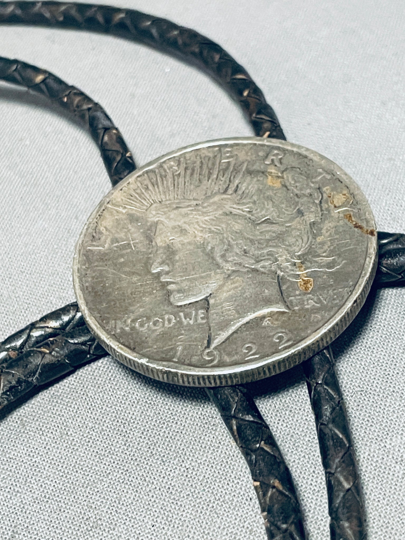 A marvelous Navajo bolo. This is such a unique bolo! This 1922 silver dollar has been transformed into a cool bolo tie! It has a black braided leather tie with 1-1/4" silver tips and is about 39" in length. The Native American bolo tie is a unique and iconic accessory that originated in the Southwest United States. It is a type of necktie characterized by a decorative slide or "bolo" that holds the tie together. The bolo tie is often associated with Western and Southwestern fashion, and it has become a recognized symbol of Western and Native American cultures. Sterling silver. The bolo measures around 1-1/2" x 1-1/2". Sturdy 44 grams.