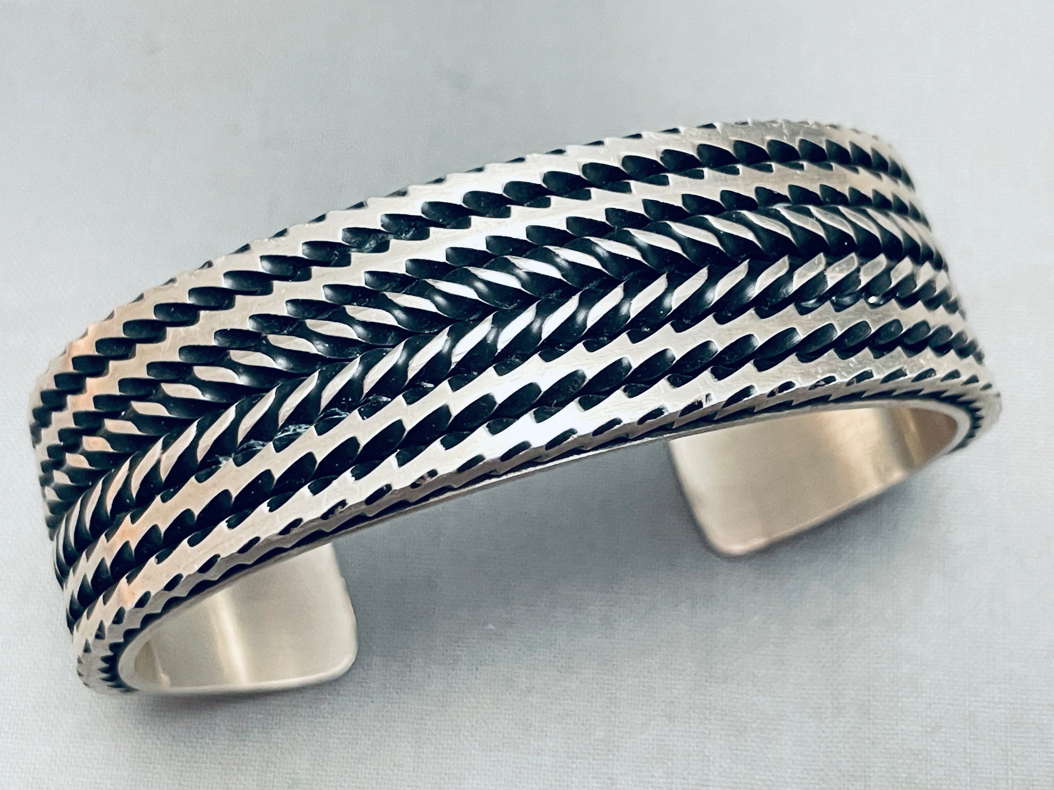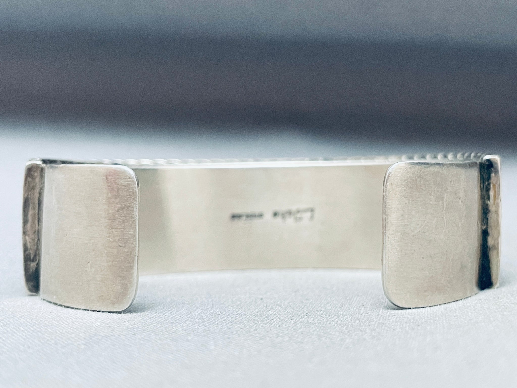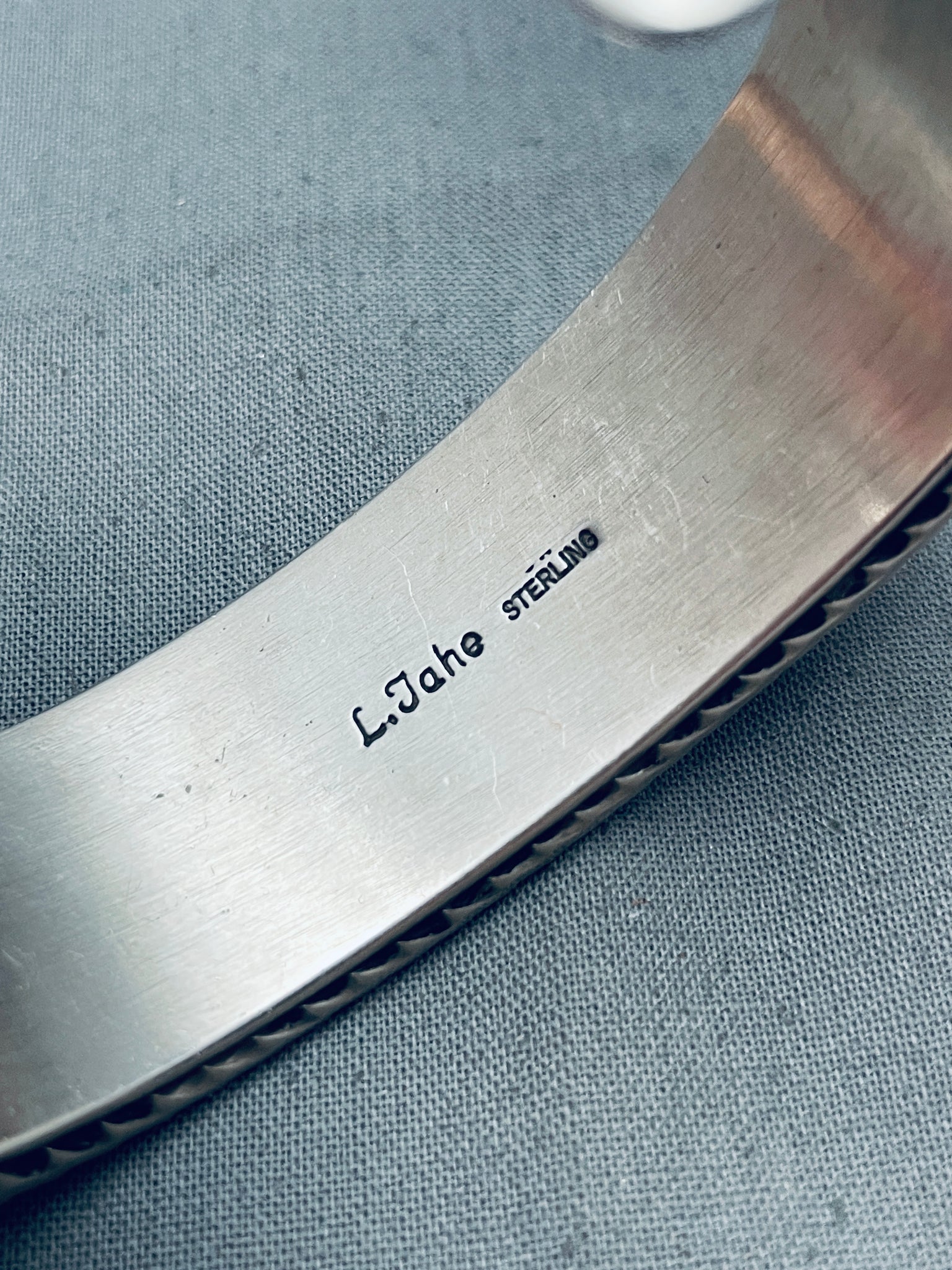 This is a tremendous vintage Navajo large and thick silver cuff bracelet. This impeccable bracelet contains 6 outstanding silver shanks that are protruding from the cuff. Each of the protruding shanks are absolutely stunning consisting of deep segments. The thickness of this bracelet is absolutely mind blowing. The width of the bracelet measures around 3/4". Signed by Navajo artist, L. Tahe. Sterling silver, marked. The inside end to end measures around 5-1/2" with an additional 1-1/4" gap. Sturdy 79 grams.