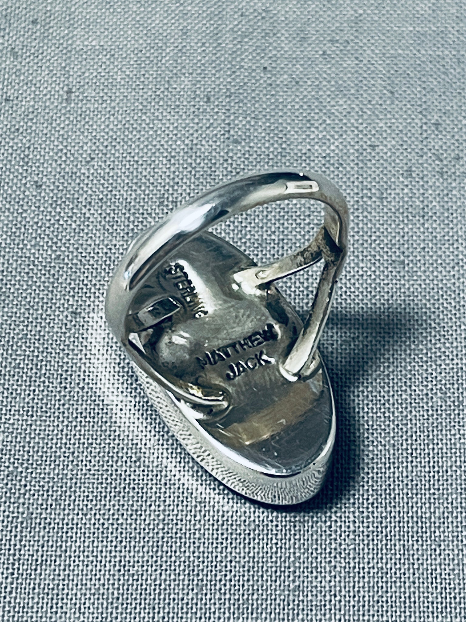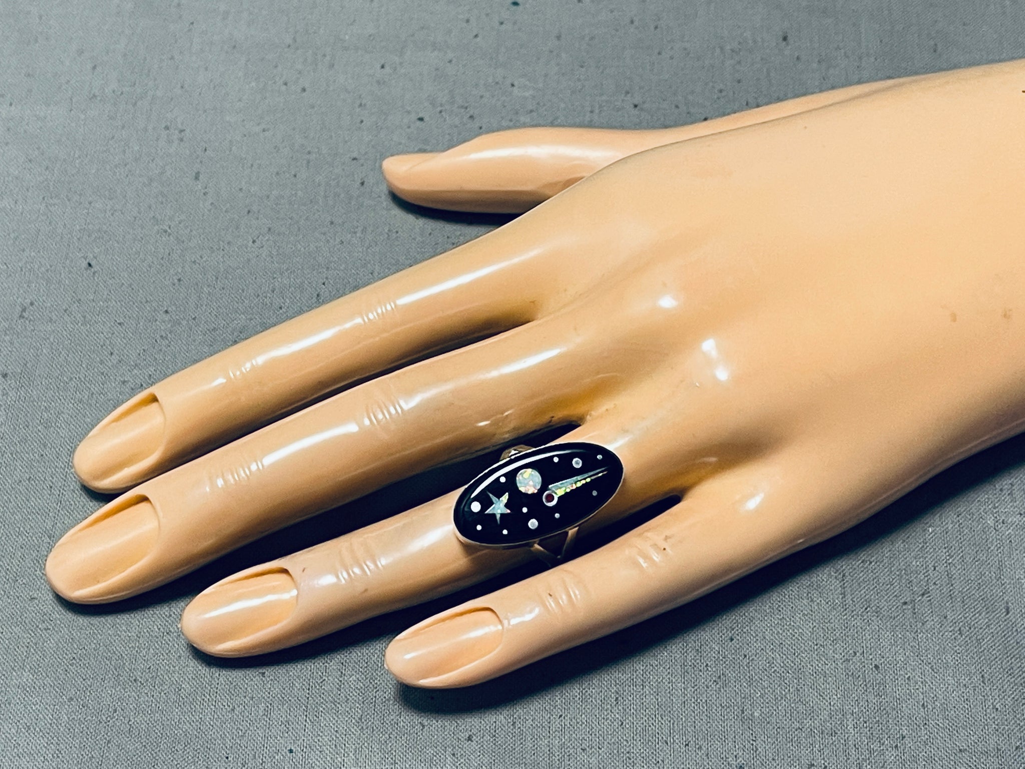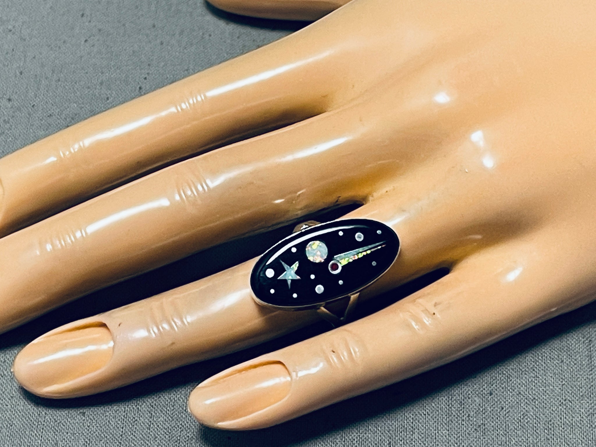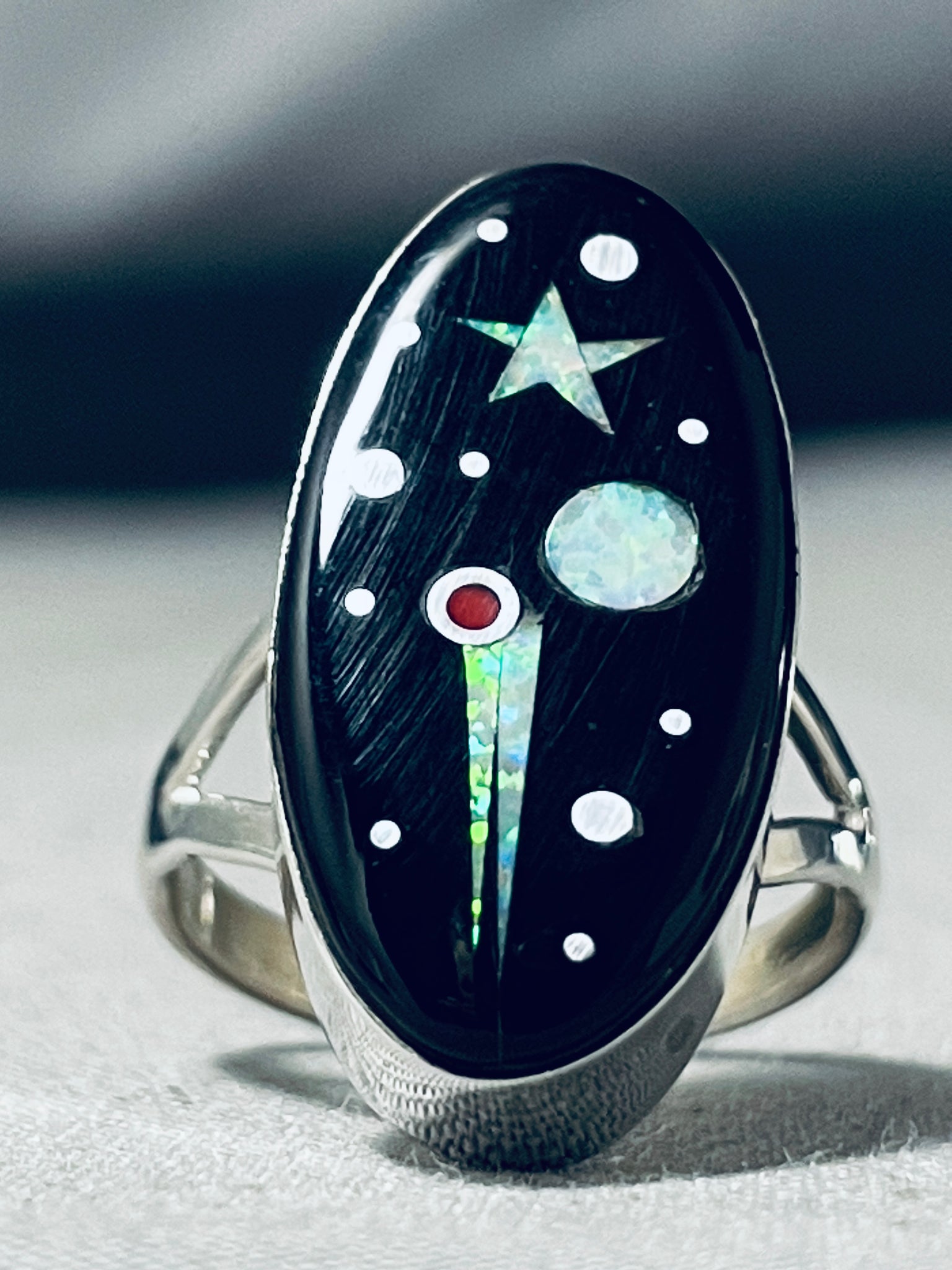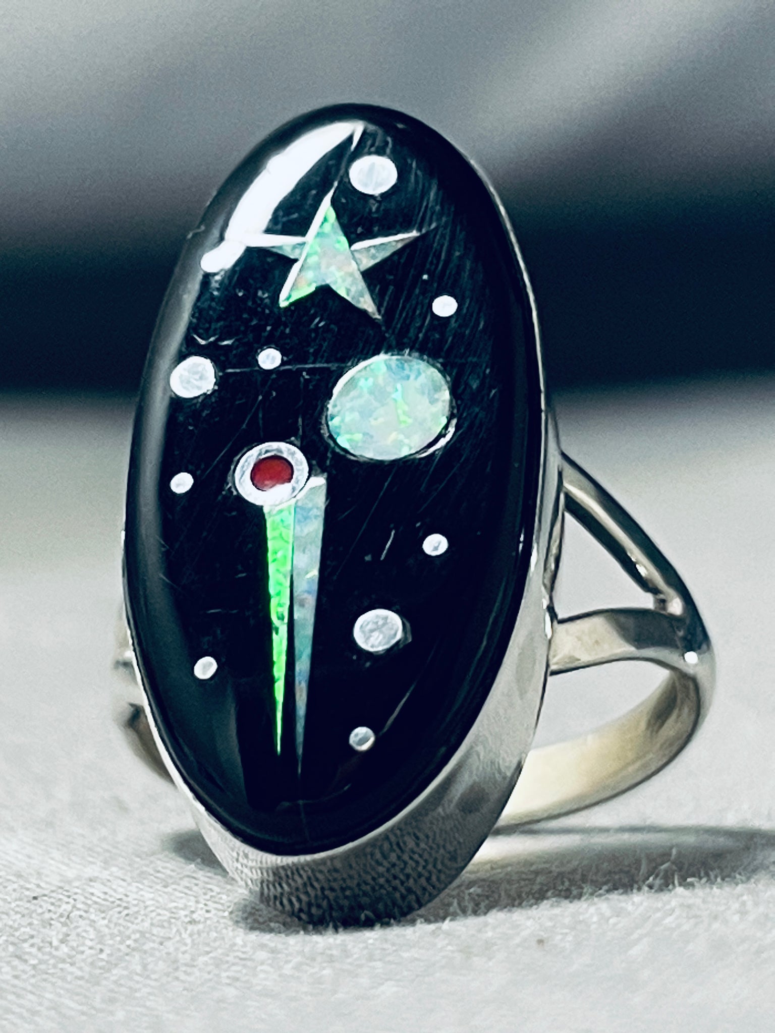 This is a striking Navajo inlaid space inlay silver ring. This ring contains an amazing shooting star inlay that consists of opal, coral and onyx. The ring face measures around 1" x 1/2". Signed by Navajo artist, Matthew Jack . The ring size is around 6.5. Cir. 1970's+. Sterling silver, marked. Sturdy 4 grams.