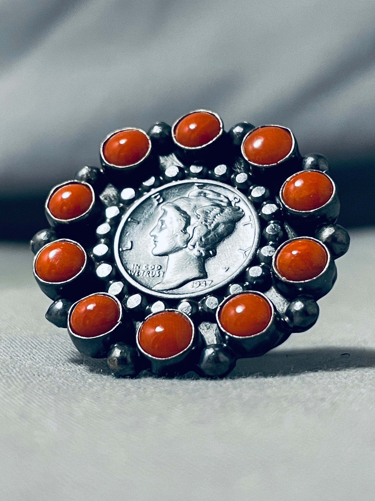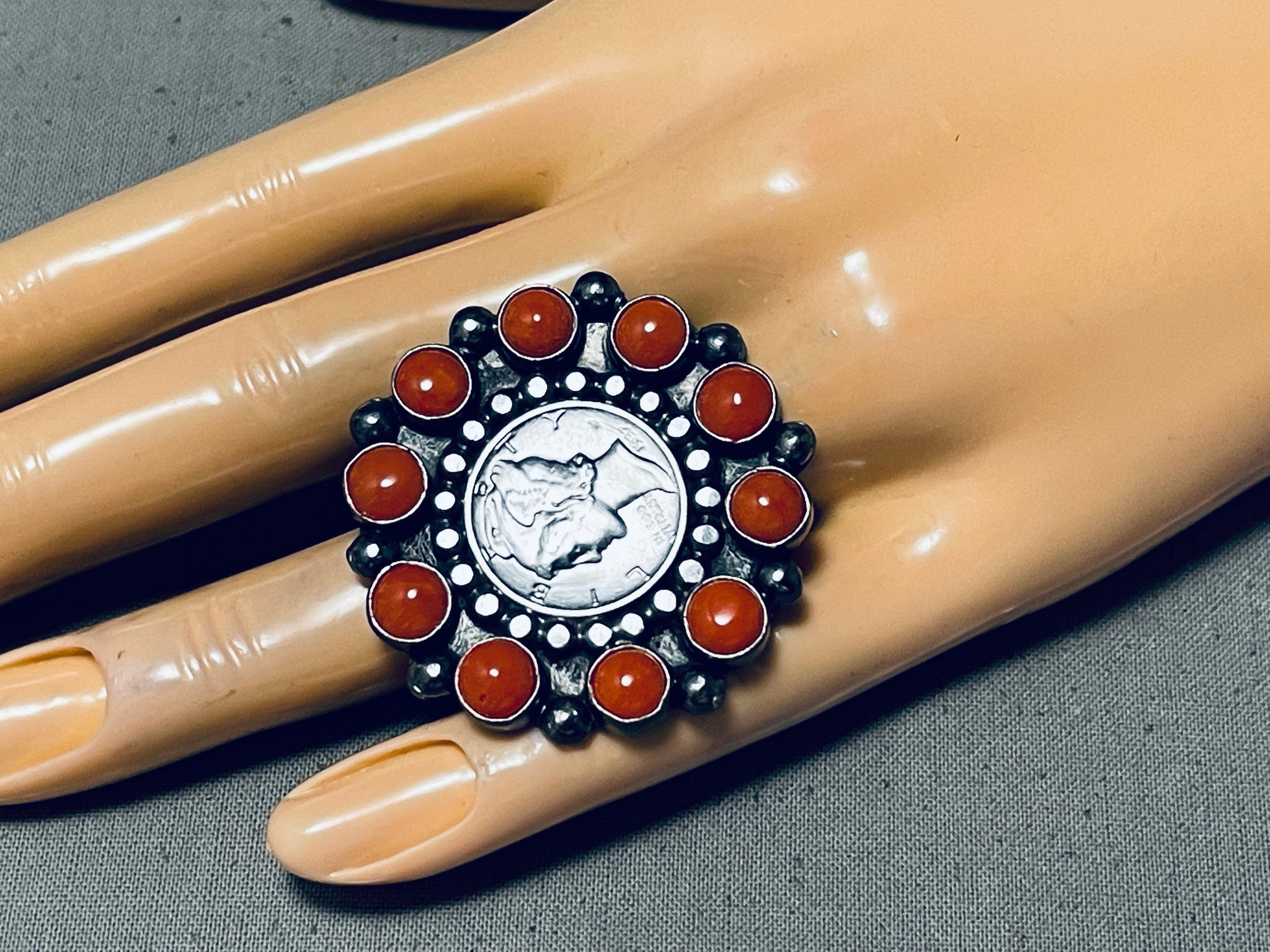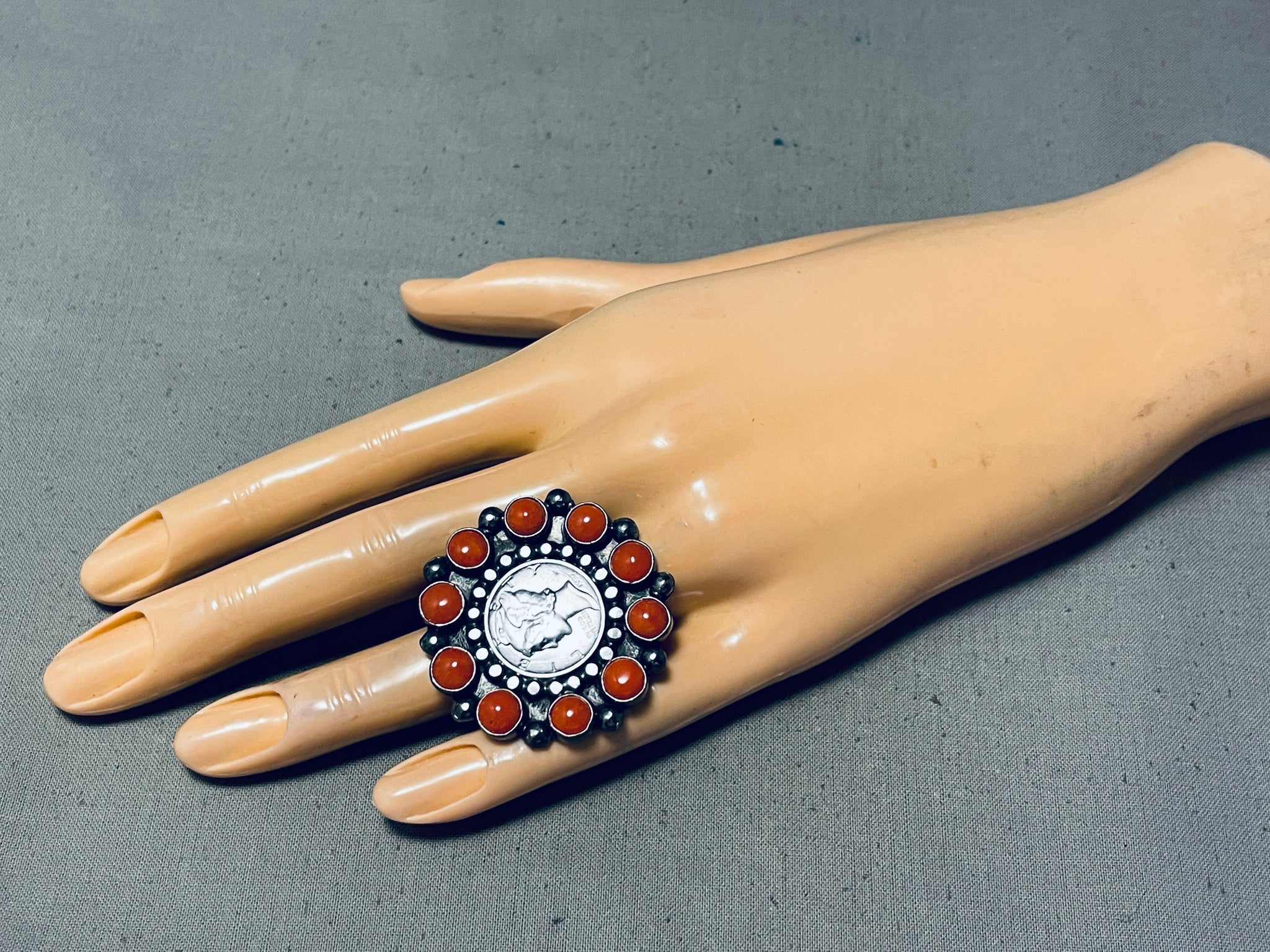 Crazy Best Navajo Coral Coin Sterling Silver Native American Ring