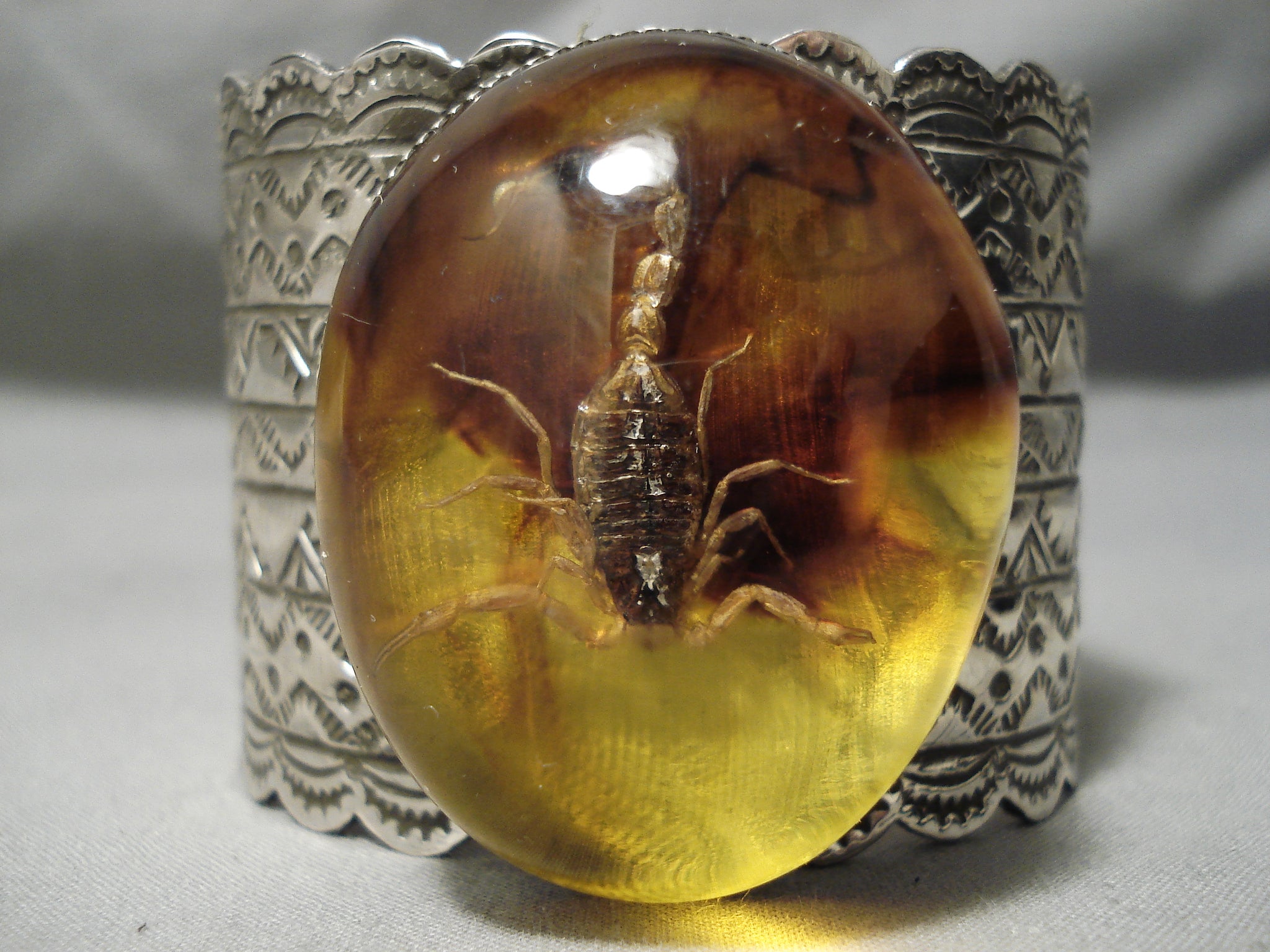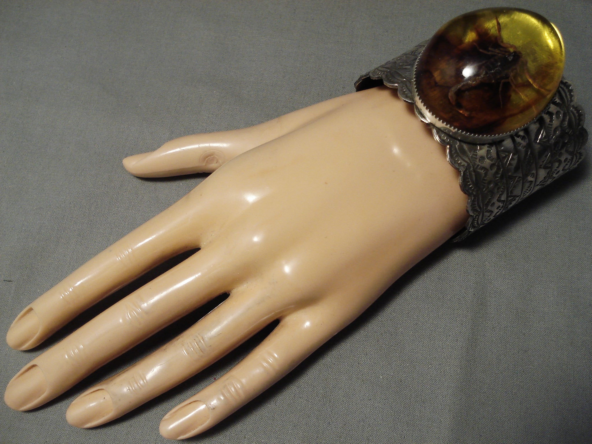 Crazy Huge Native American Scorpion Amber Sterling Silver Hand Tooled Bracelet