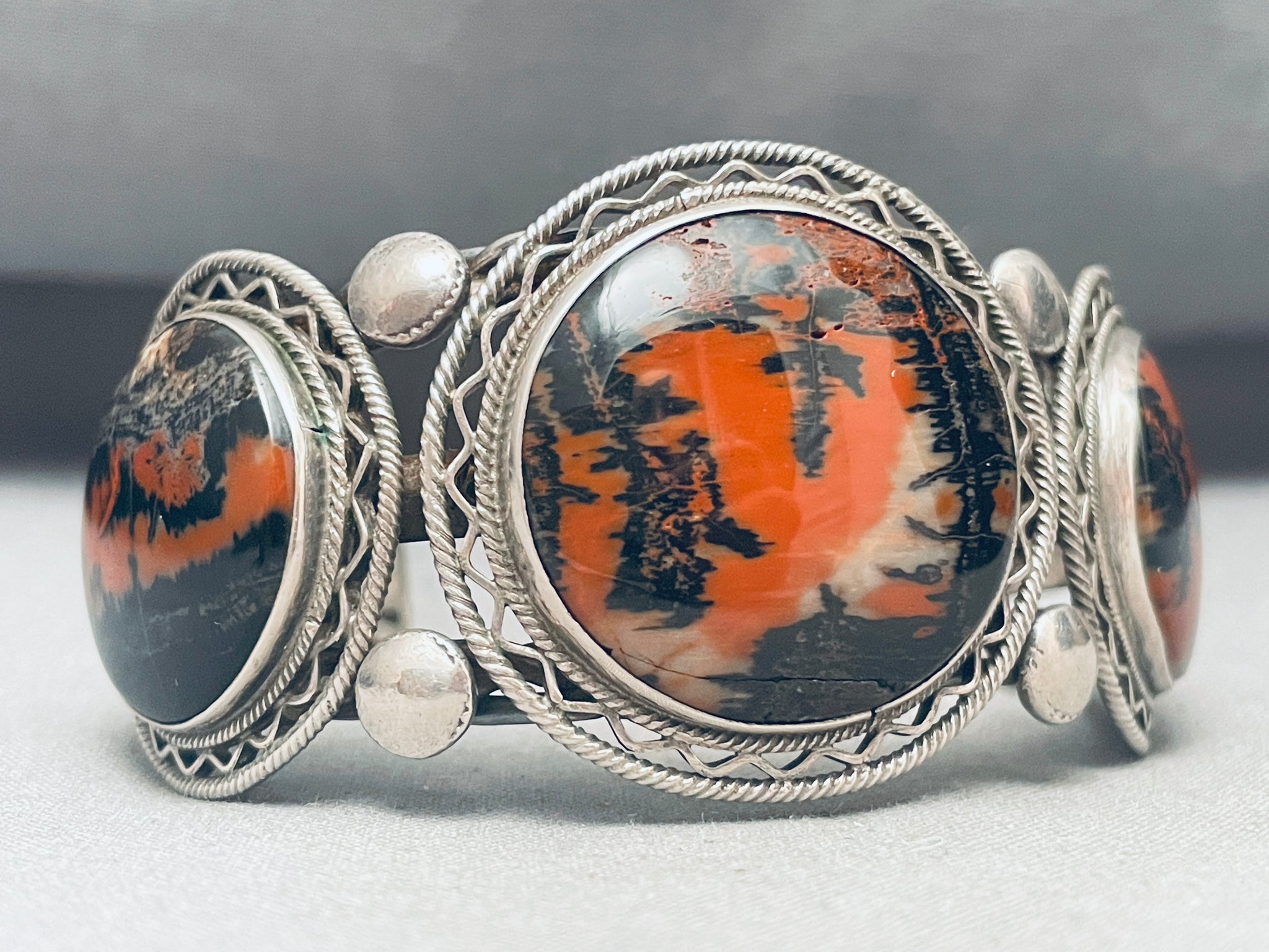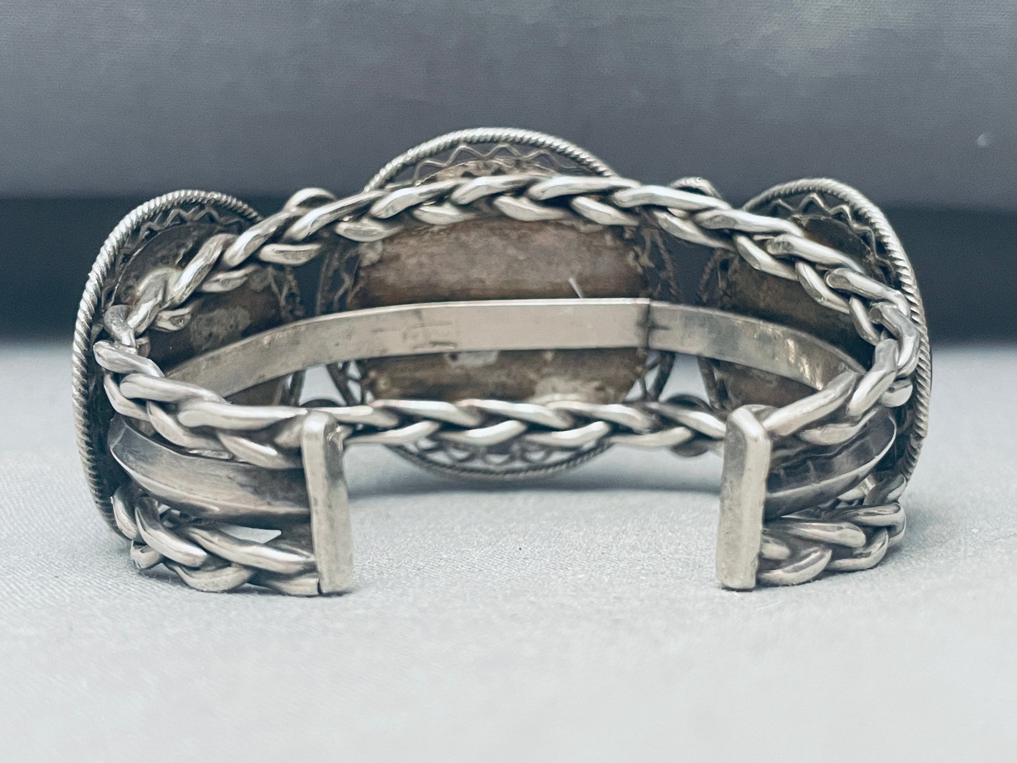 This is a striking vintage Navajo three stone silver bracelet. This amazing bracelet contains three beautiful rounded petrified wood stones that graduate in size towards the center. Surrounding the stones are amazing silver works that include ropes and zig zag patterns. Also accenting the stones are four very large silver raindrops. This bracelet contains a marvelous triple silver shank cuff that graduates in width towards the center. The two outer shanks are thick wonderful twisted shanks allowing the bracelet to be that much more sturdy and durable. The center stone measures around 1-1/8" x 1-1/8". The width of the bracelet measures around 1-3/8". Sterling silver. Cir. Mid Century +. The inside end to end measures around 5-1/2" with an additional 1" gap. Sturdy 62 grams.