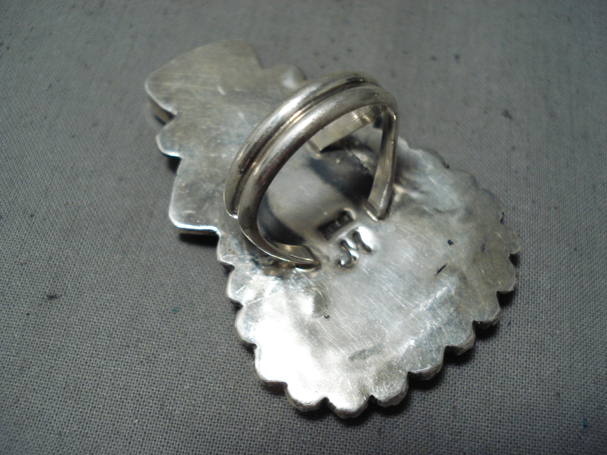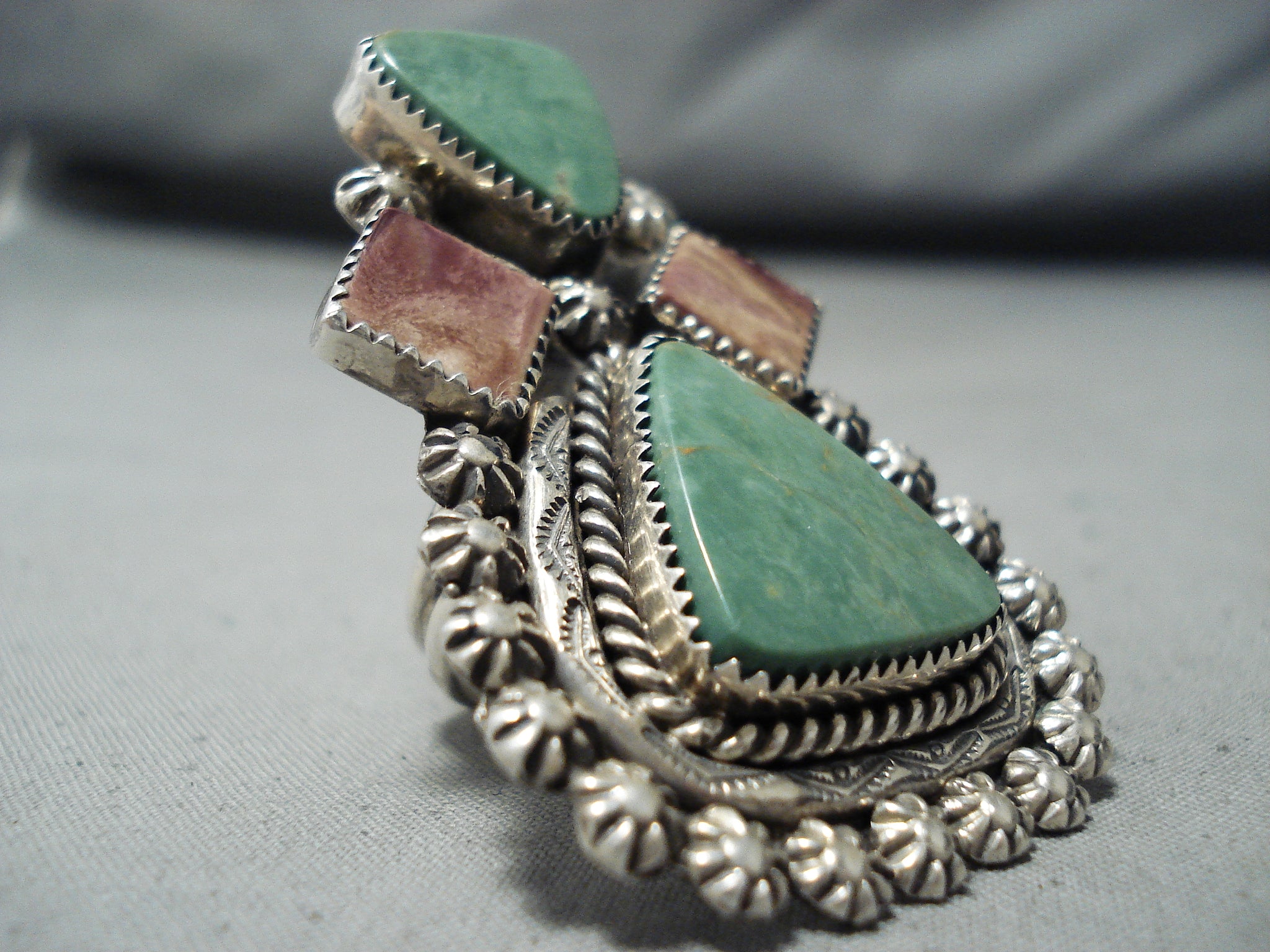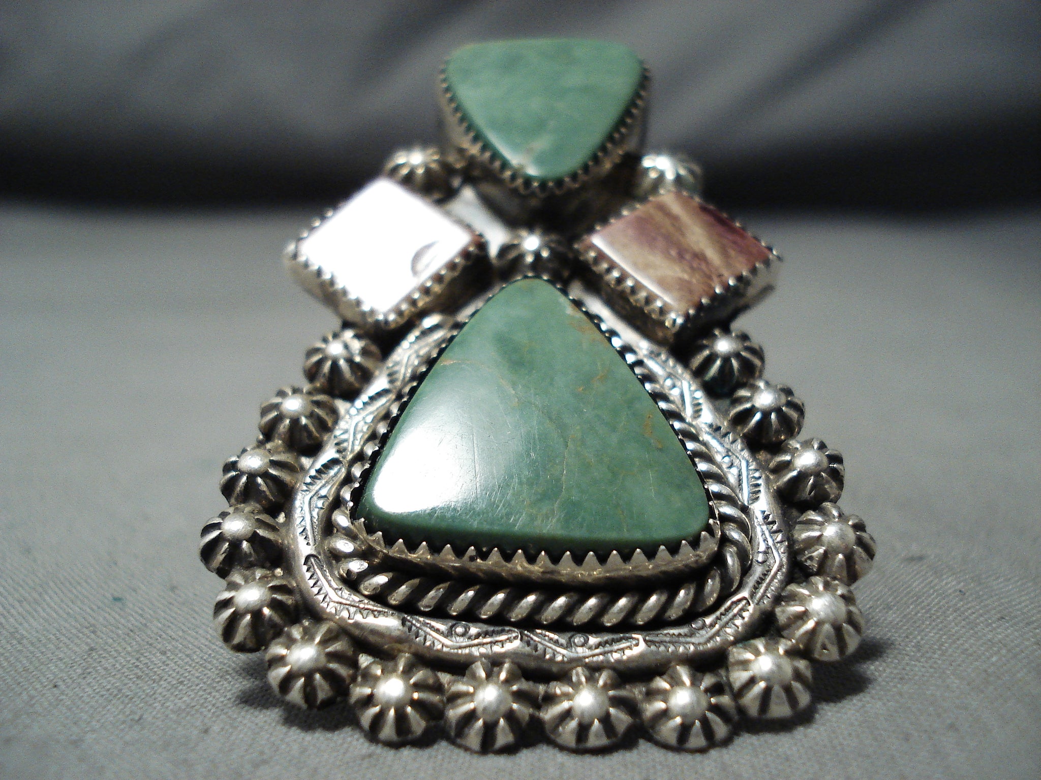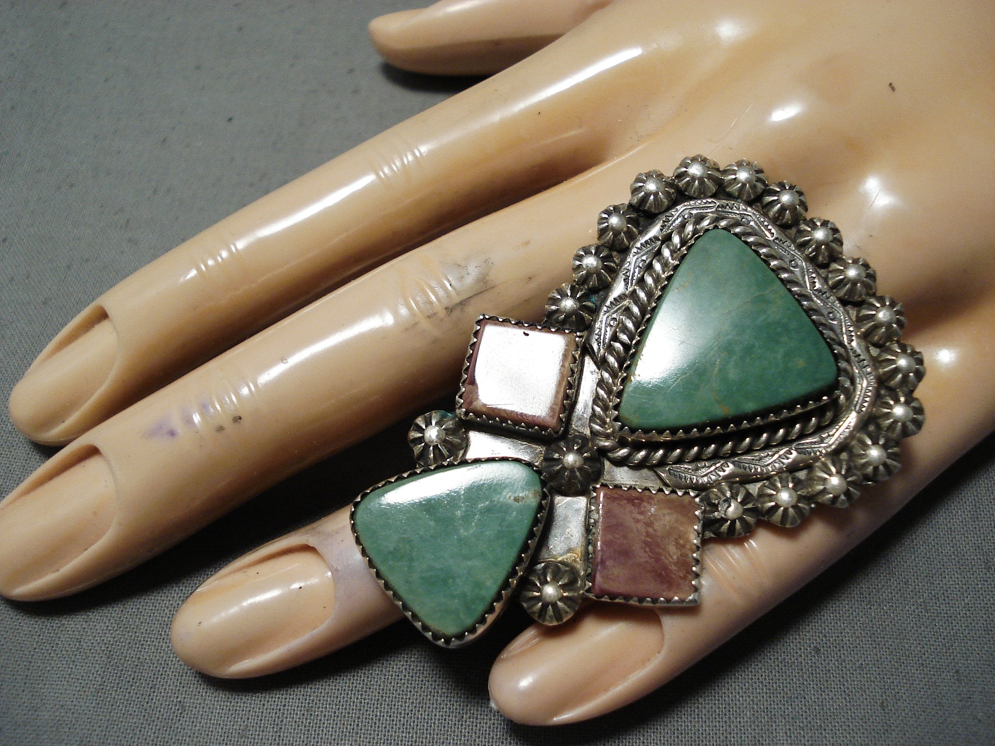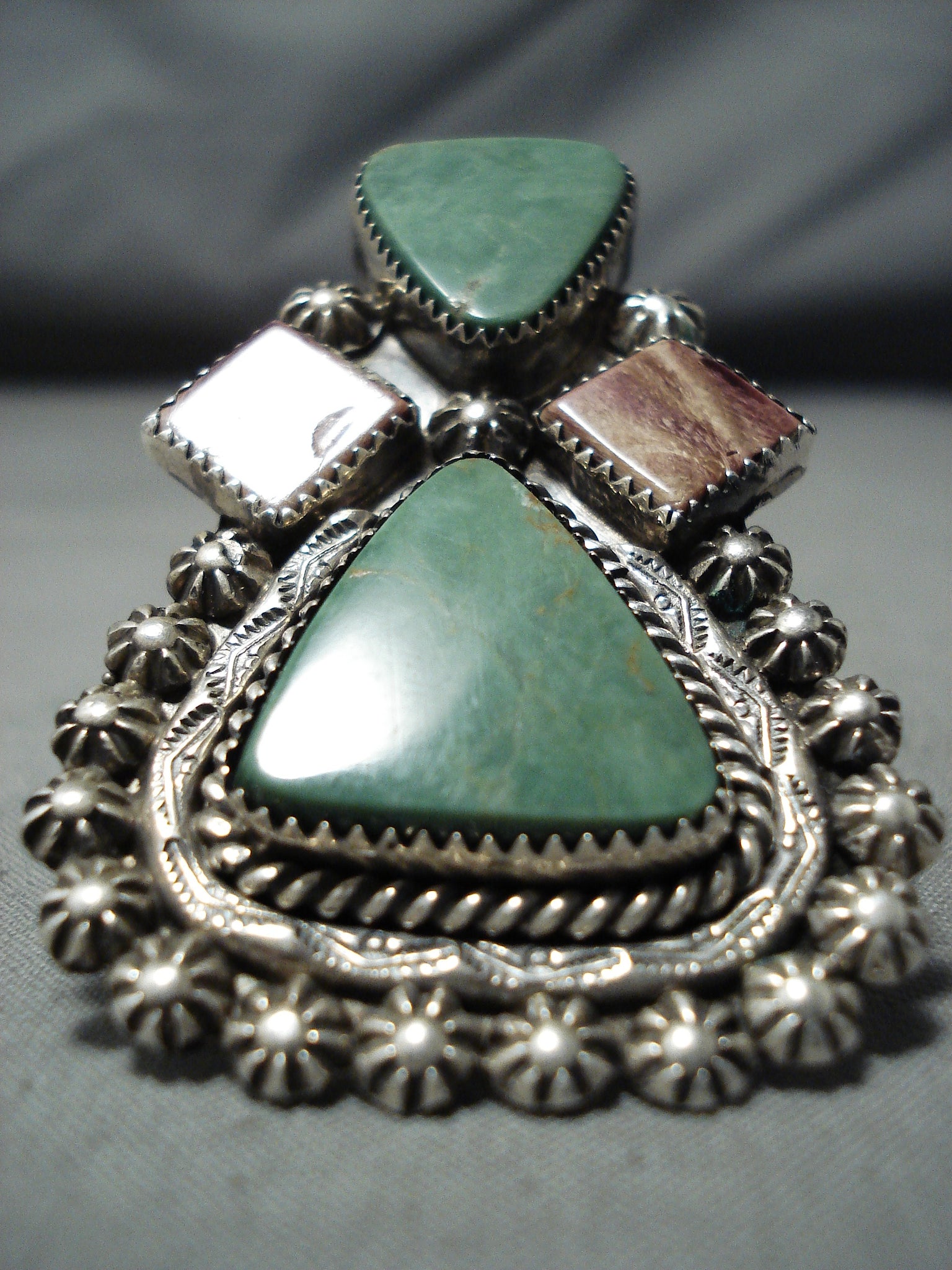 This is a breathtaking Navajo ring featuring 2 triangular turquoise stones, 2 spiny oyster stones, handcarved silver rope, a handstamped silver border, handcarved silver stars, and a graduated double rail silver band that reduces to a solid silver band! So Incredible! The largest stone measures around 3/4" x 3/4". The ring face measures around 2-1/4" x 1-1/2". Signed by Navajo artist, John McCray. The ring size is around 10. Sterling silver, marked. Sturdy 22 grams.