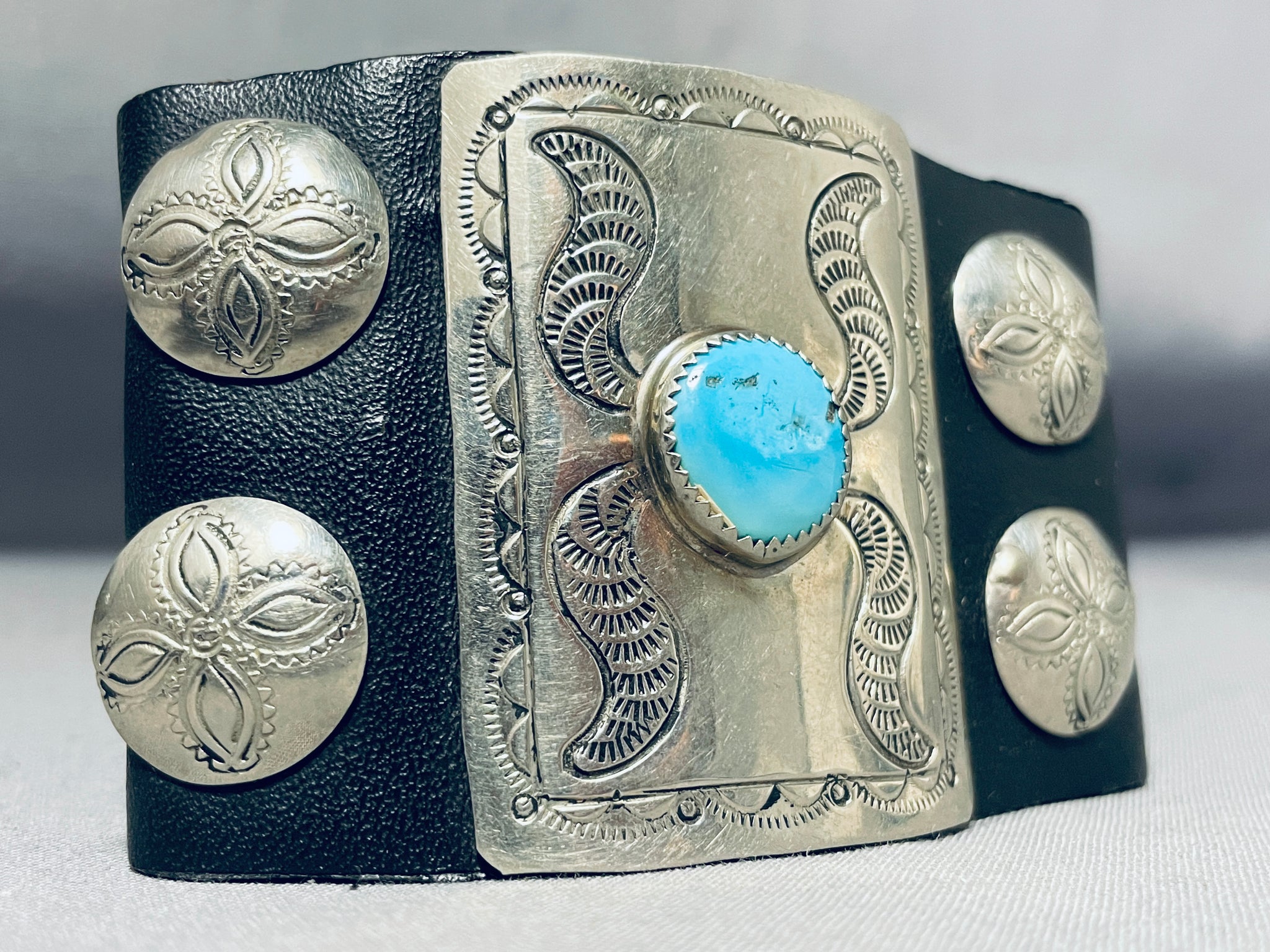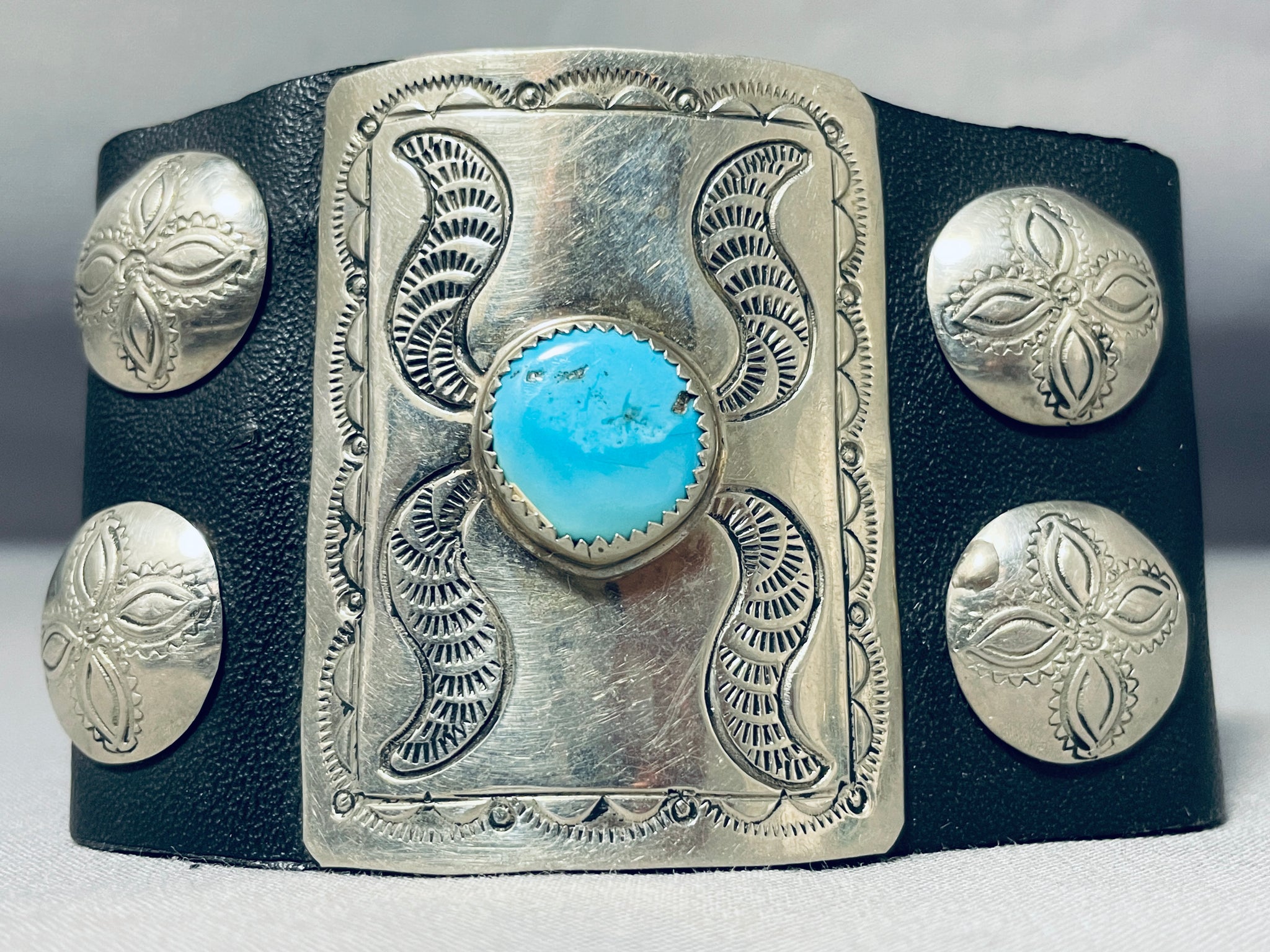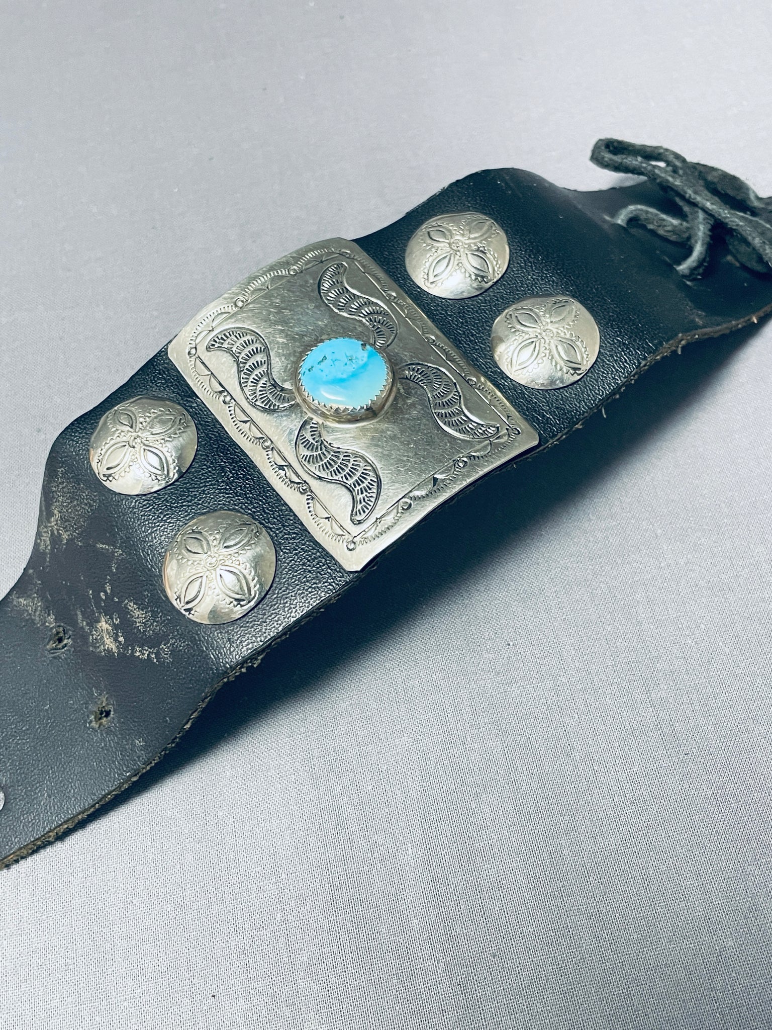 We are proud to offer this museum quality vintage Navajo bowguard featuring a large rectangular silver plate with an Old Kingman turquoise stone, and 4 handstamped round silver plates, on a black leather cuff with adjustable ties! Absolutely Striking! The center stone measures around 1/2" x 1/2". The width of the bracelet measures around 2". Sterling silver. The inside end to end measures around 7-1/2". Sturdy 39 grams. Cir Mid Century