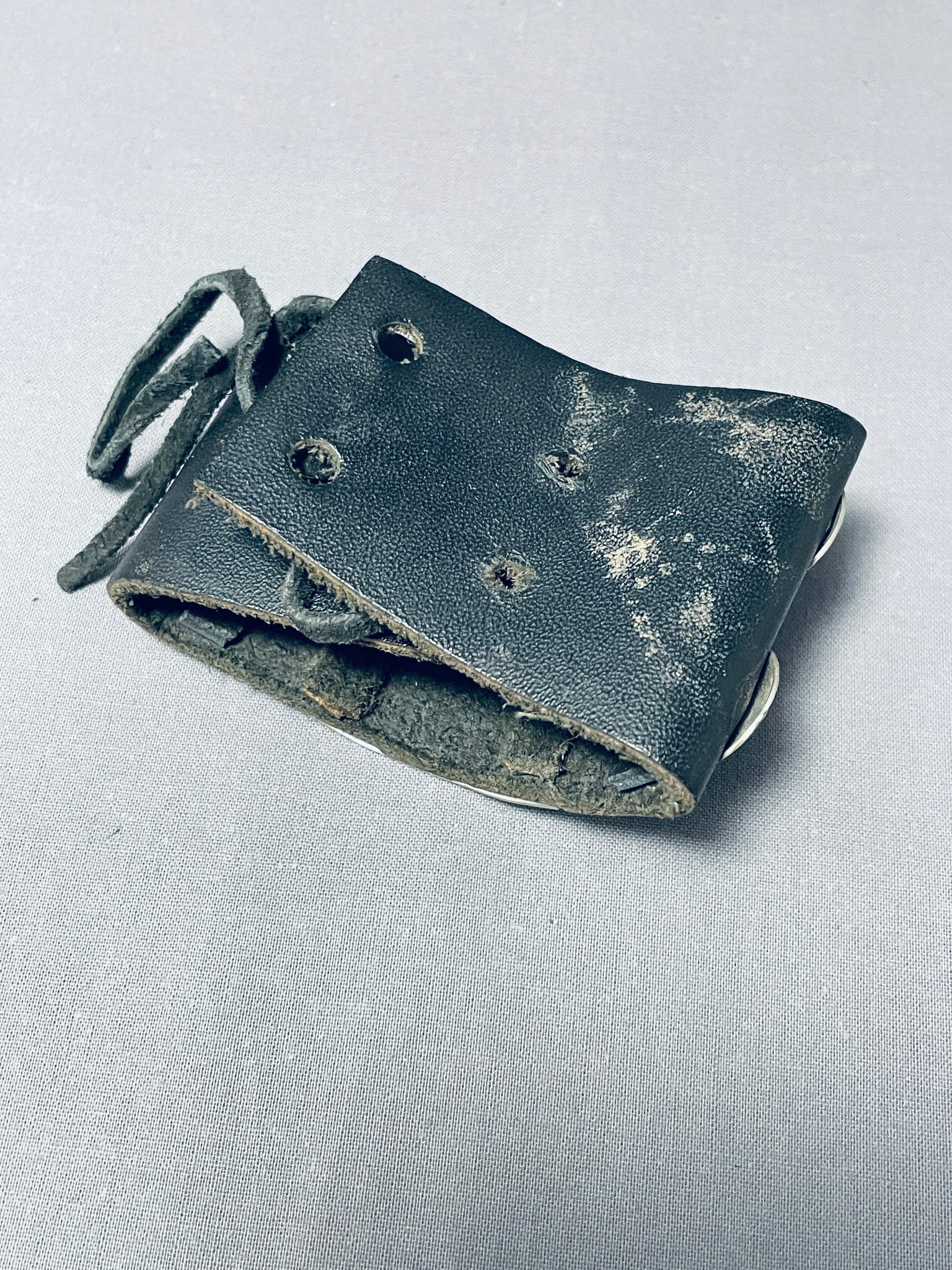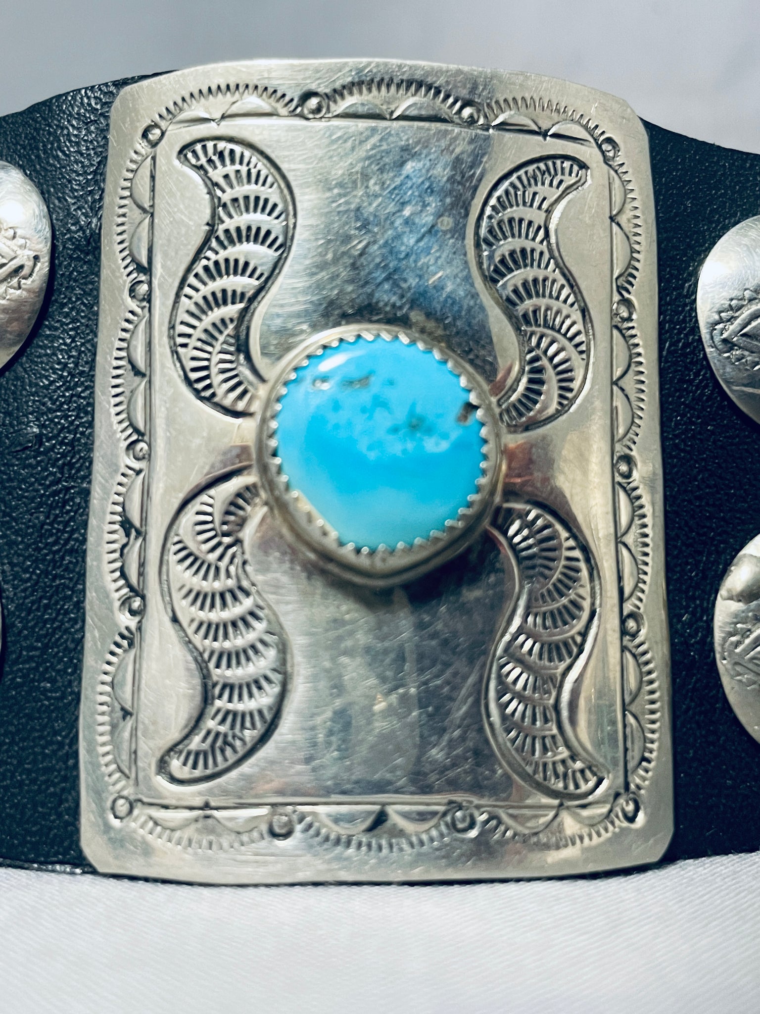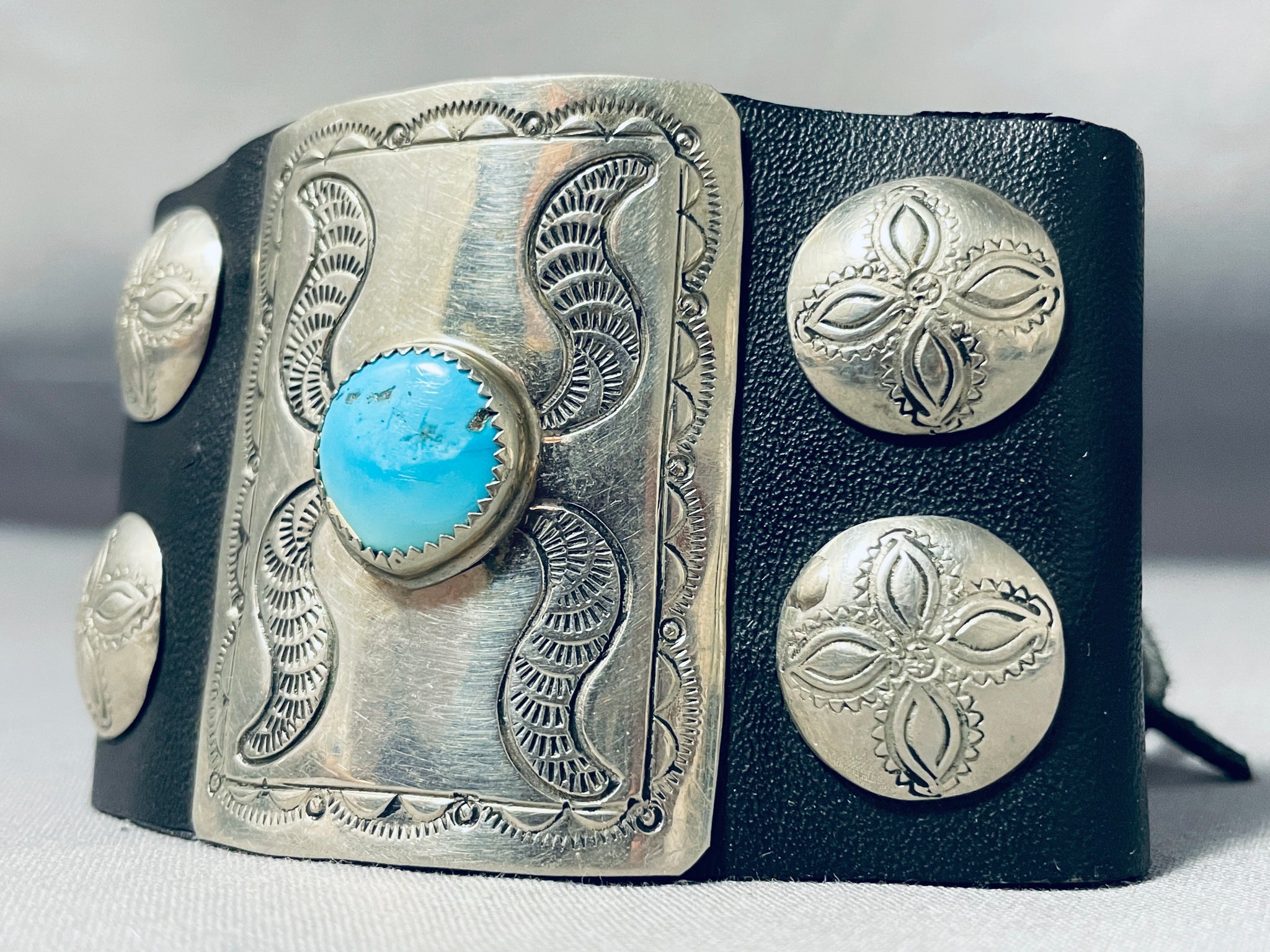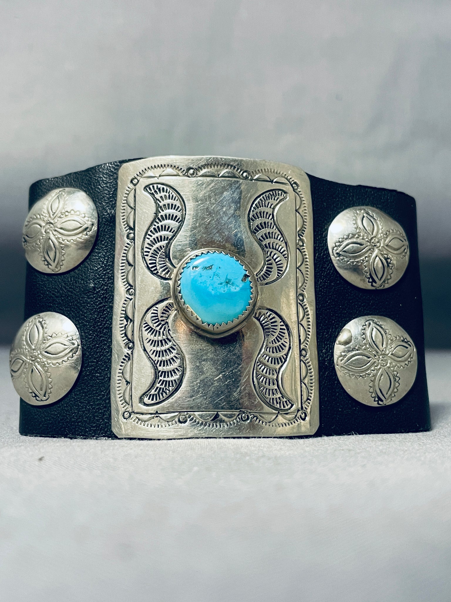 We are proud to offer this museum quality vintage Navajo bowguard featuring a large rectangular silver plate with an Old Kingman turquoise stone, and 4 handstamped round silver plates, on a black leather cuff with adjustable ties! Absolutely Striking! The center stone measures around 1/2" x 1/2". The width of the bracelet measures around 2". Sterling silver. The inside end to end measures around 7-1/2". Sturdy 39 grams. Cir Mid Century