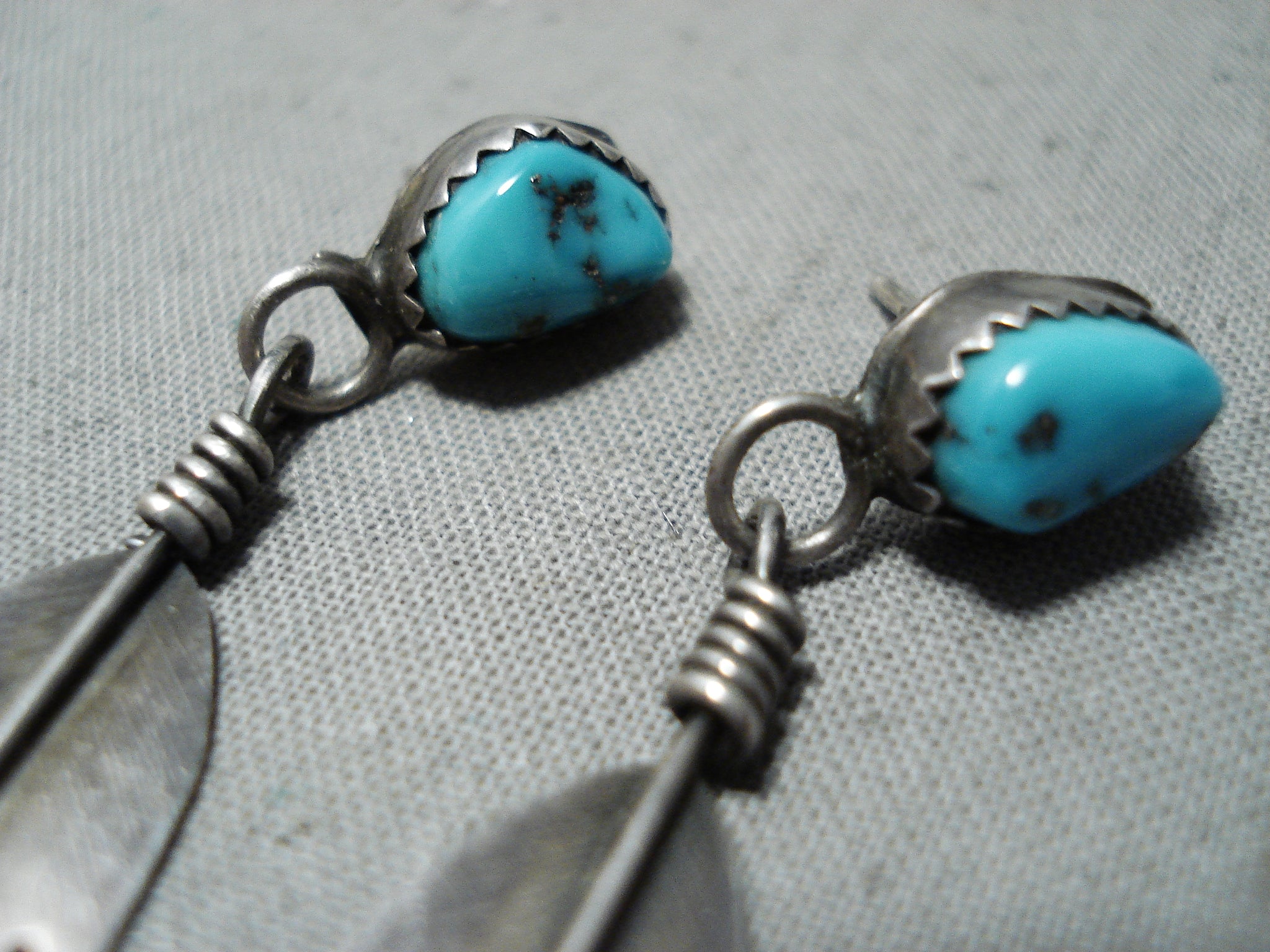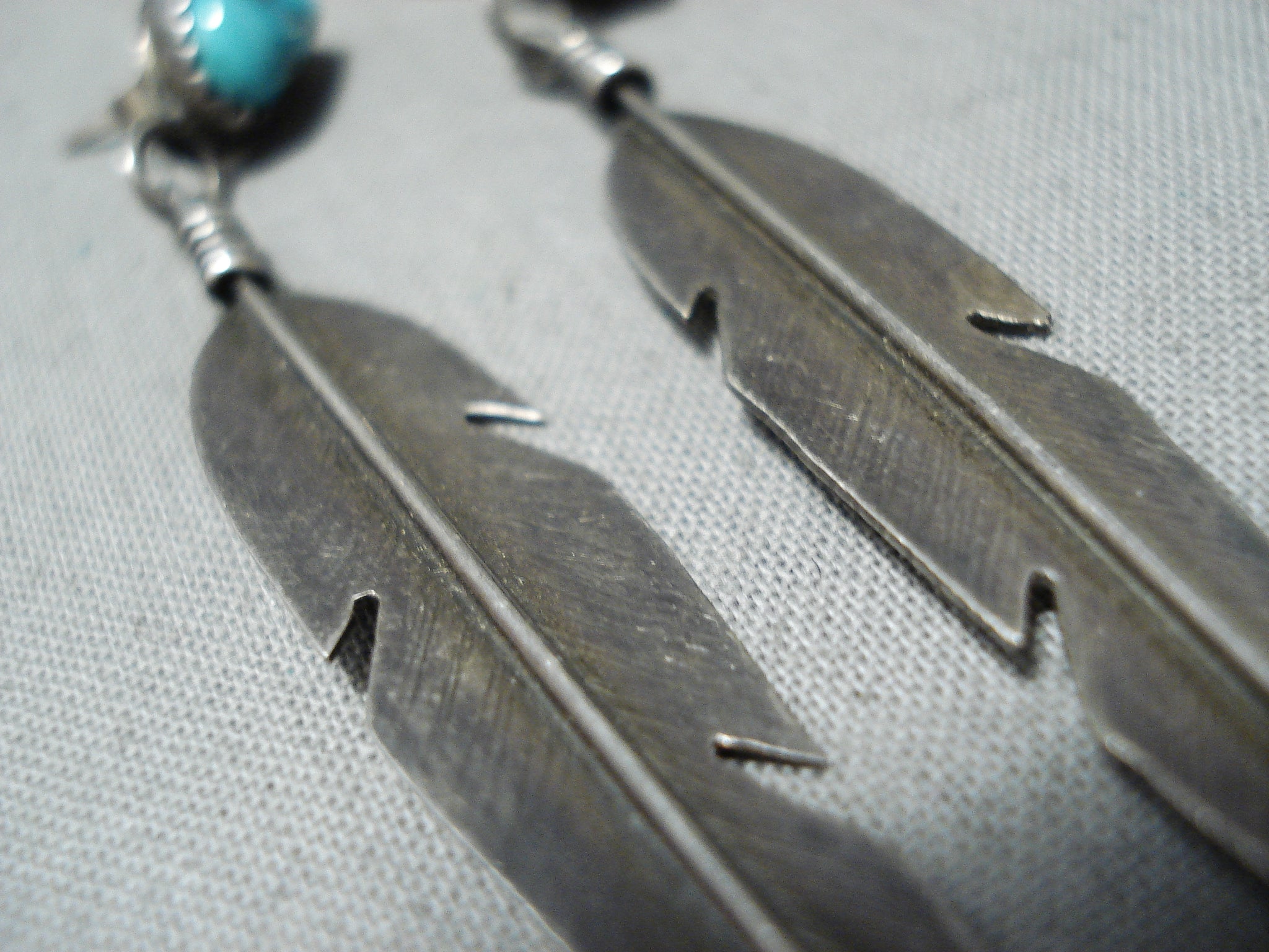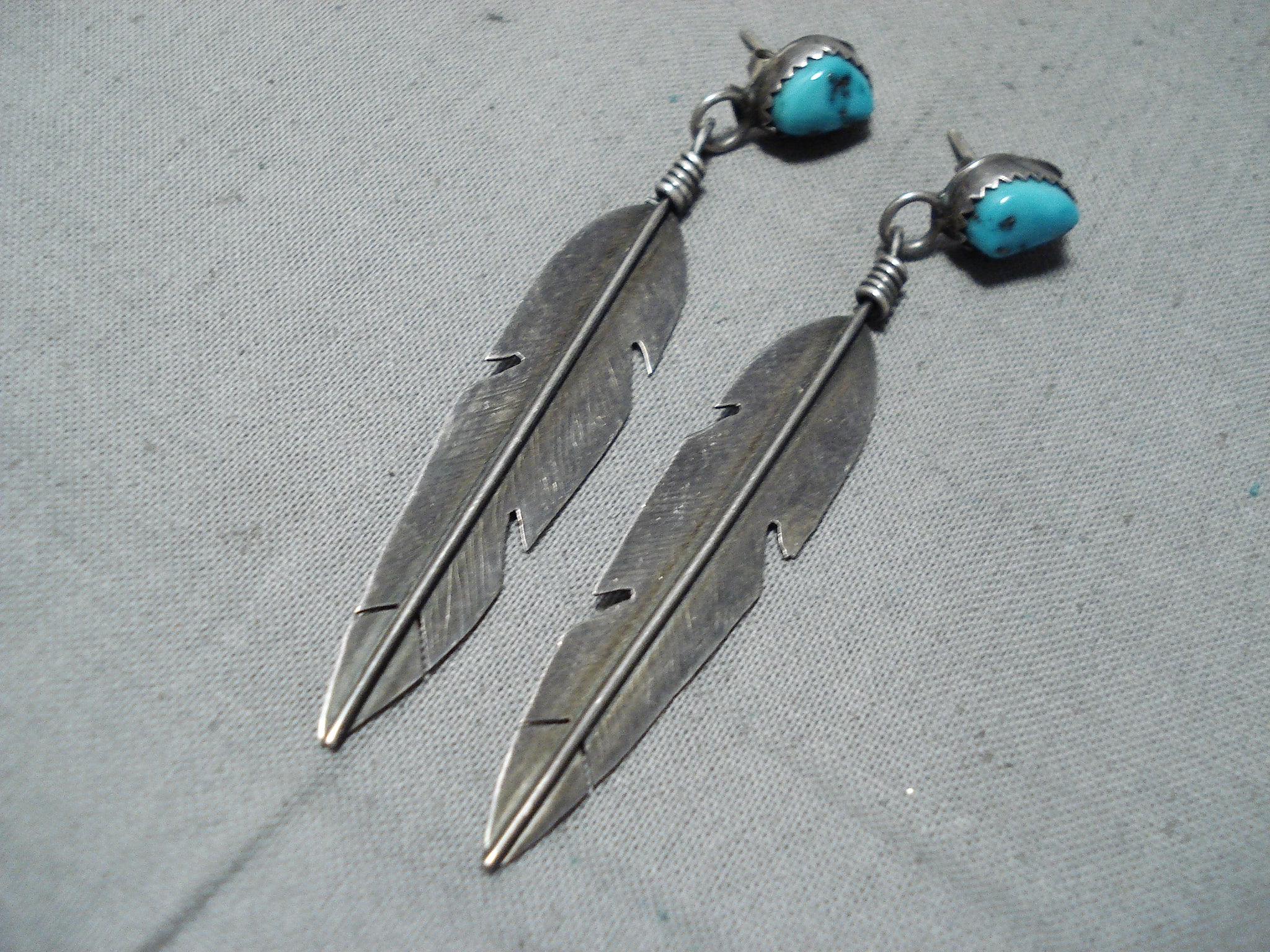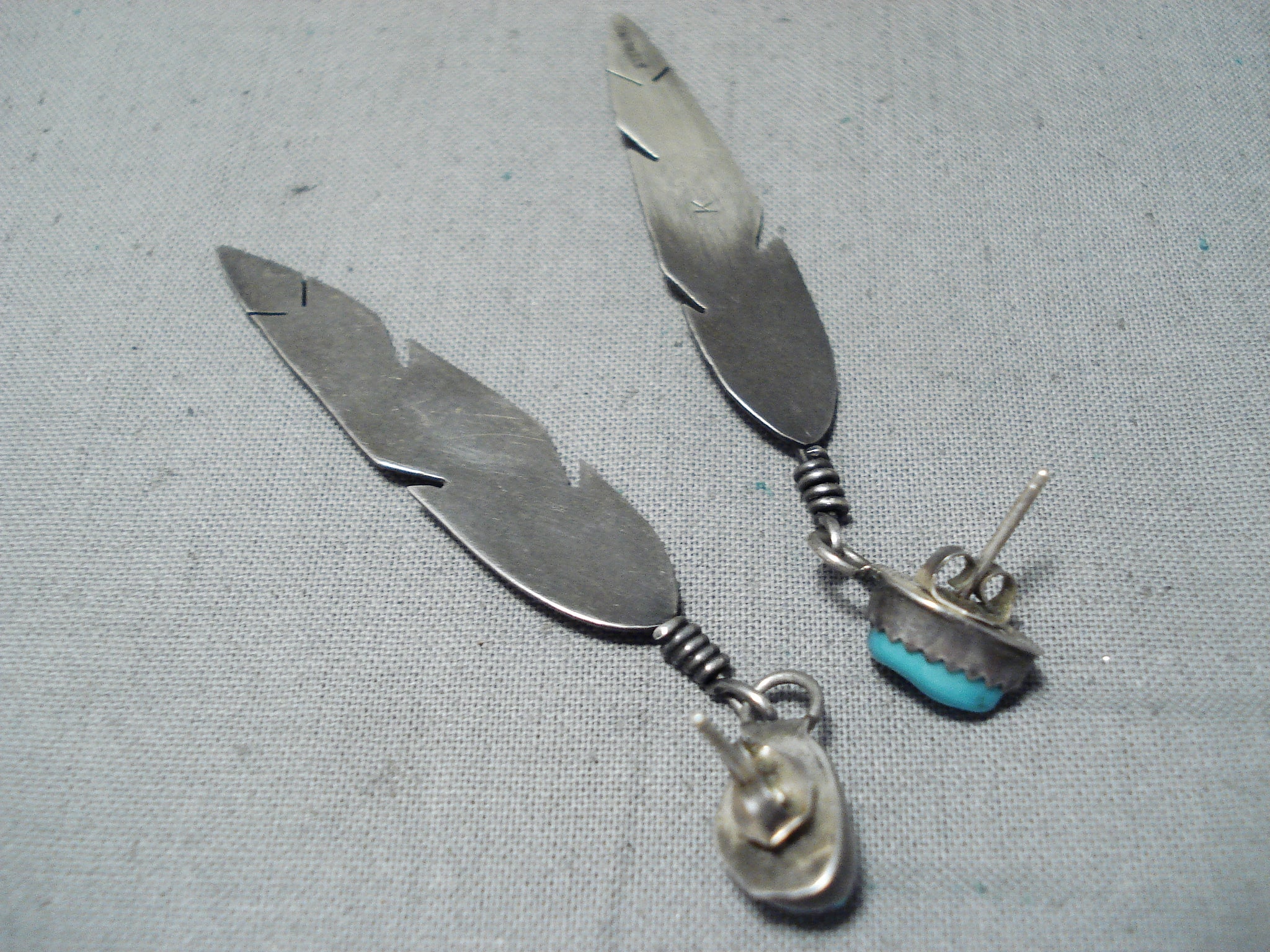 Custom Vintage Native American Navajo Sleeping Beauty Turquoise Sterling Silver Feather Earrings