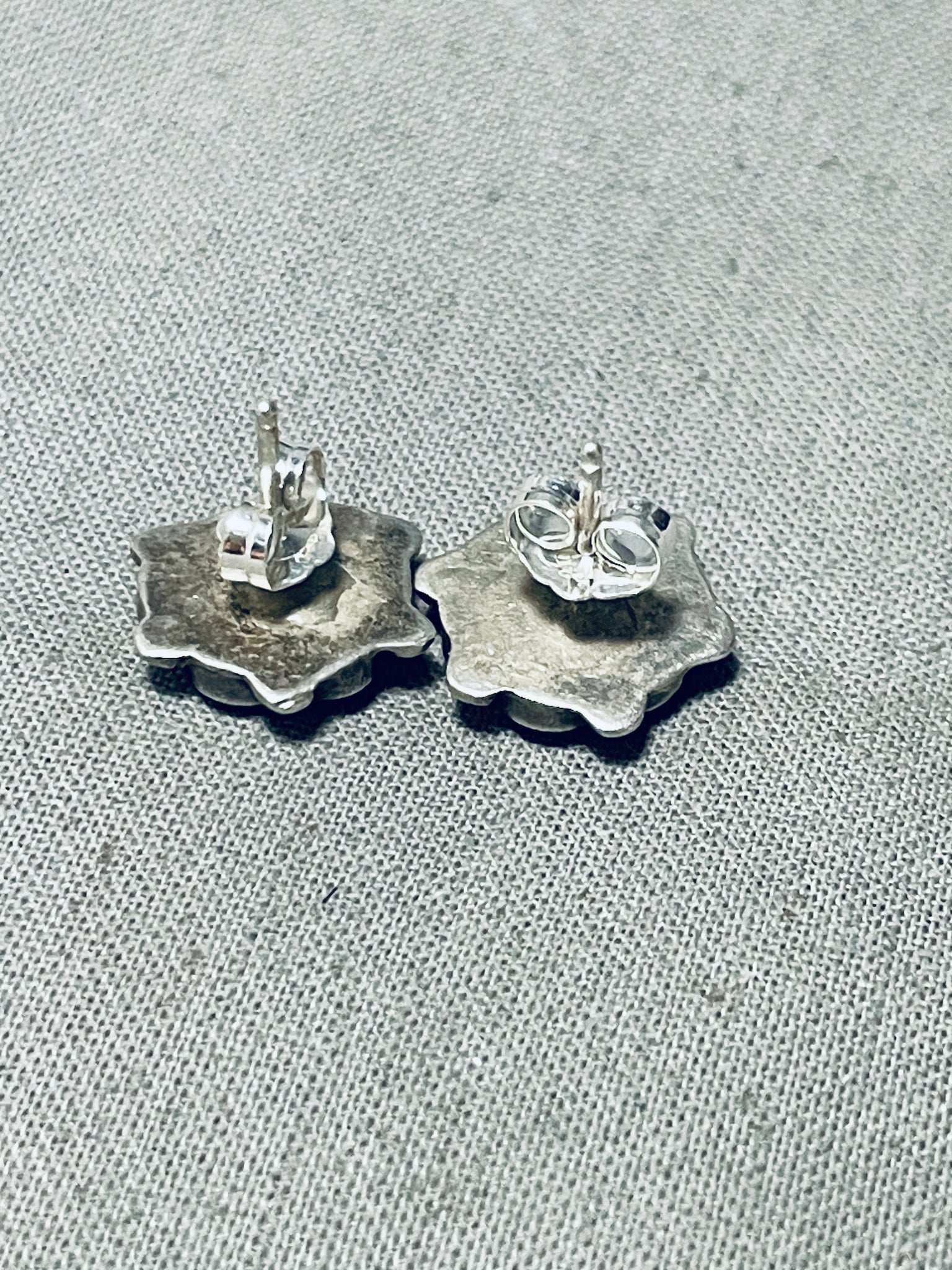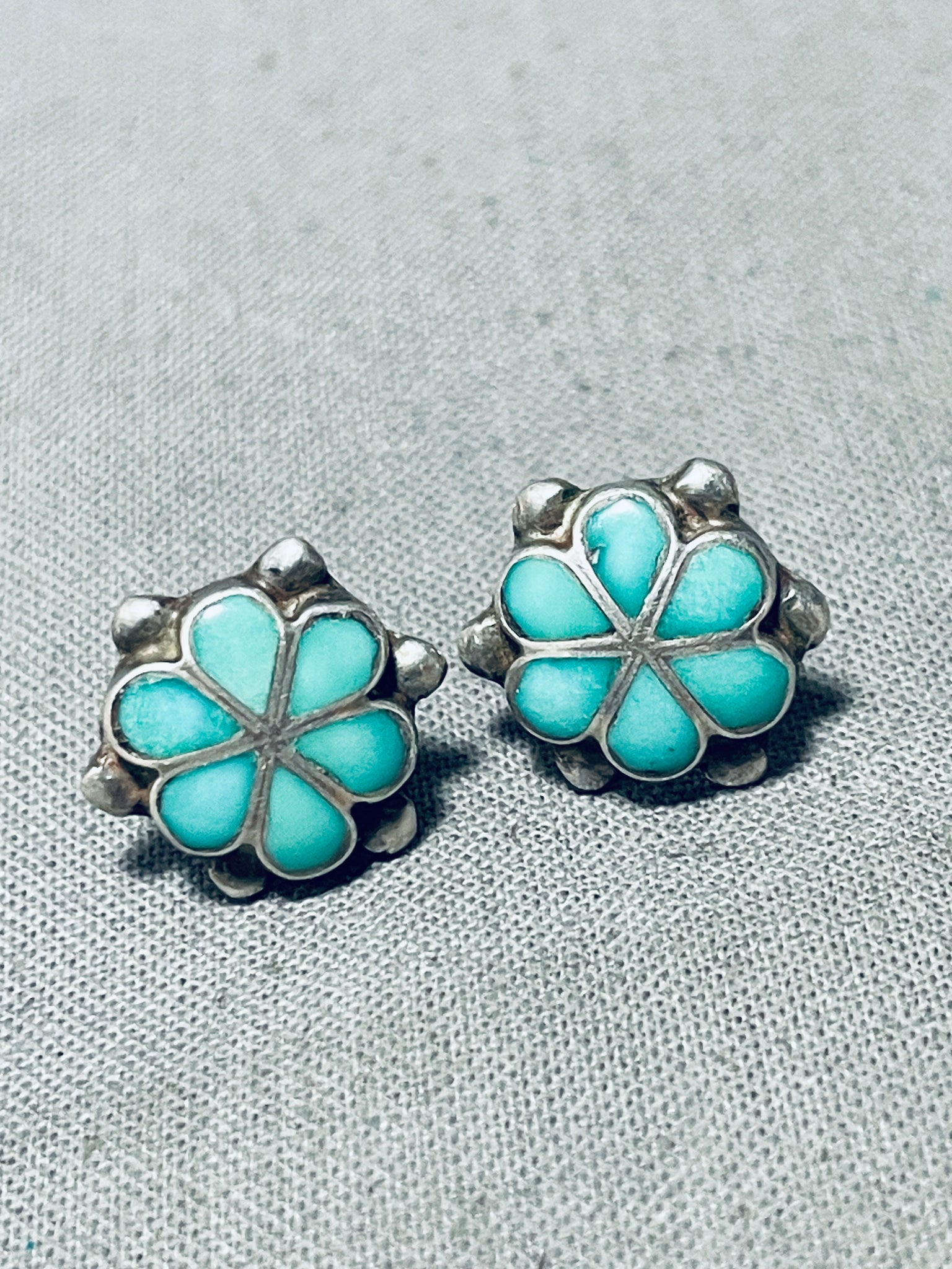 Cute Vintage Native American Zuni Blue Gem Turquoise Sterling Silver Flower Earrings