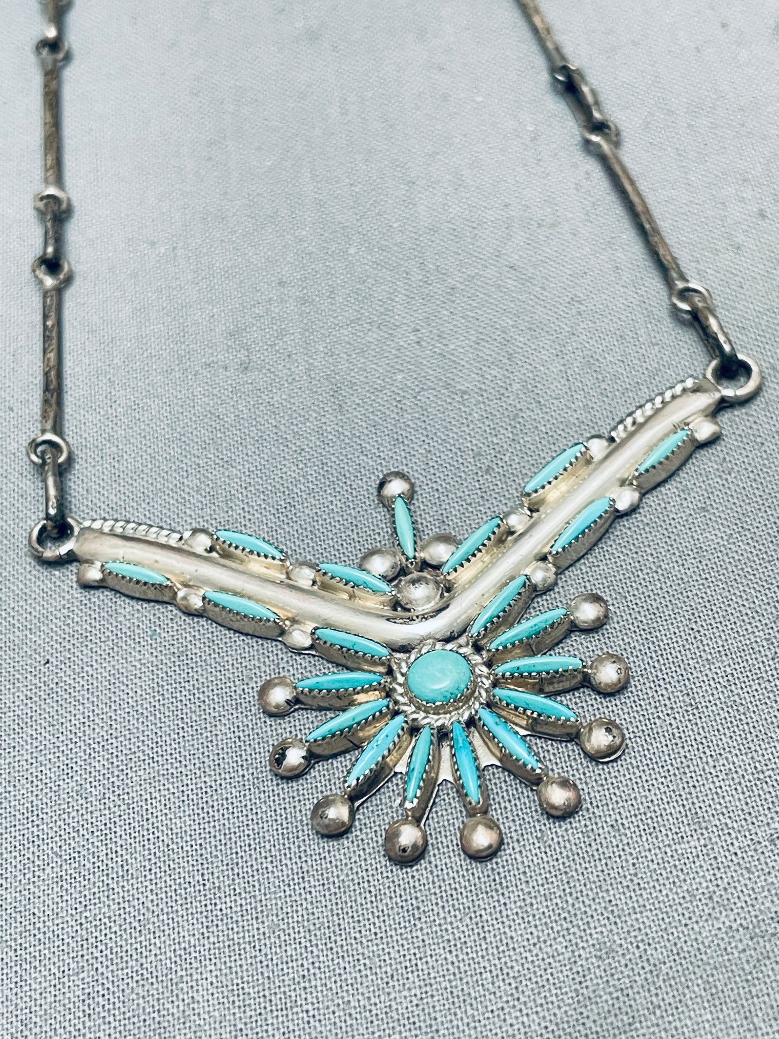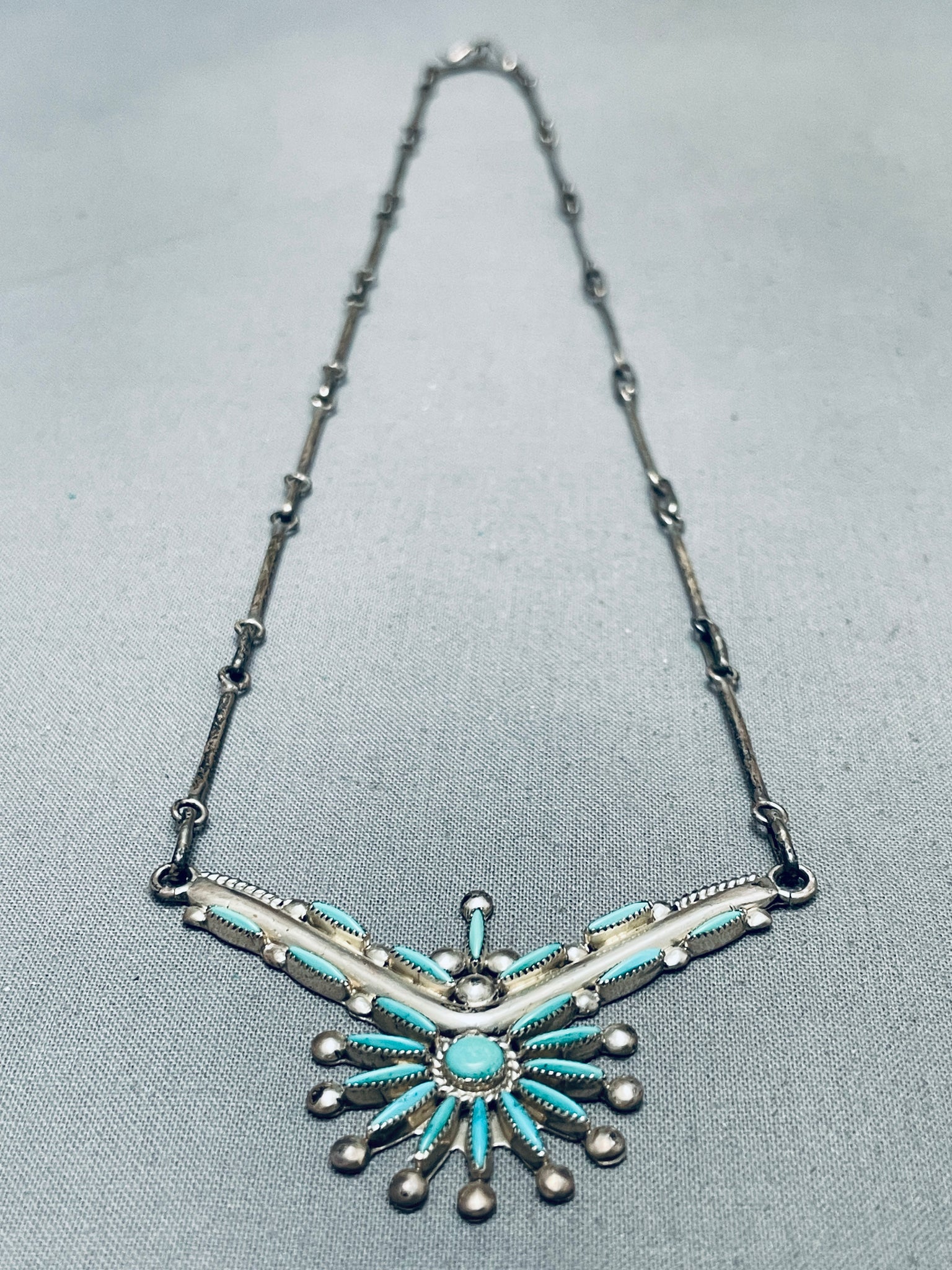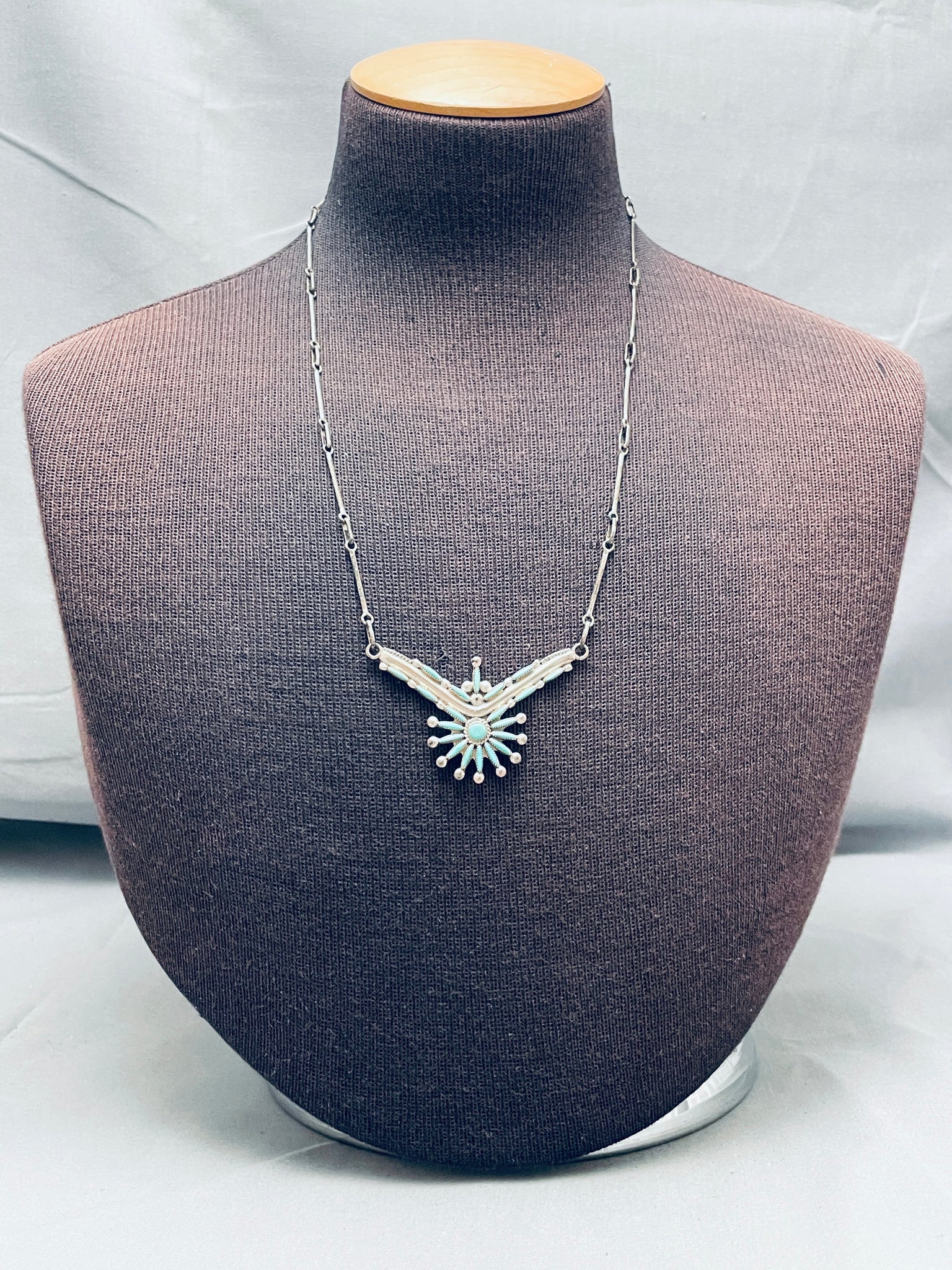 Cute Vintage Native American Zuni Needle Turquoise Sterling Silver Necklace Old