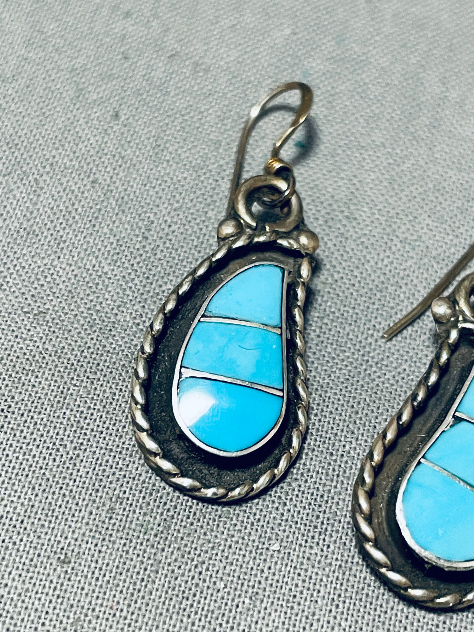 Cute Waterdrop Vintage Native American Zuni Turquoise Sterling Silver Inlay Earrings