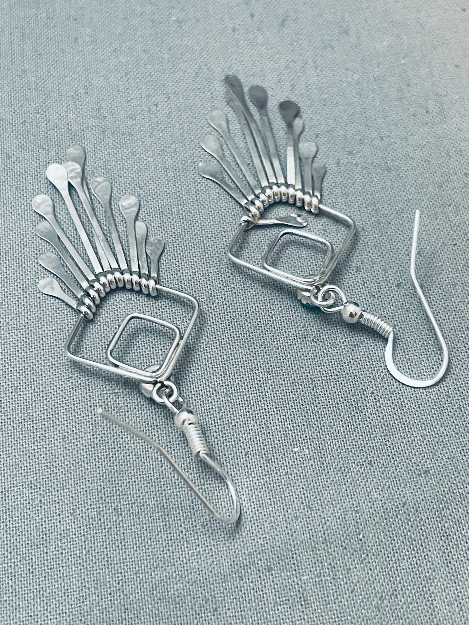 This is a striking vintage Zuni pair of silver earrings. This pair of earrings consist of a single snake eye shaped turquoise stone. The majority of each earring contains beautiful silver works that consist of diamond shaped patterns with accenting dangling silver patterns. Each earring measures around 1-3/4" X 3/4". Sterling silver. Cir. 1970's+. The earrings weigh around 2 grams.