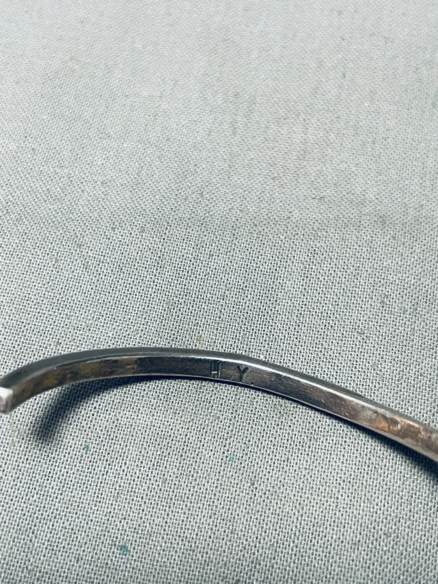Turquoise from the Lone Mountain mine is considered quite valuable and is prized by collectors and jewelry enthusiasts. The mine has a long history of producing turquoise, and its material has been used in Native American jewelry, as well as in contemporary and traditional jewelry designs. The center stone measures around 1/2" x 1/4". The width of the bracelet measures around 1/8". Signed by Navajo artist, Harrison Yazzie . Sterling silver. Cir. 1970's+. The inside end to end measures around 5-1/4" with an additional 1" gap. Sturdy 15 grams.