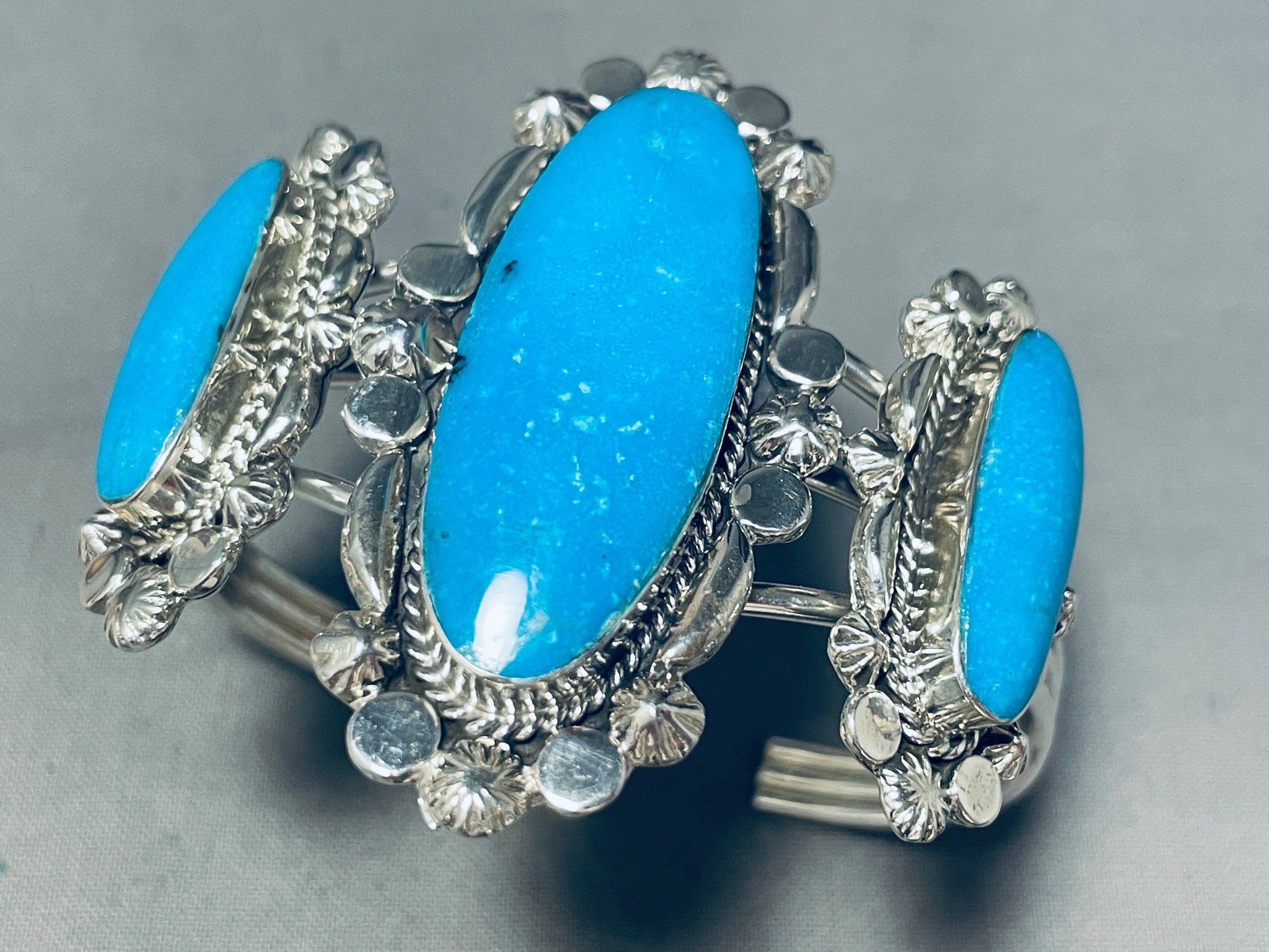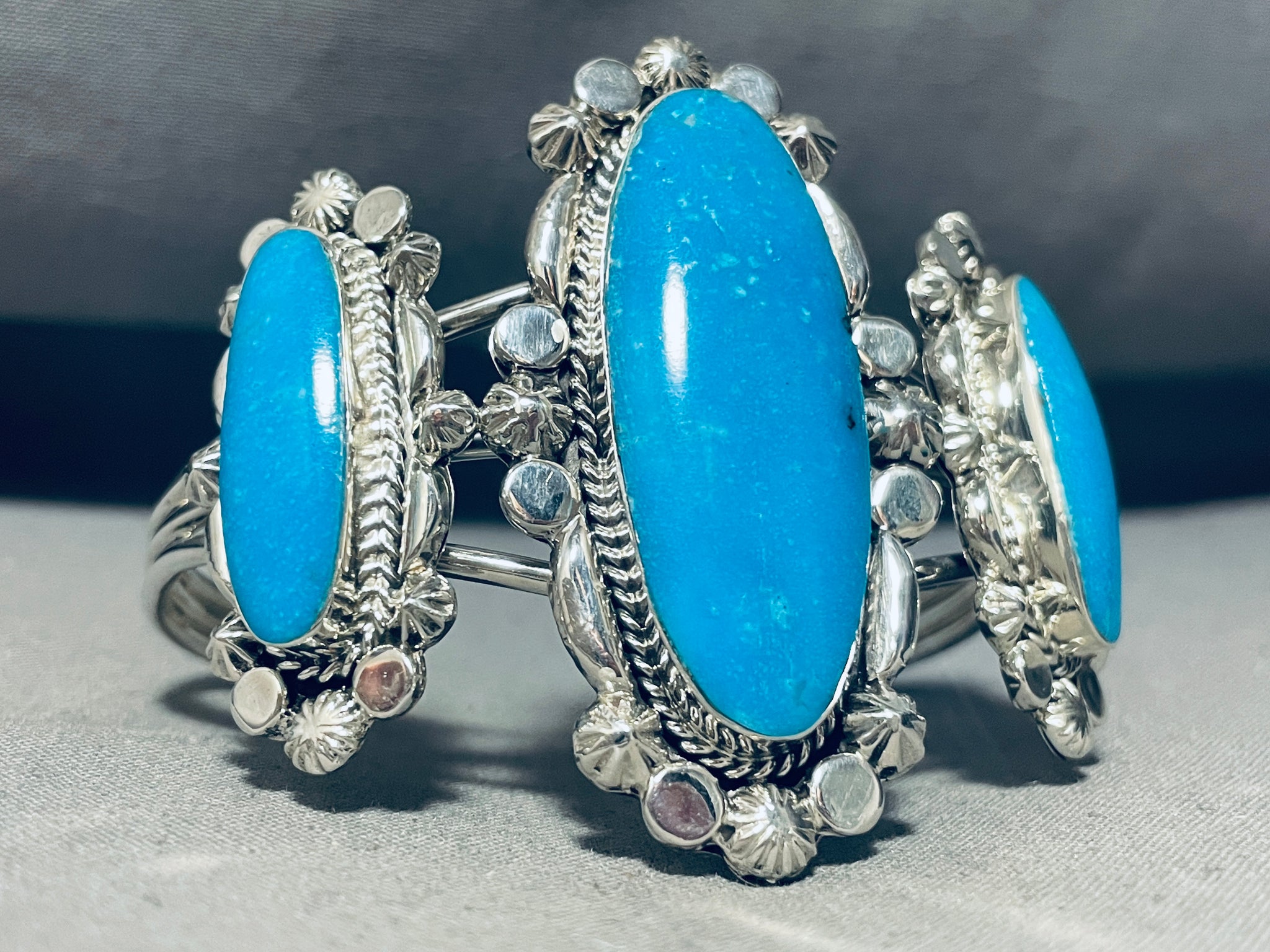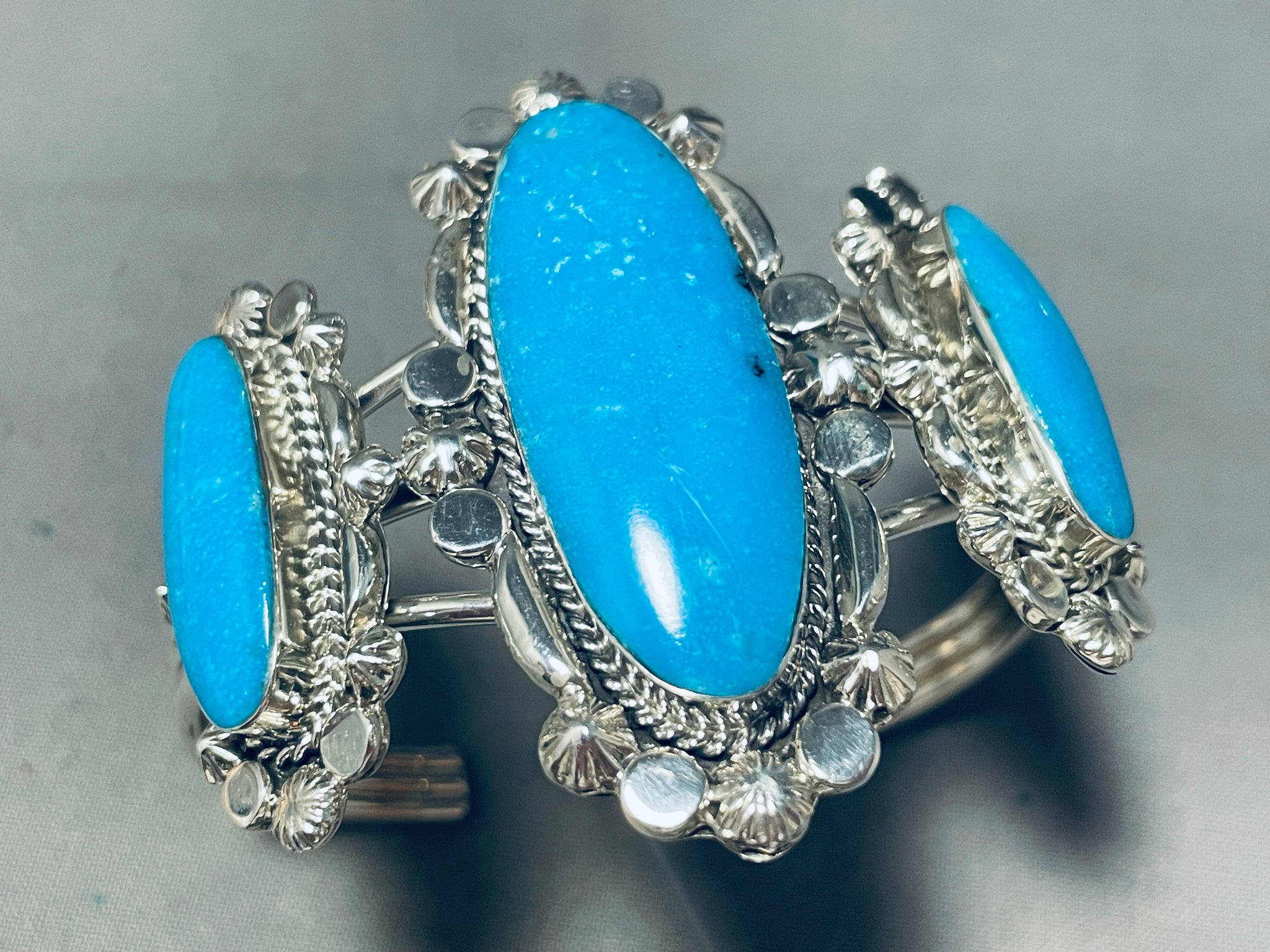 This is a wonderful Southwestern turquoise silver bracelet. This incredible bracelet contains three large Sleeping Beauty turquoise stones that graduate in size towards the center. Surrounding the stones are impeccable silver works that consist of ropes, shells, flattened silver raindrops and repoussed shells. The intricacy is absolutely mind blowing. The bracelet contains a wonderful sturdy and thick rounded triple silver shank cuff that graduates in width towards the center. The height at the center of the bracelet measures around 2-1/8" while the width at the center of the triple silver shank cuff measures around 1". The center stone measures around 1-5/8" x 5/8". Signed by artist, Dave Lopez. Sterling silver, marked. The inside end to end measures around 5-1/2" with an additional 1" gap. Sturdy 49 grams.