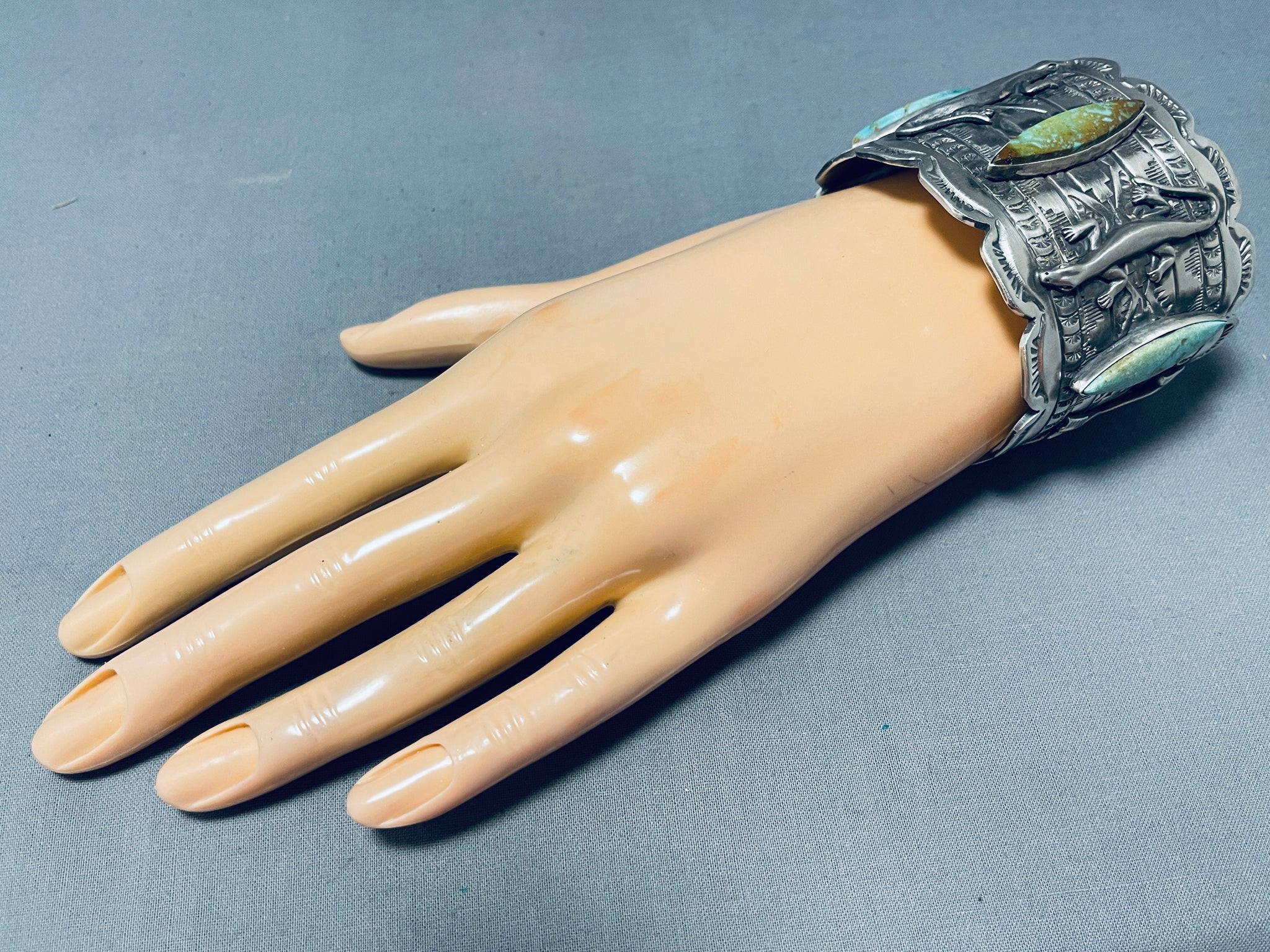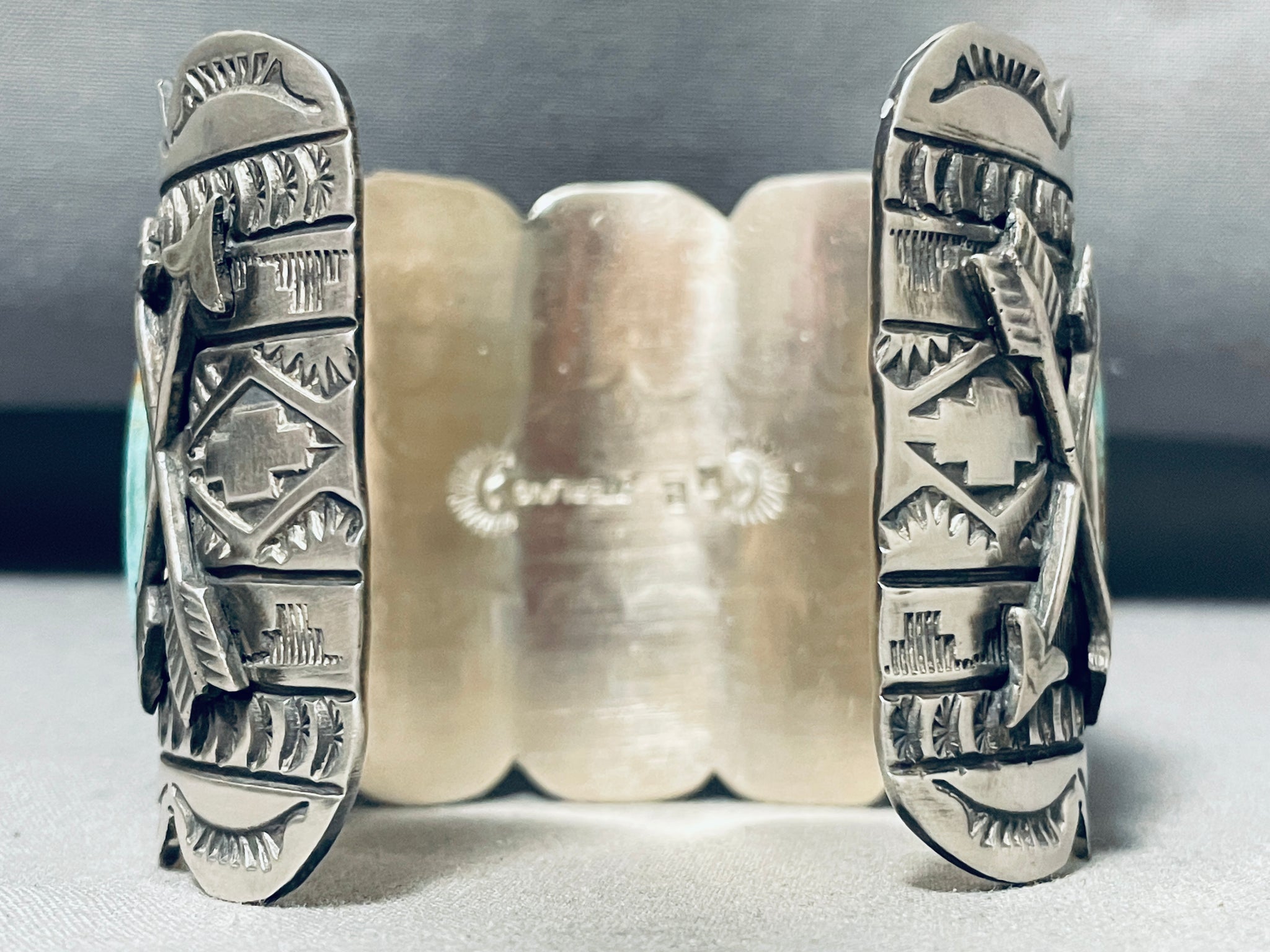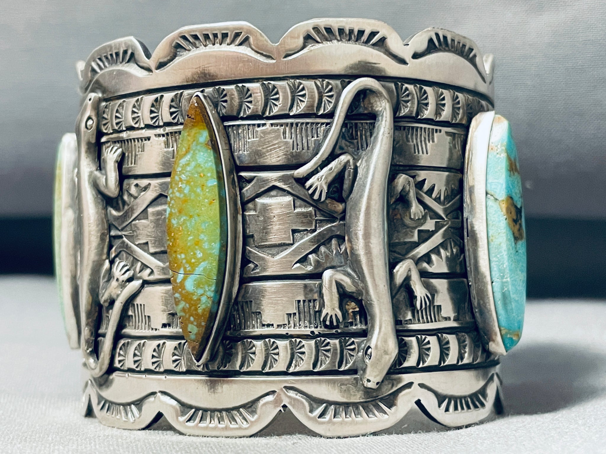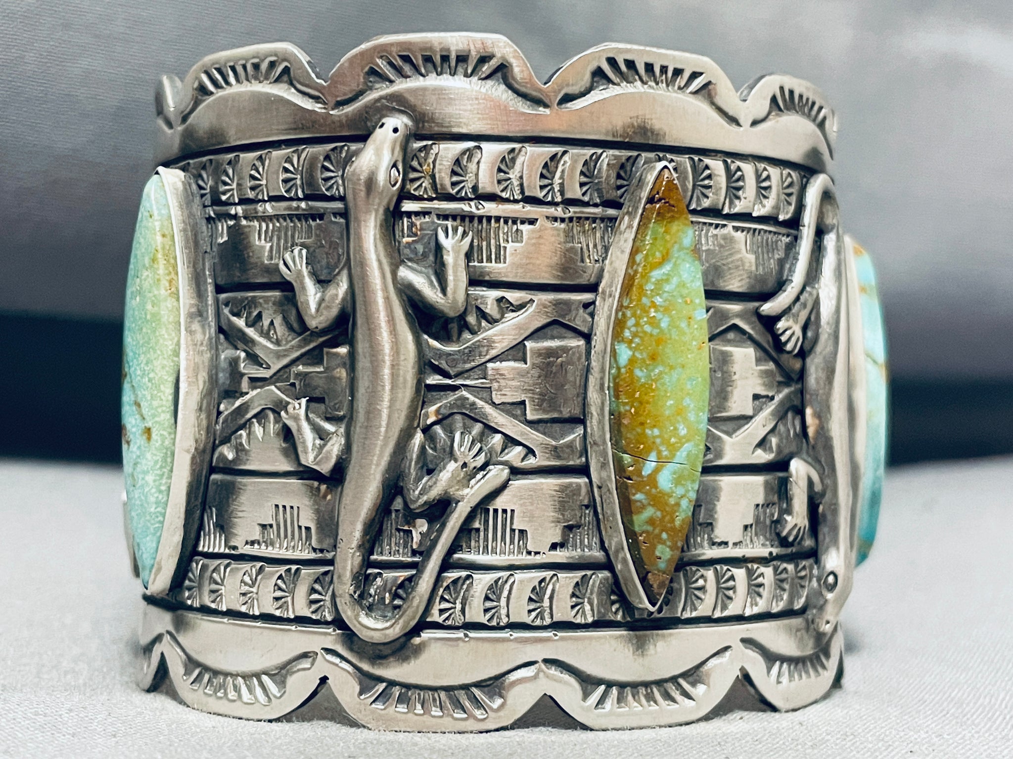 Dazzling Native American Navajo 3 Royston Turquoise 2 Sterling Silver Gekkos Huge Bracelet