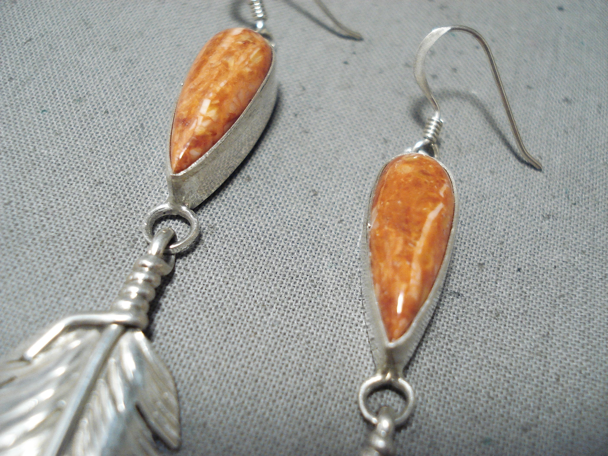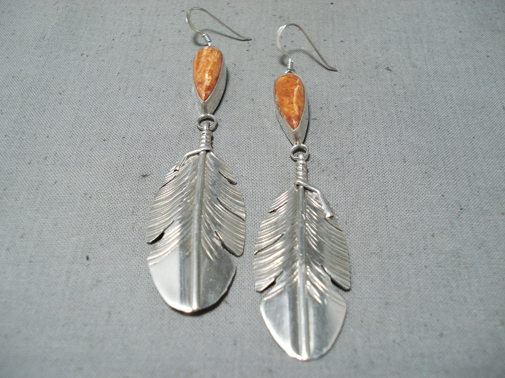 Dazzling Native American Navajo Spiny Oyster Shell Sterling Silver Feather Earrings