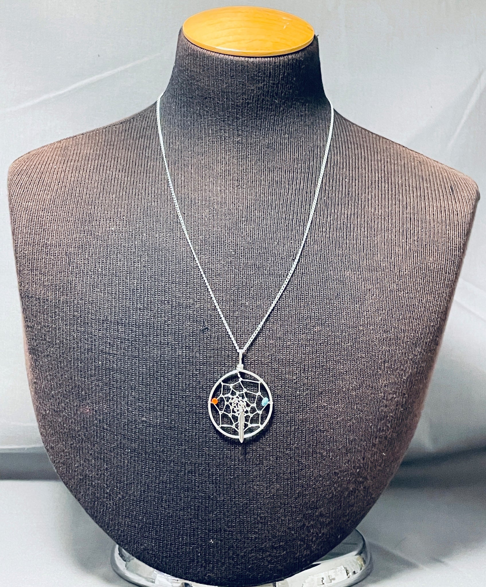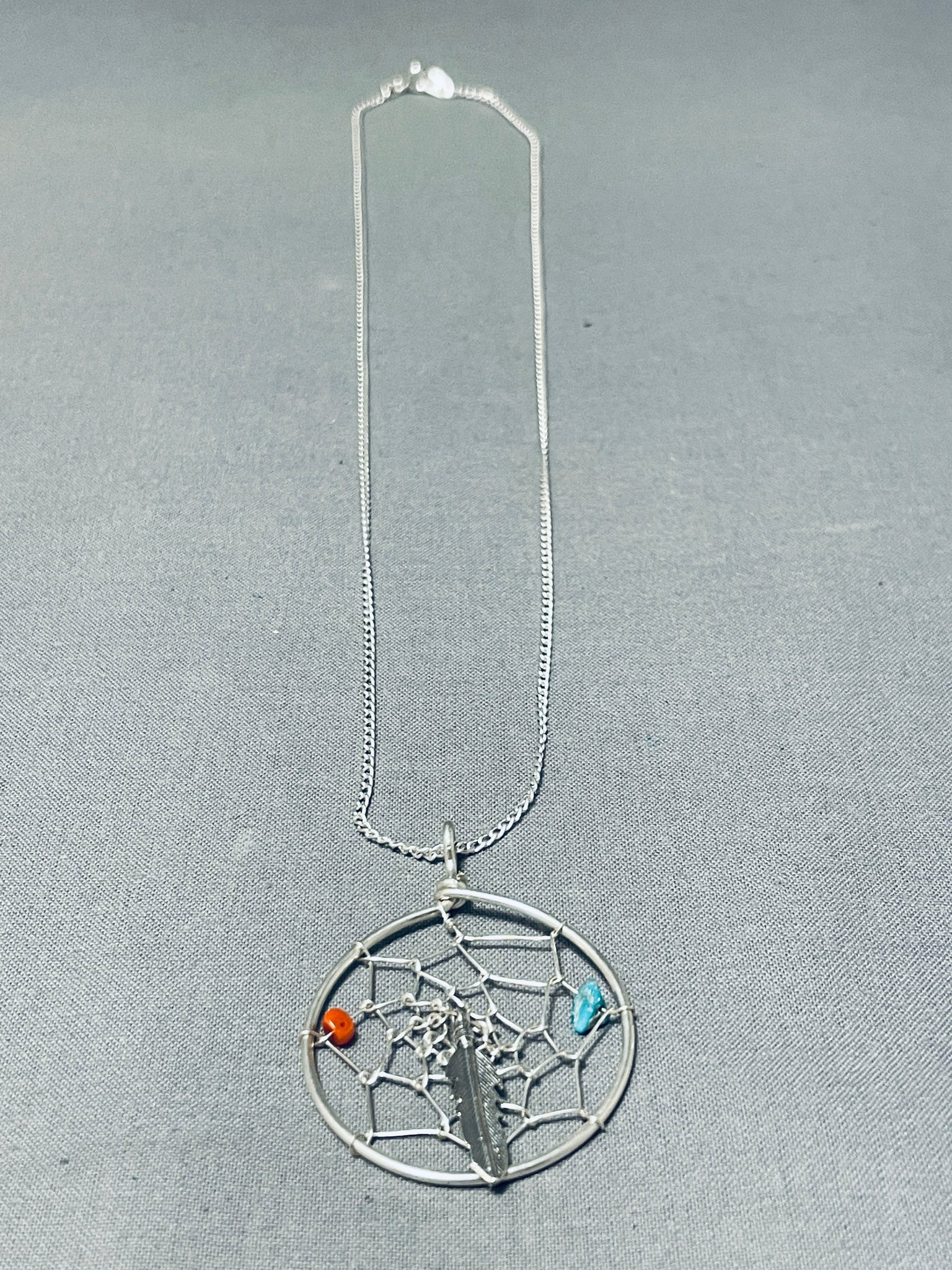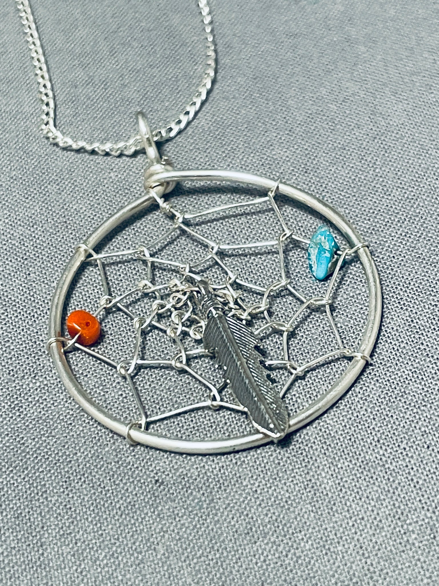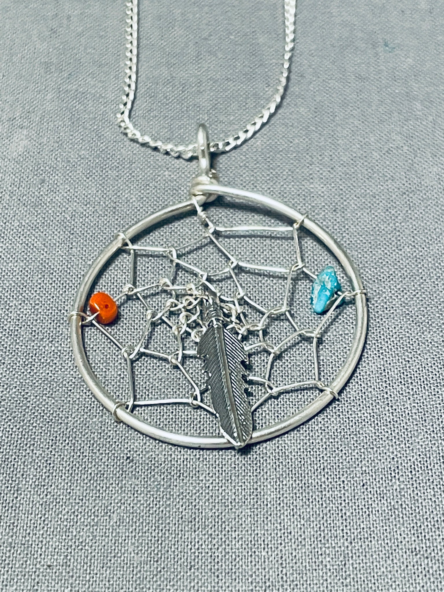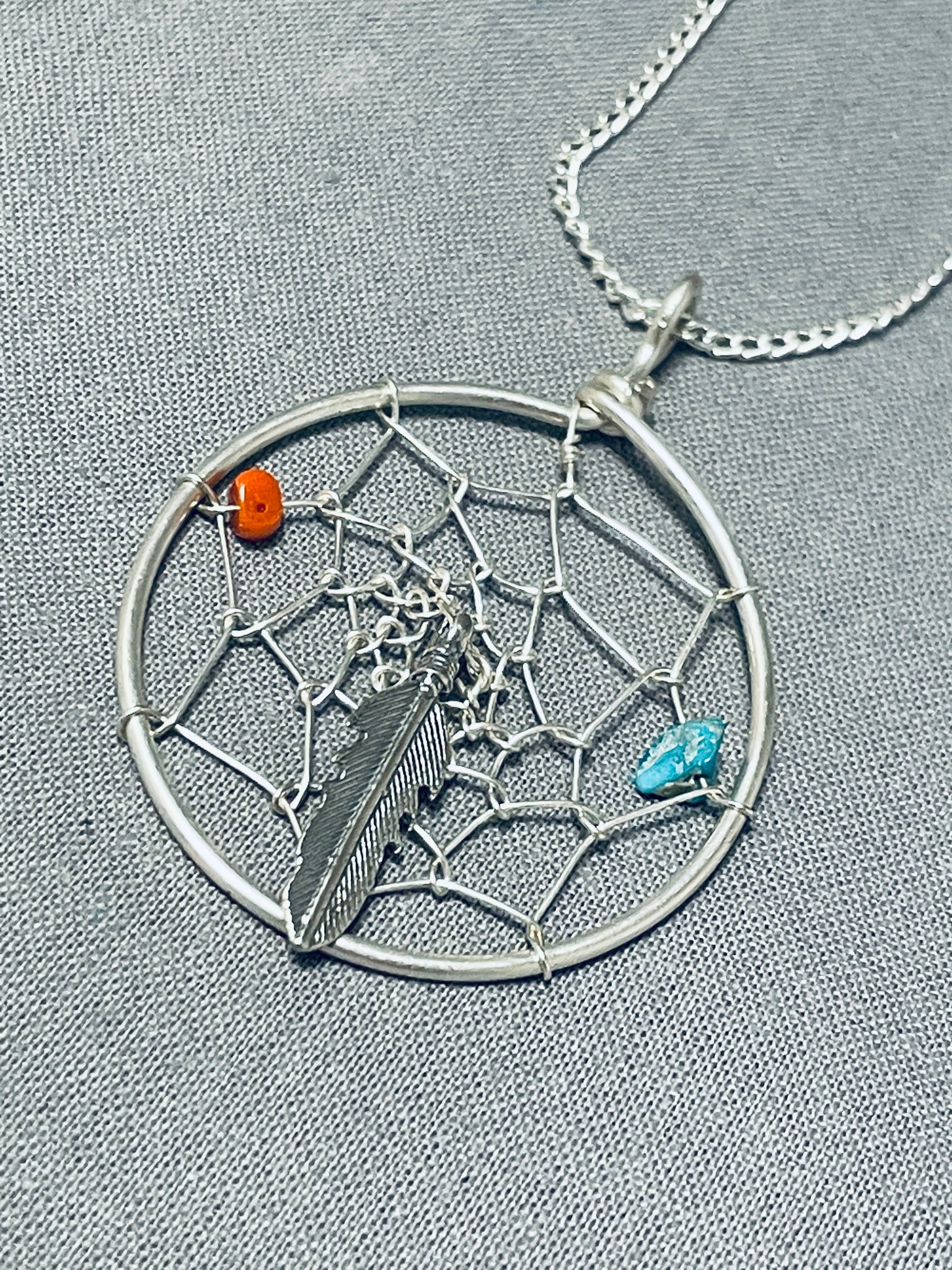 Dazzling Native American Navajo Turquoise Coral Sterling Silver Dreamcatcher Necklace