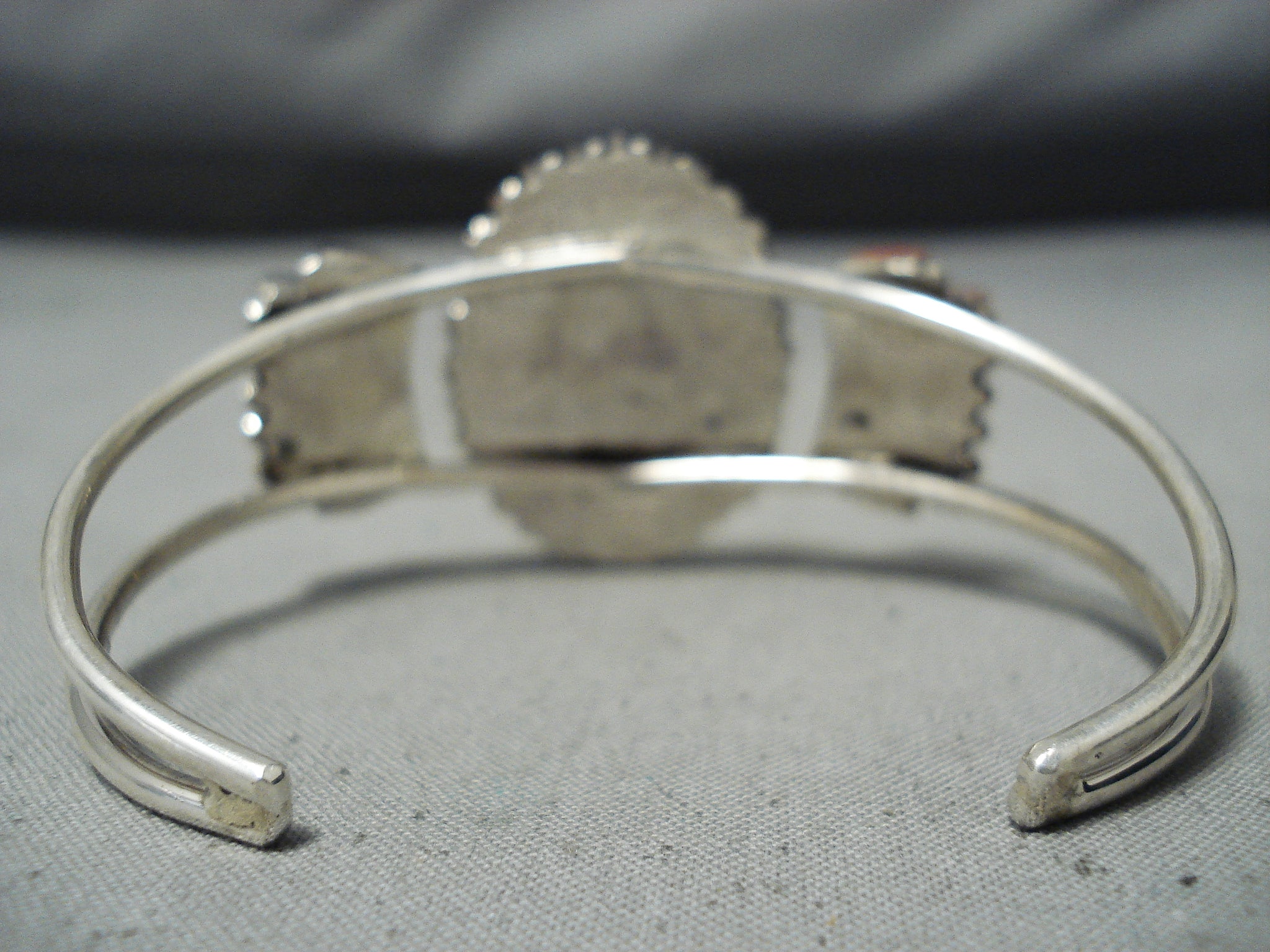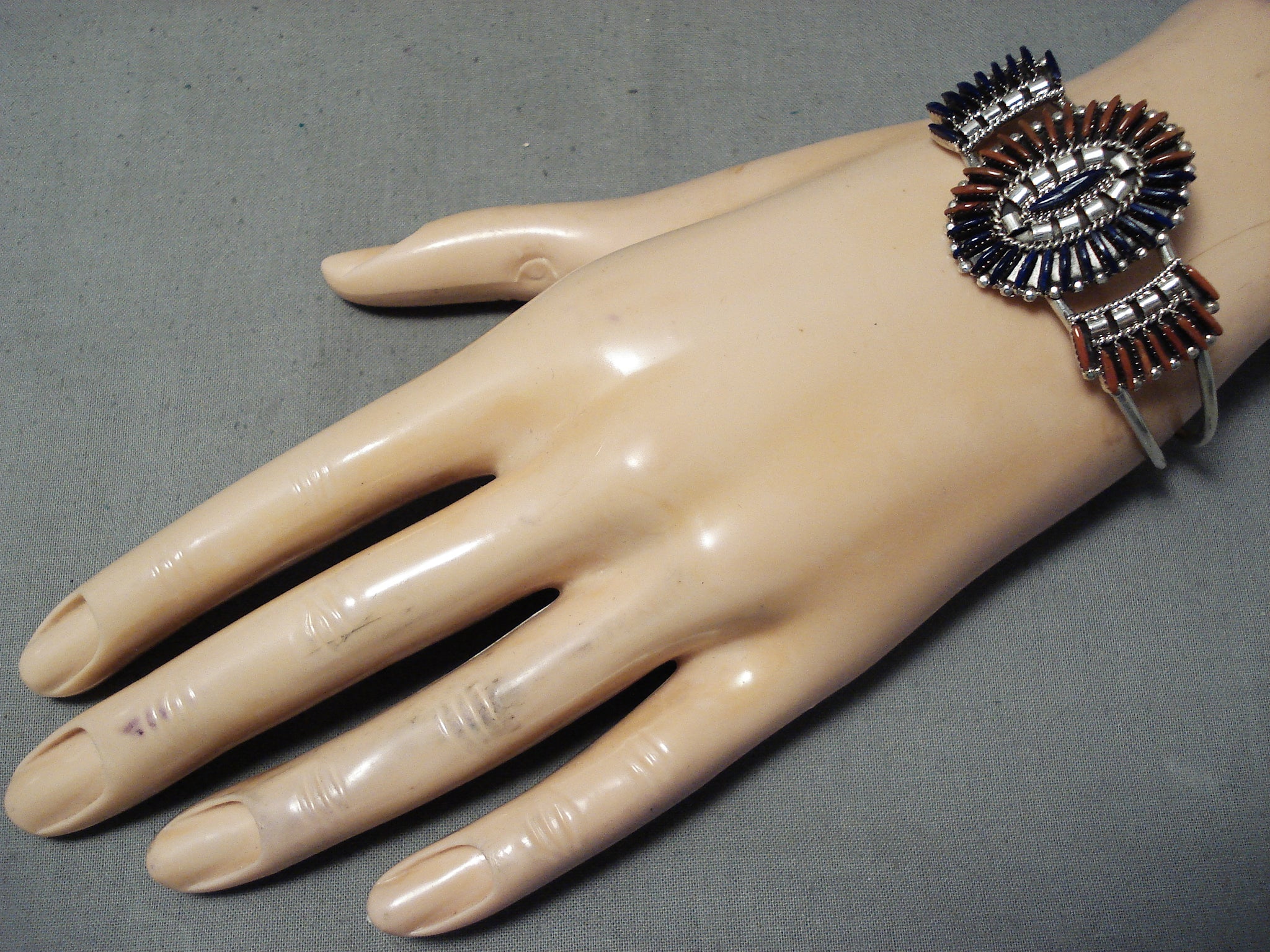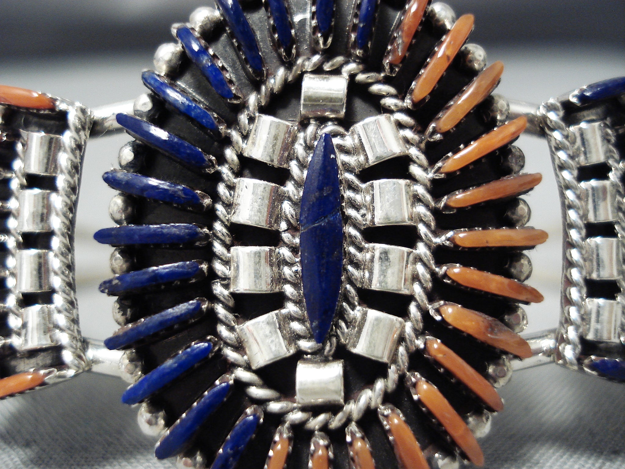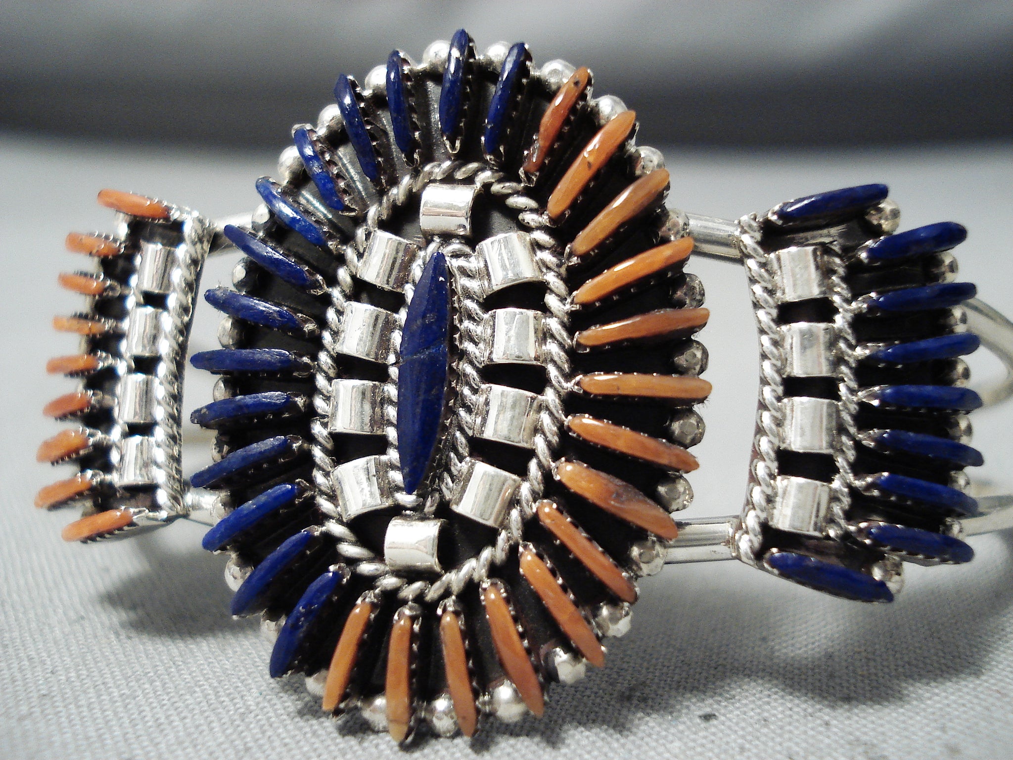 Dazzling Native American Zuni Lapis Coral Needlepoint Sterling Silver Bracelet