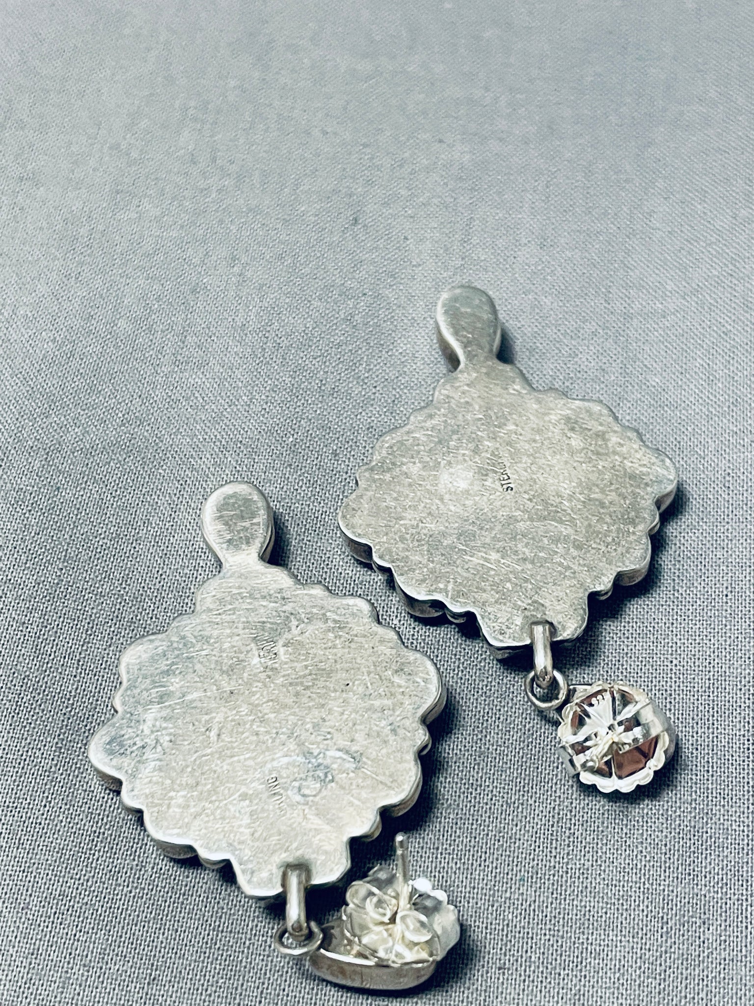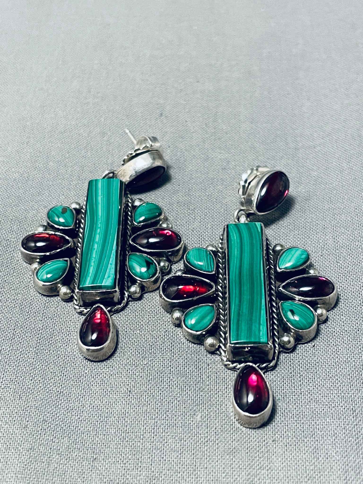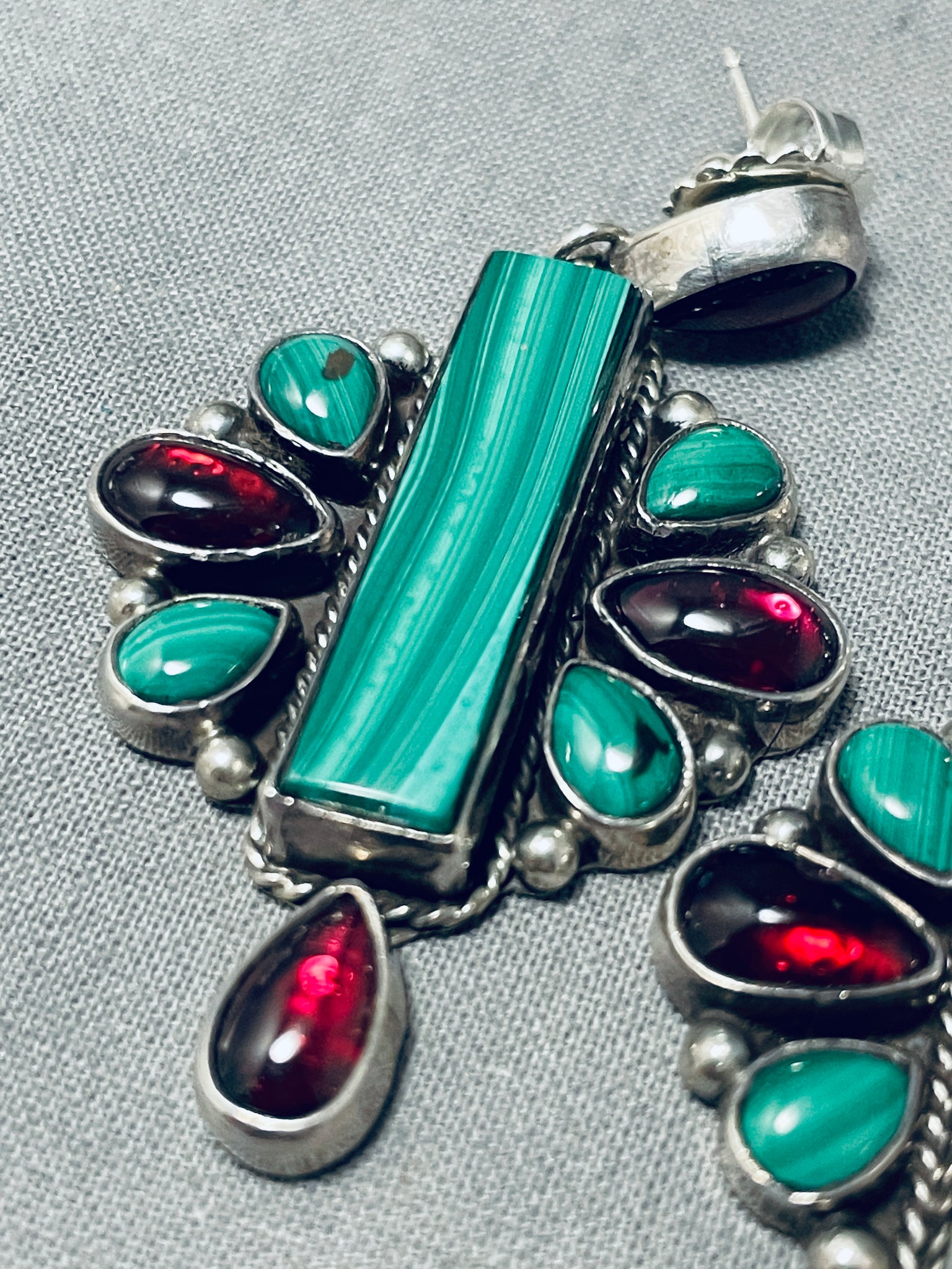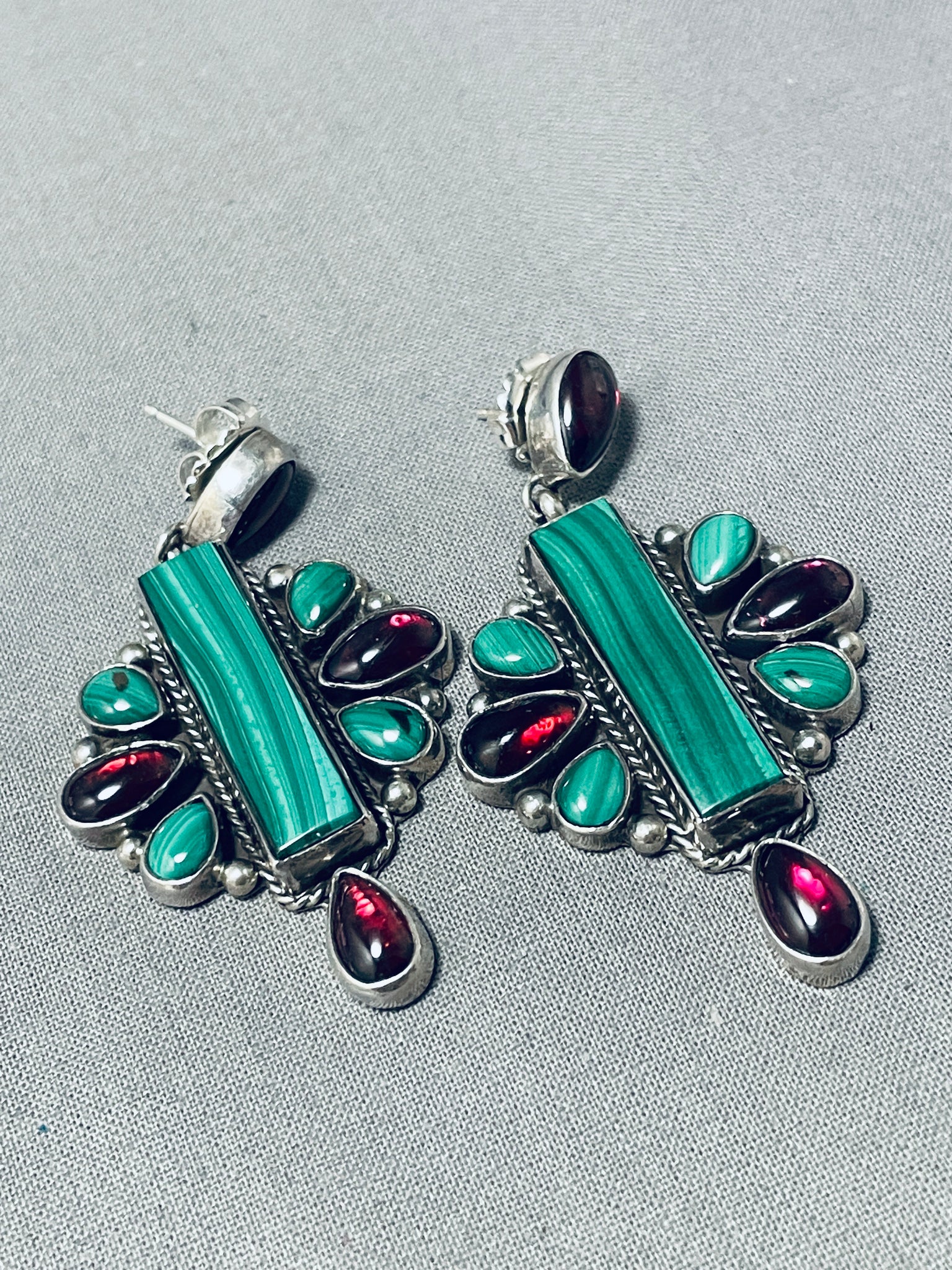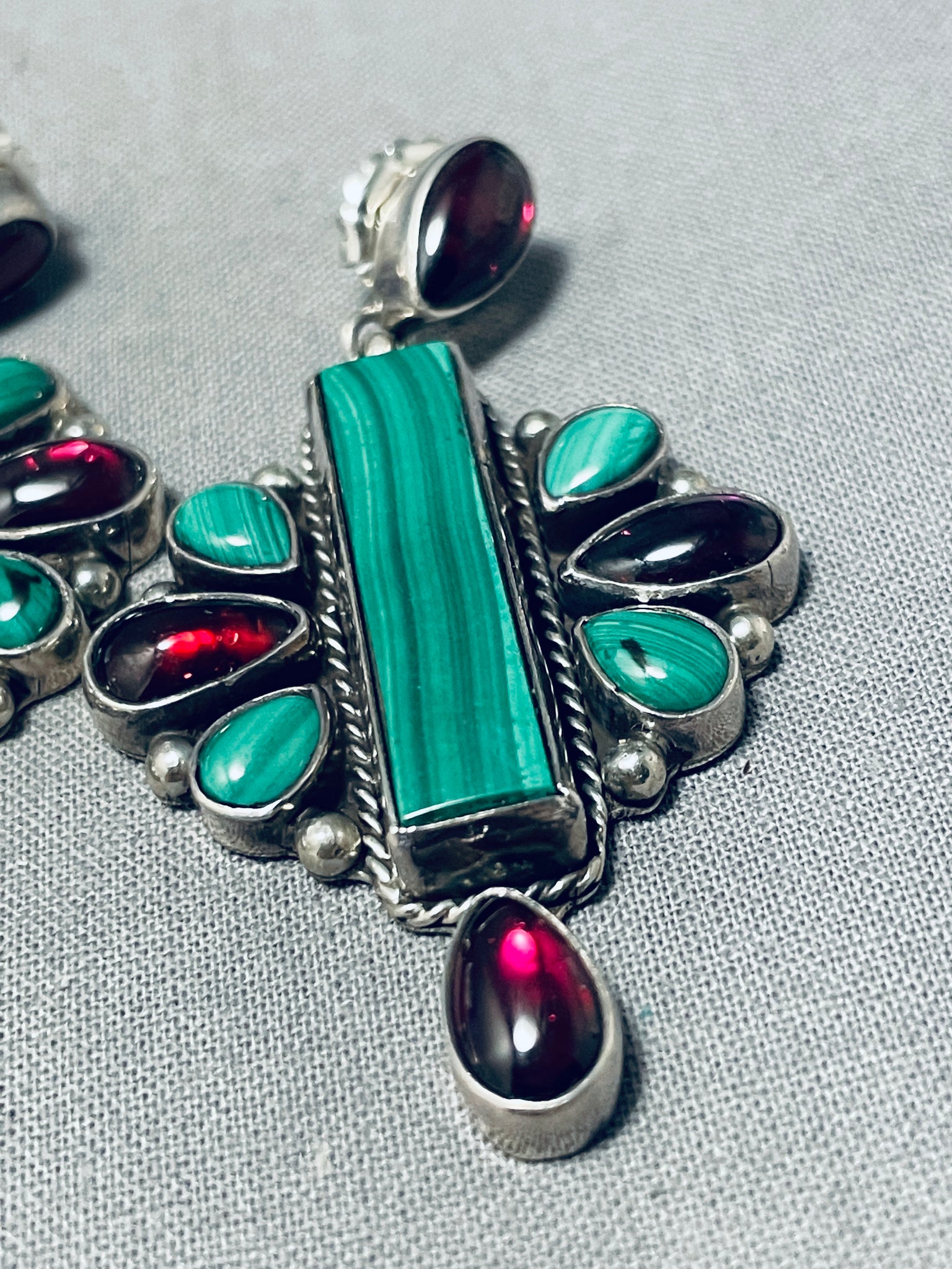 Dazzling Vintage Native American Navajo Garnet Malachite Sterling Silver Earrings