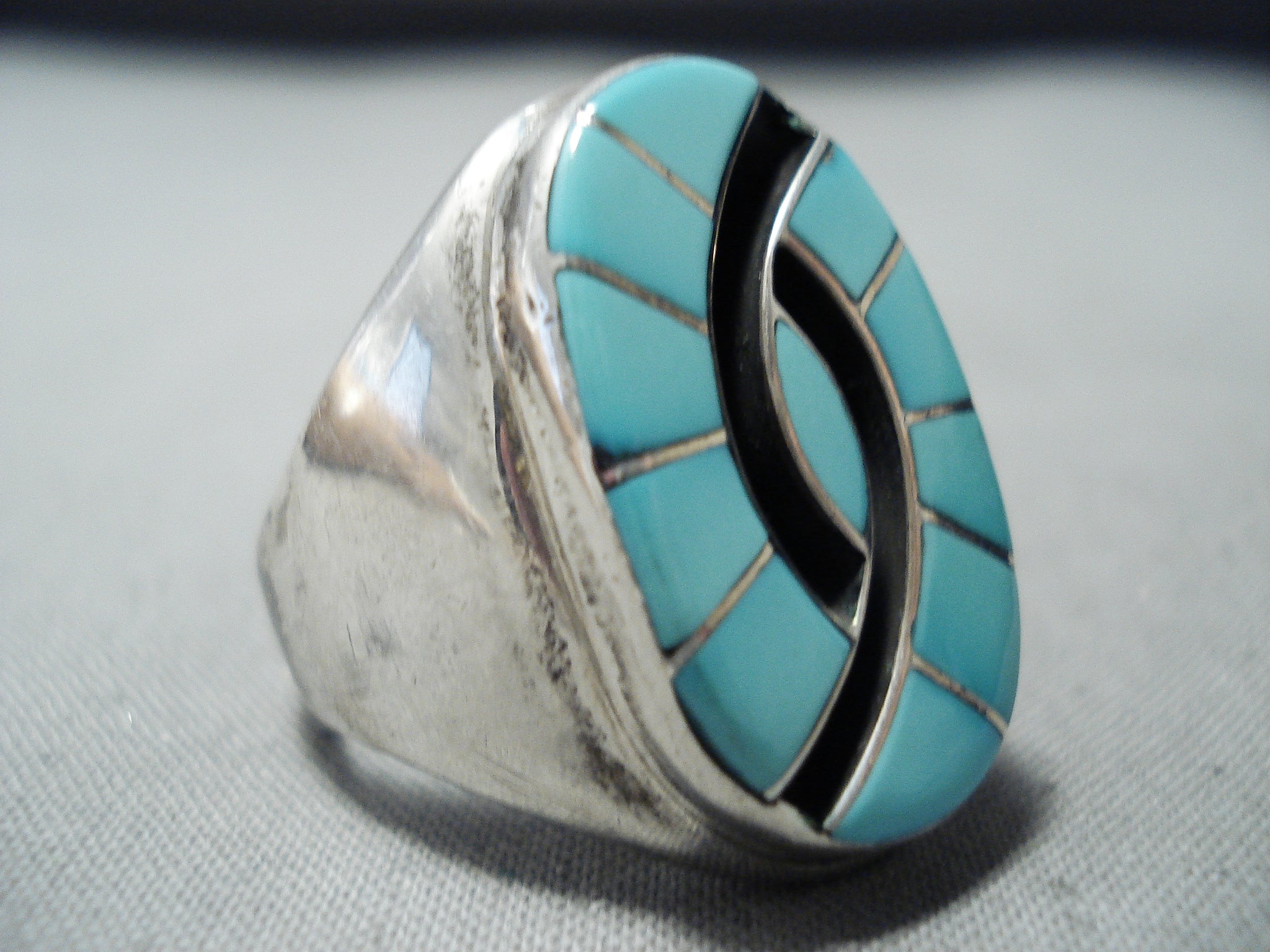 Dazzling Vintage Native American Zuni Blue Gem Turquoise Inlay Sterling Silver Ring