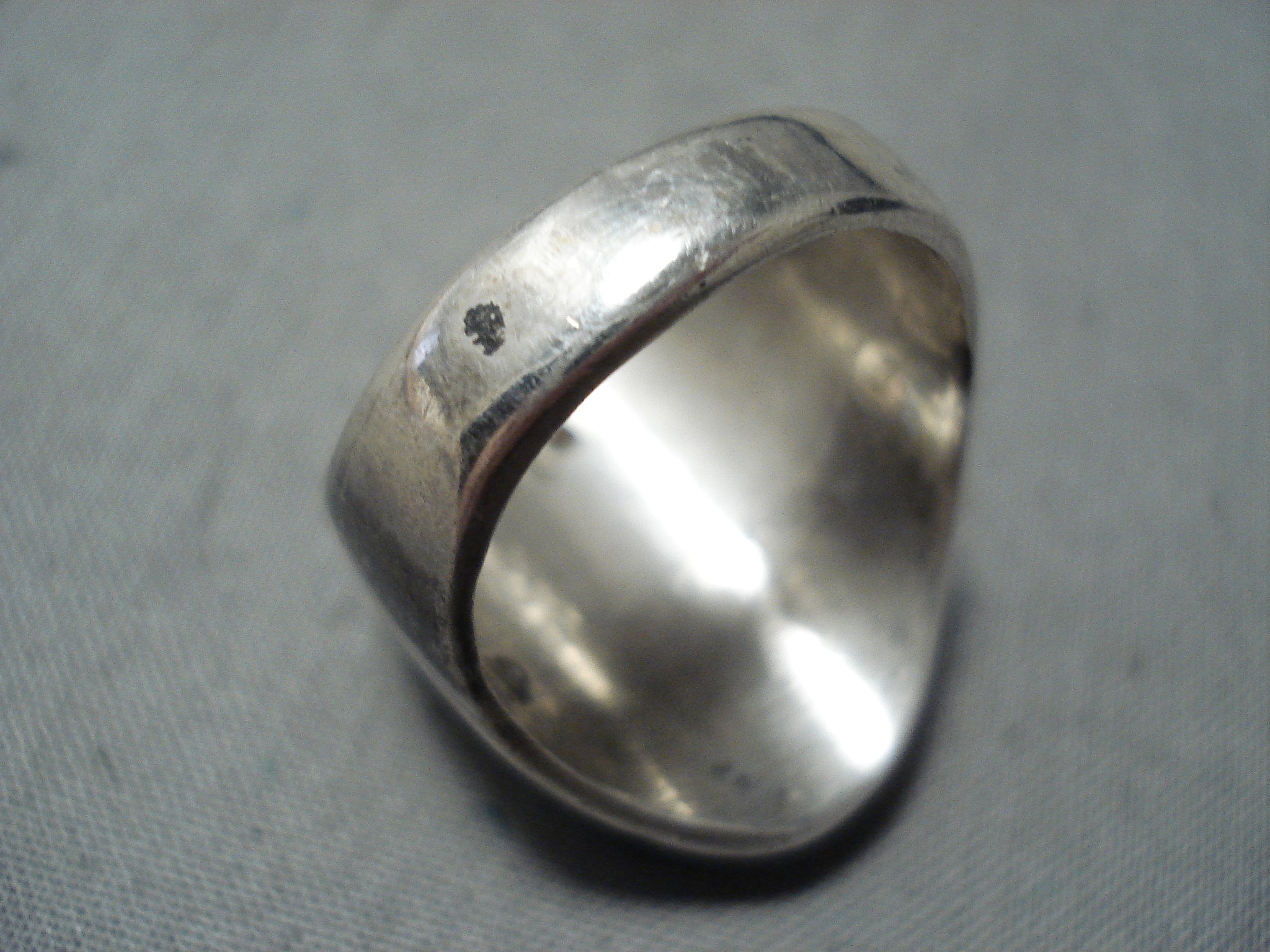 Up for sale is this marvelous vintage Zuni silver ring having Blue Gem turquoise inlay and deep silver handcarvings with a handcarved graduated solid silver band! Simply Stunning Piece! The ring face measures around 1" x 5/8". Signed by Zuni artist, E.B. The ring size is around 10. Sterling silver. Sturdy 20 grams.