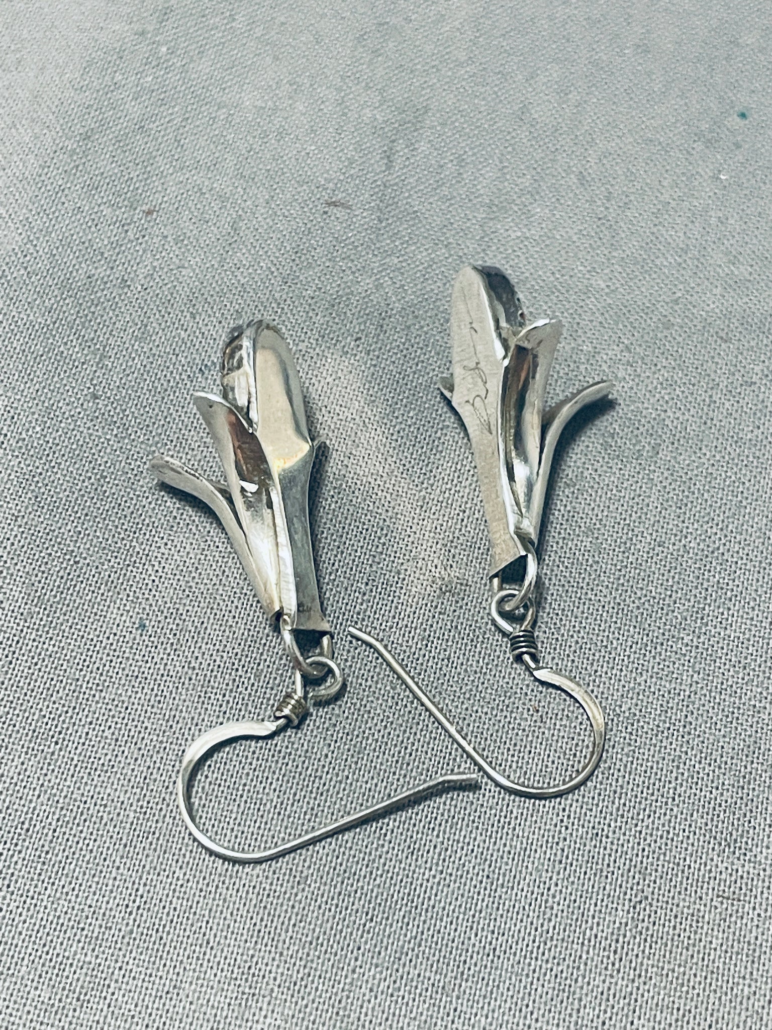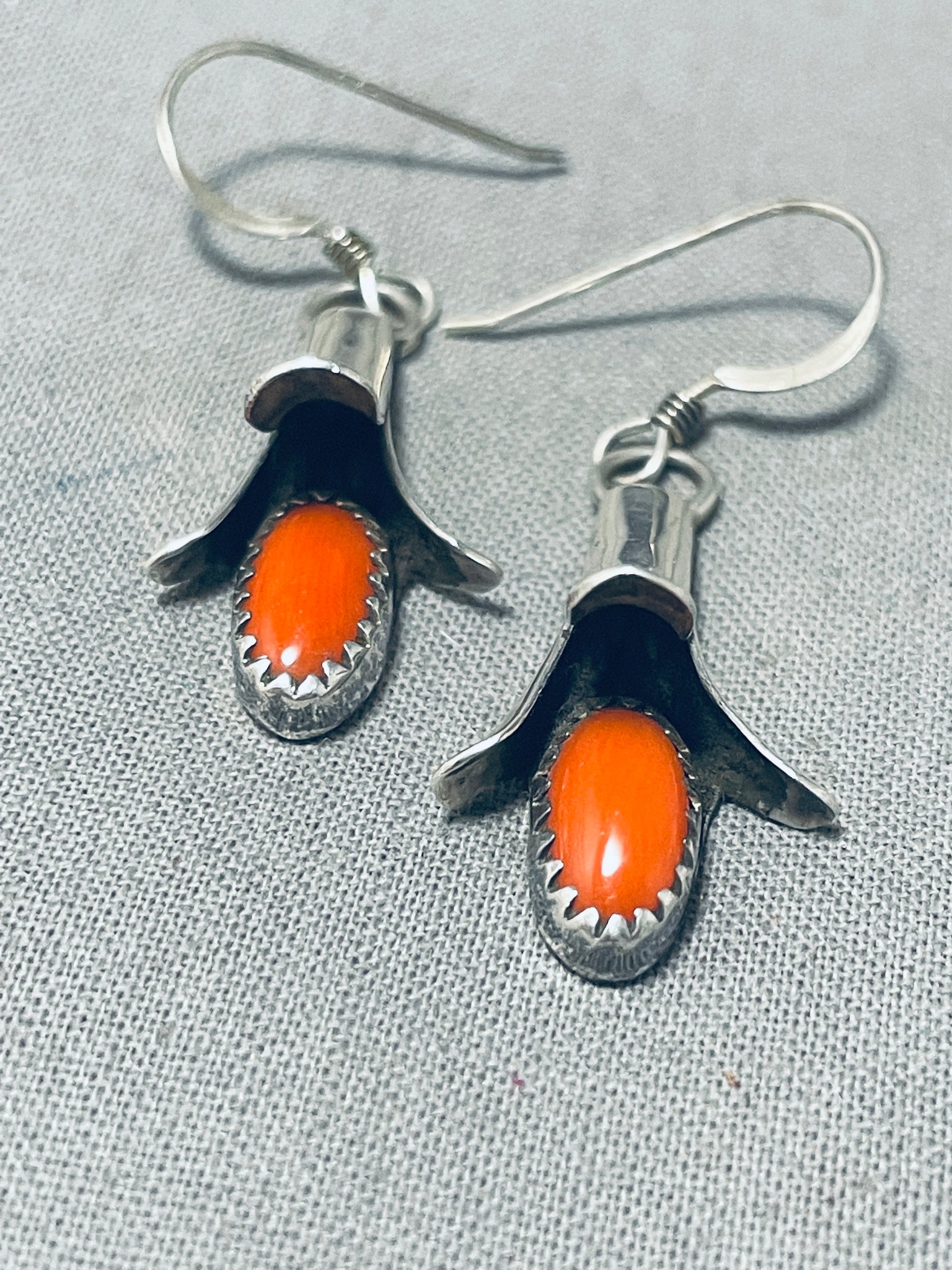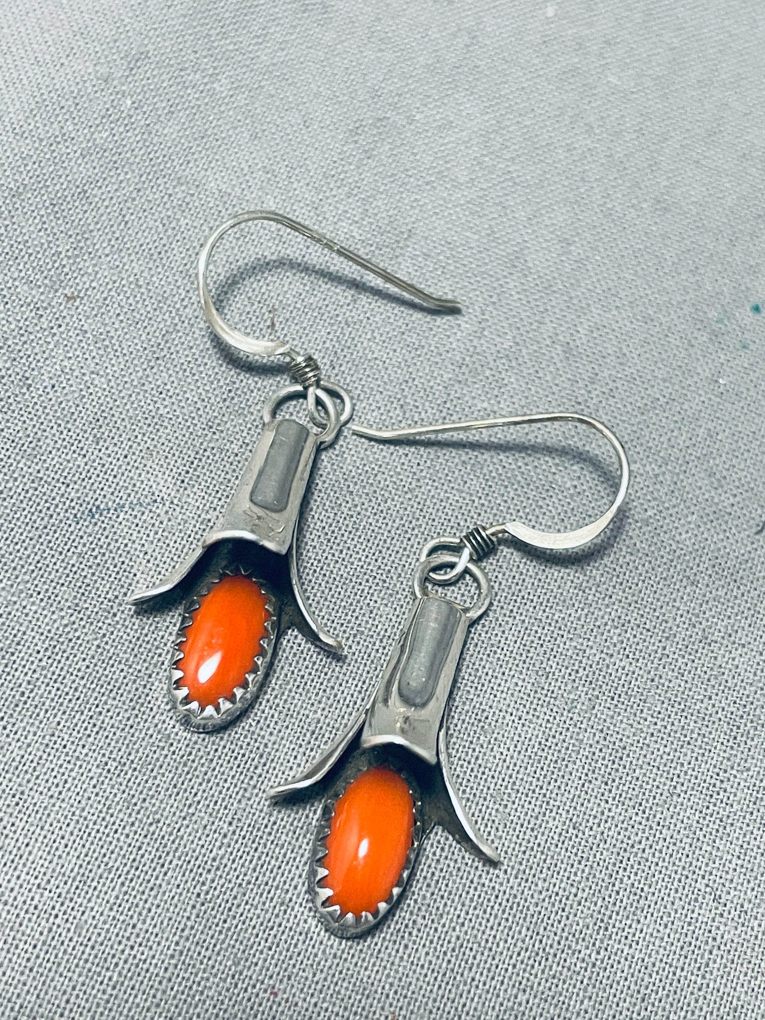 Delightful Native American Navajo Coral Sterling Silver Squash Blossom Earrings