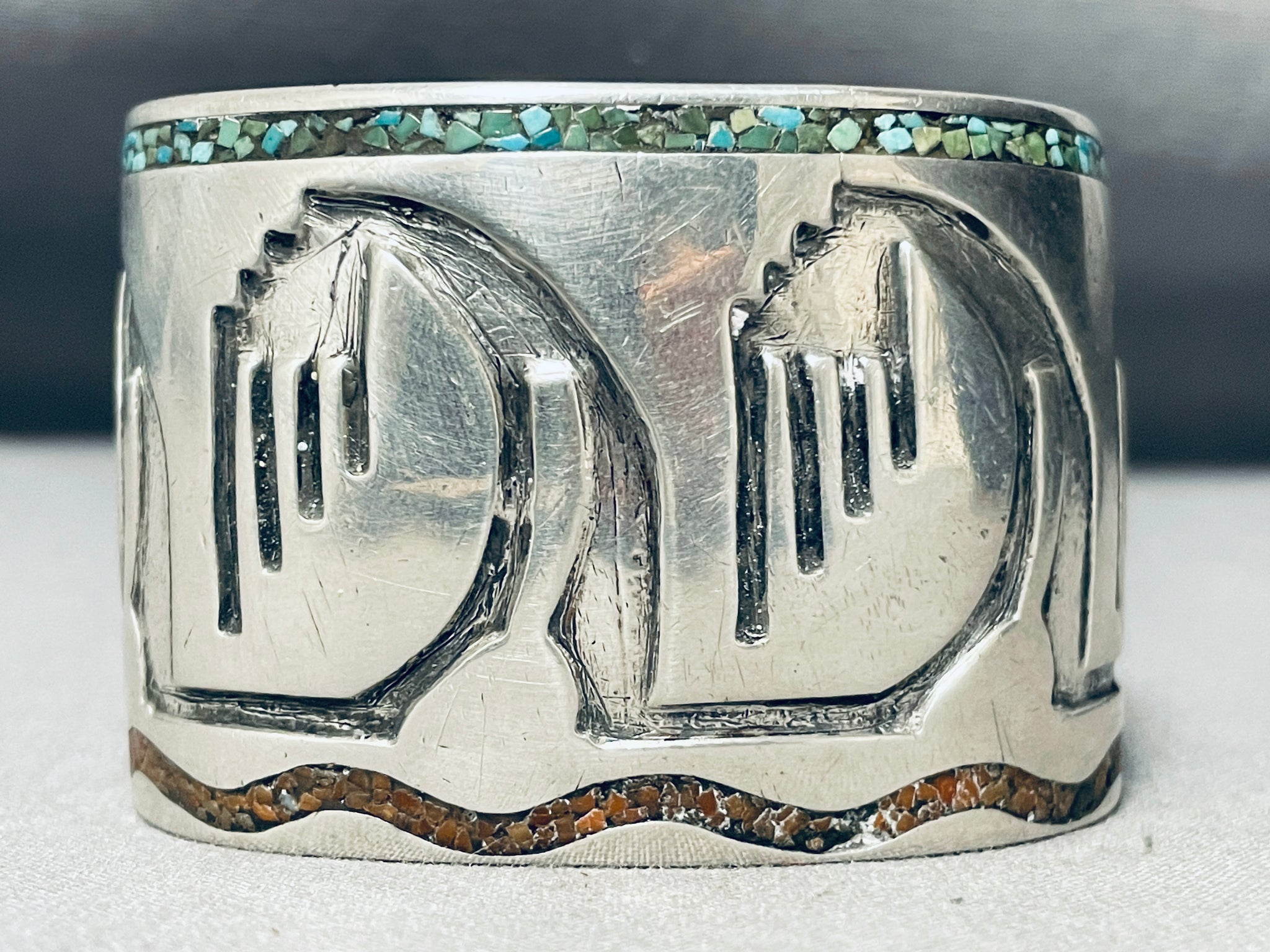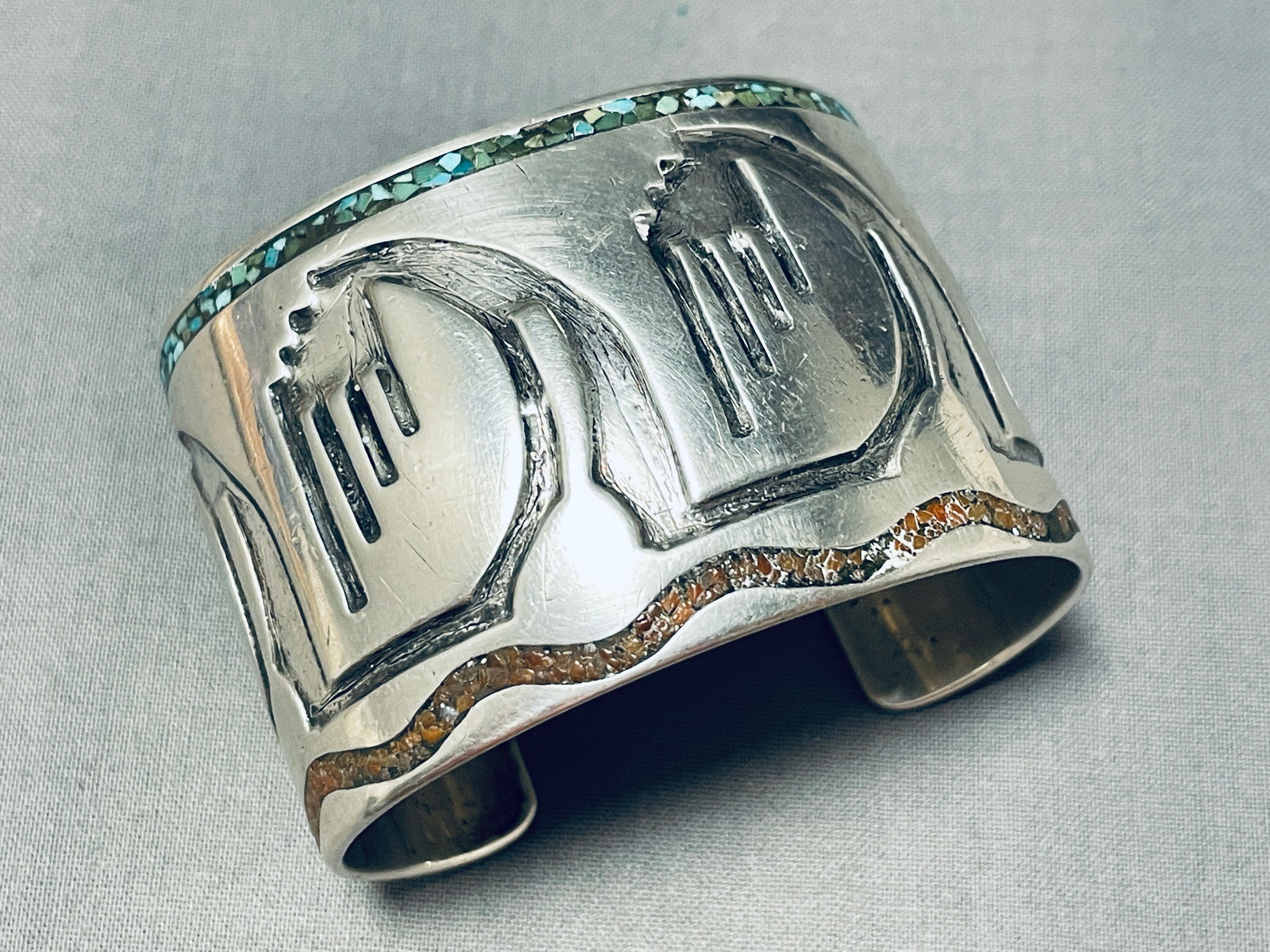 Desert Mountains Vintage Native American Navajo Turquoise Inlay Sterling Silver Bracelet