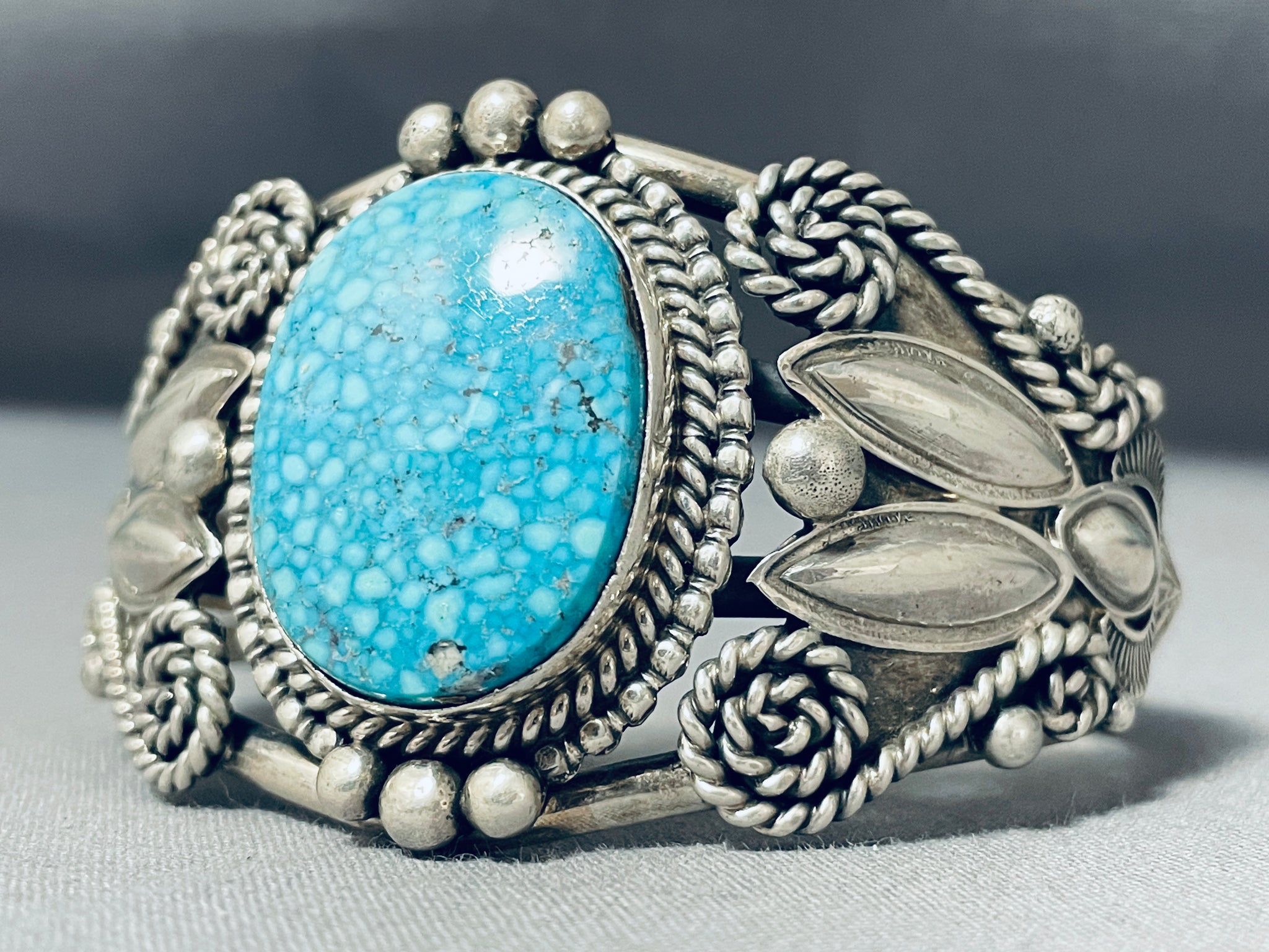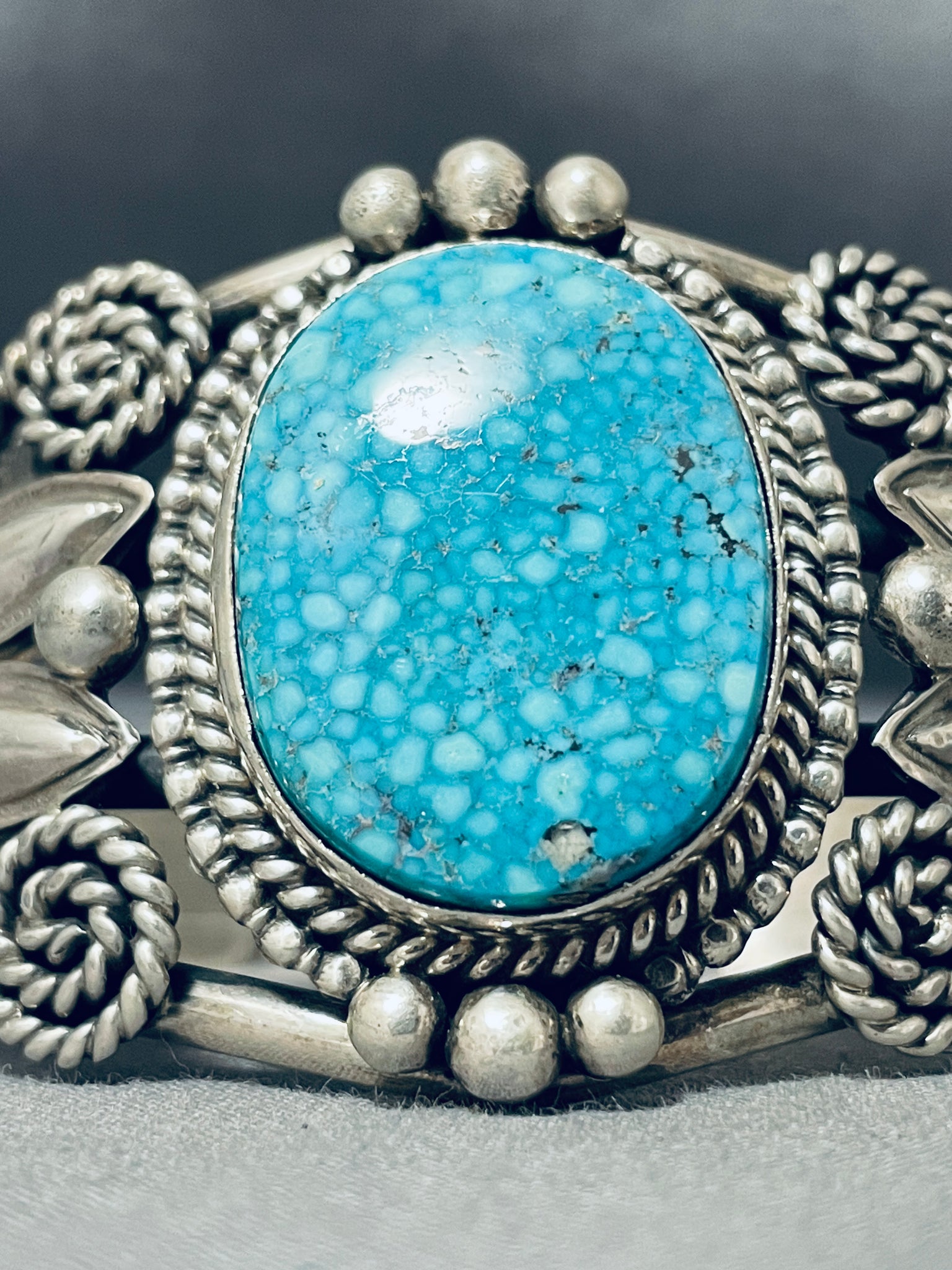 This is a fascinating Navajo large single stone silver bracelet. This impressive bracelet contains a center large Lone Mountain turquoise stones. Surrounding the stone are absolutely incredible silver works that consist of ropes, graduating raindrops, swirling stems, sun stampings and repoussed shells. This bracelet contains a wonderful quadruple silver shank cuff. The center stone measures around 1-1/8" x 7/8". The width of the bracelet measures around 1-5/8". Signed by Navajo artist, M. Spencer. Sterling silver, marked. Cir. 1970's+. The inside end to end measures around 5-3/4" with an additional 1" gap. Sturdy 62 grams.