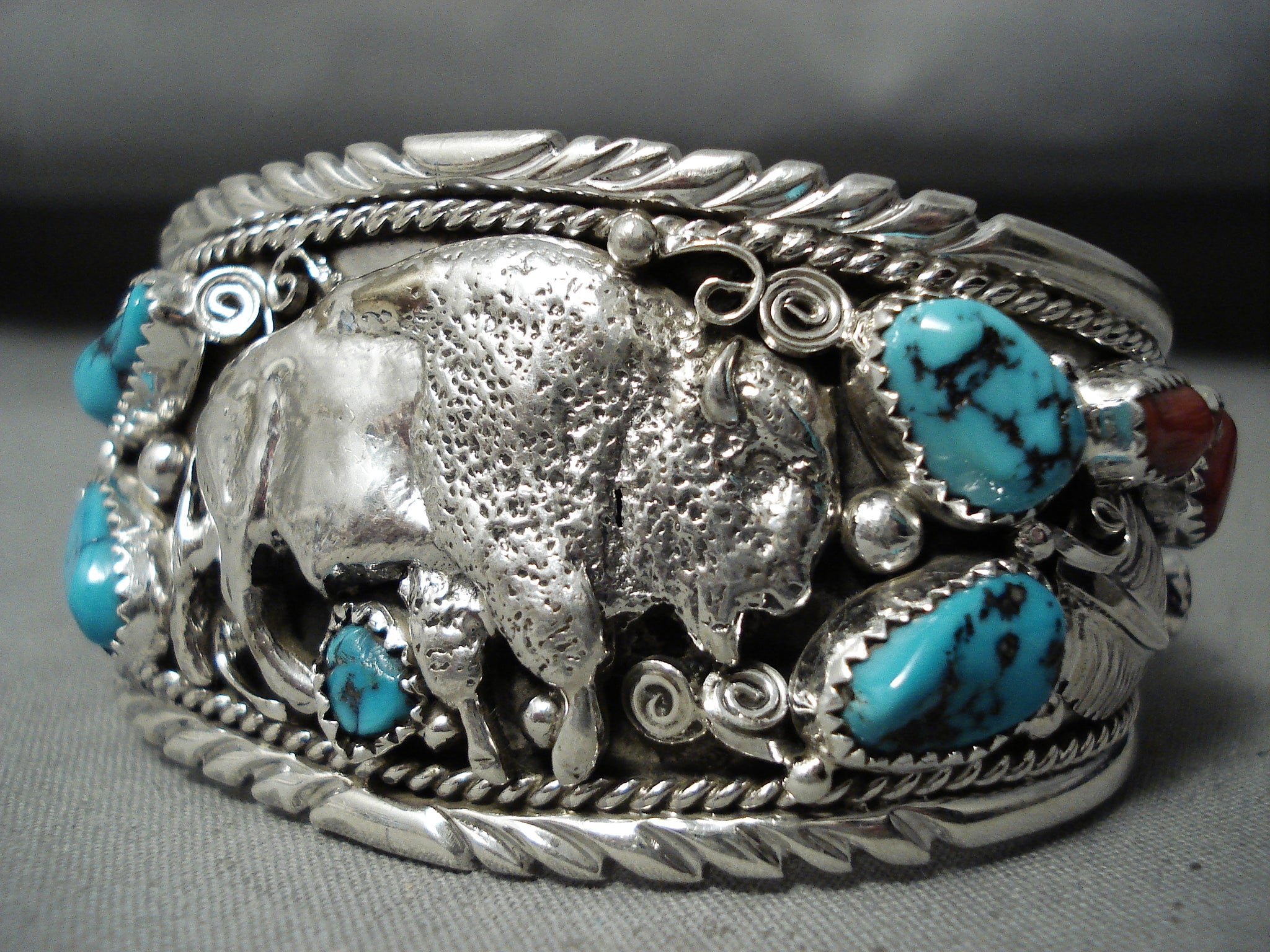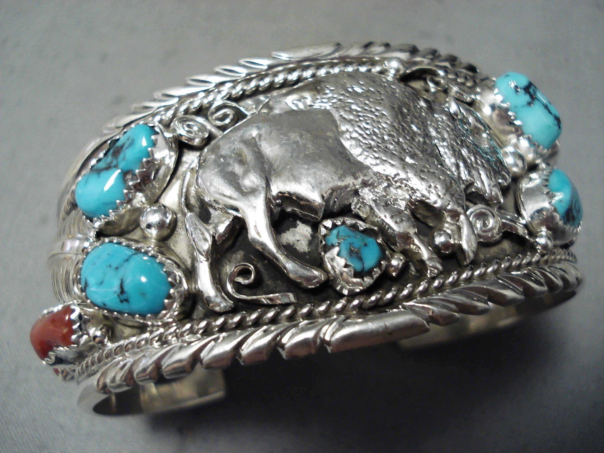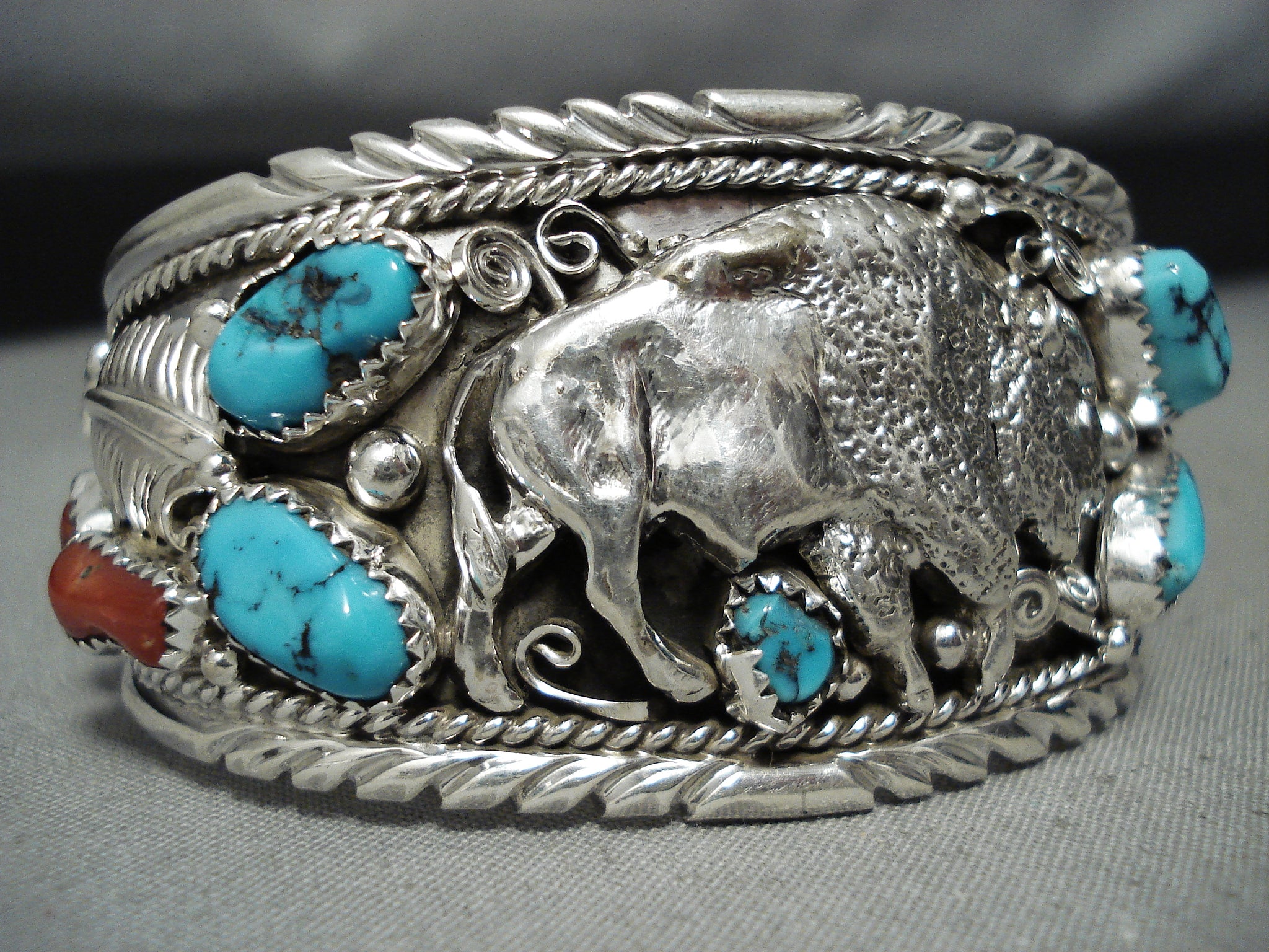 Detailed Buffalo Native American Navajo Turquoise Coral Sterling Silver Leaf Bracelet