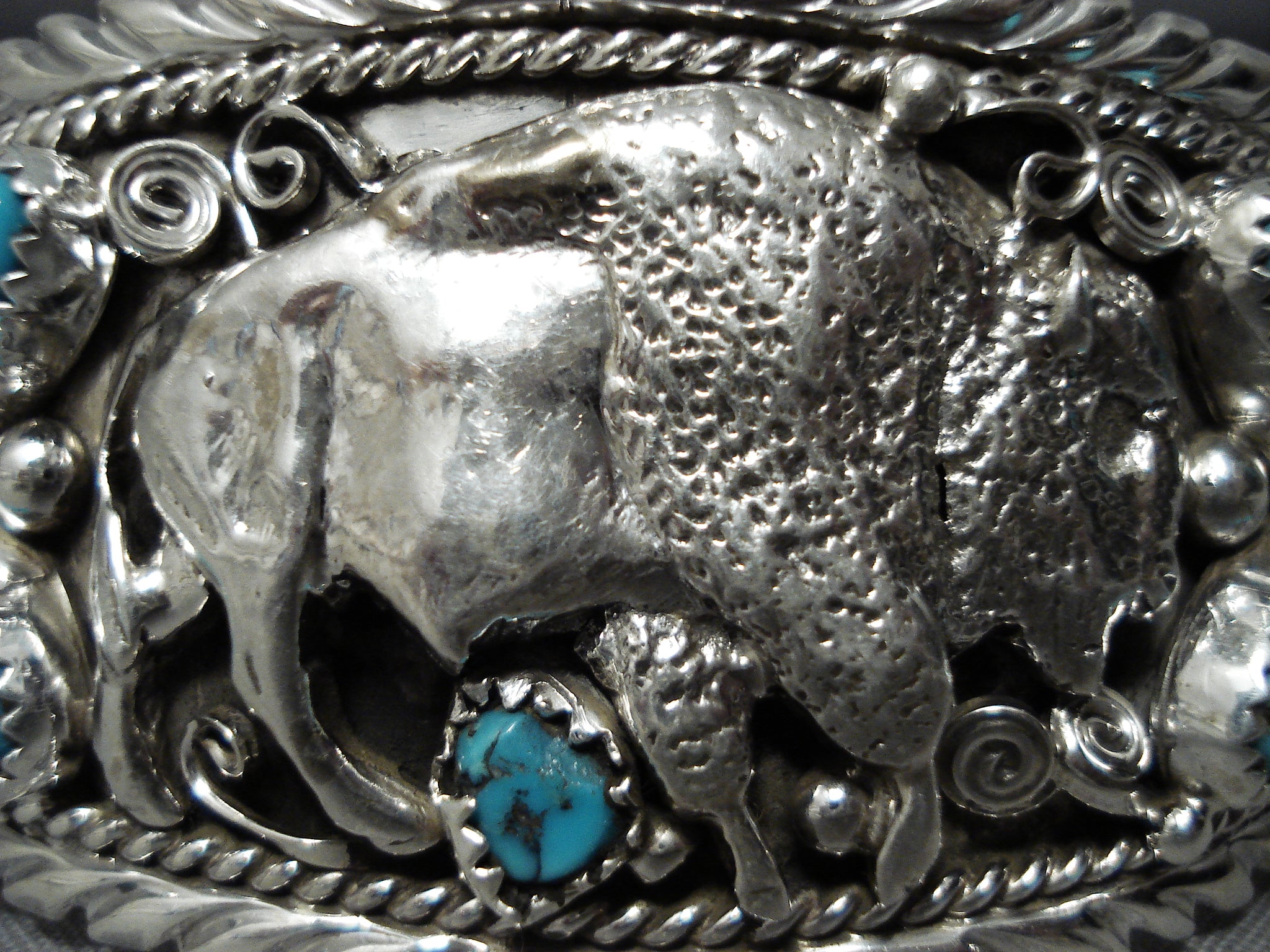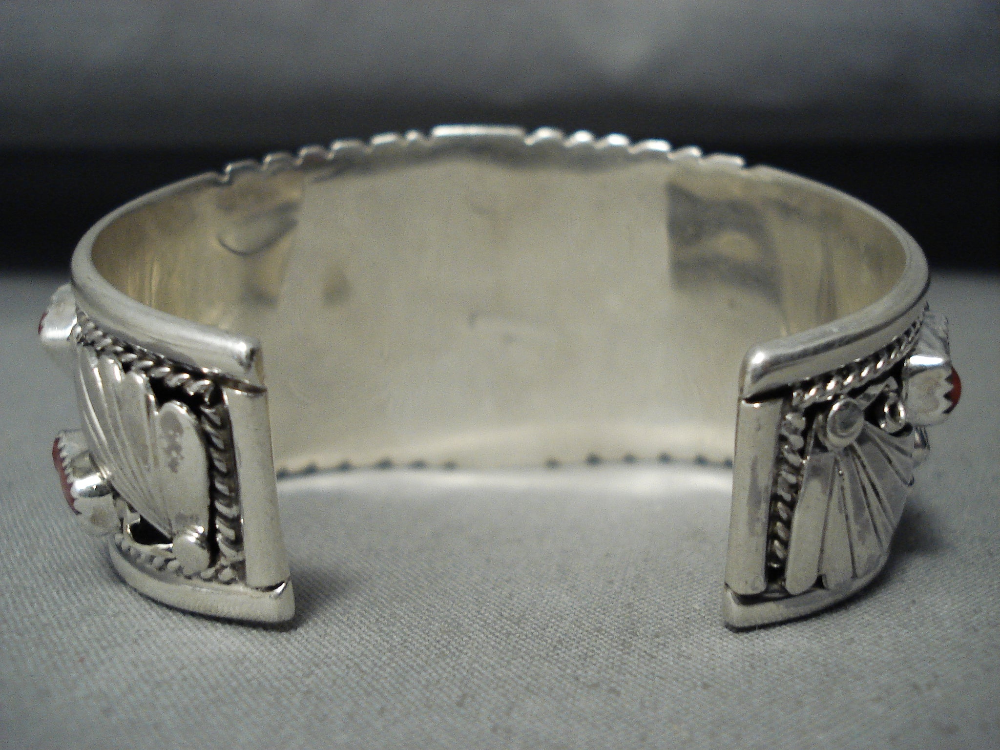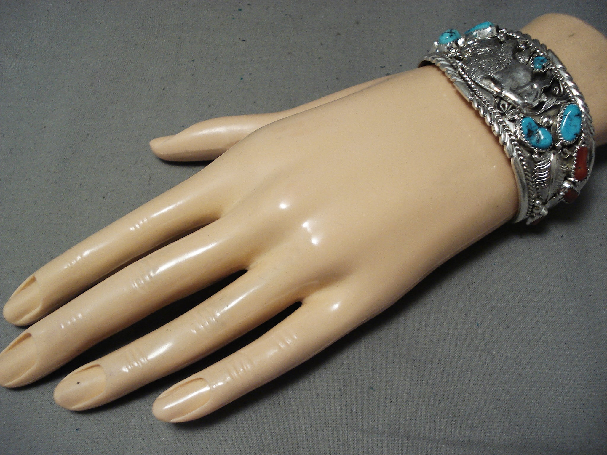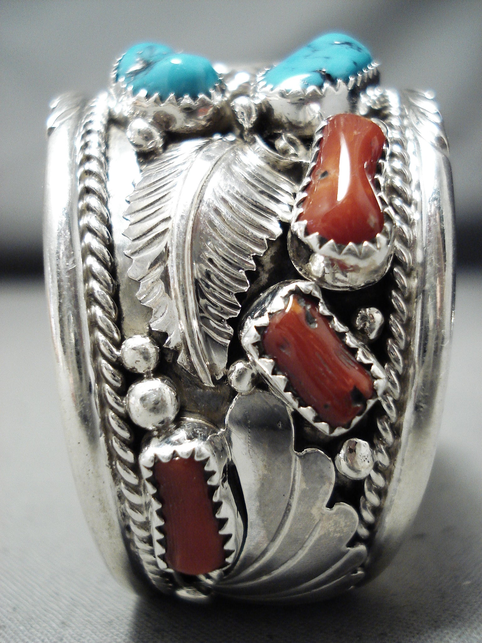Detailed Buffalo Native American Navajo Turquoise Coral Sterling Silver Leaf Bracelet