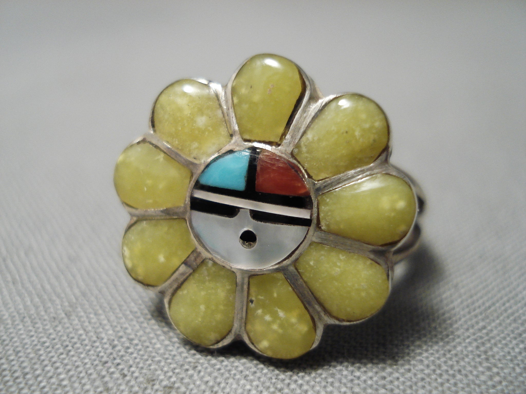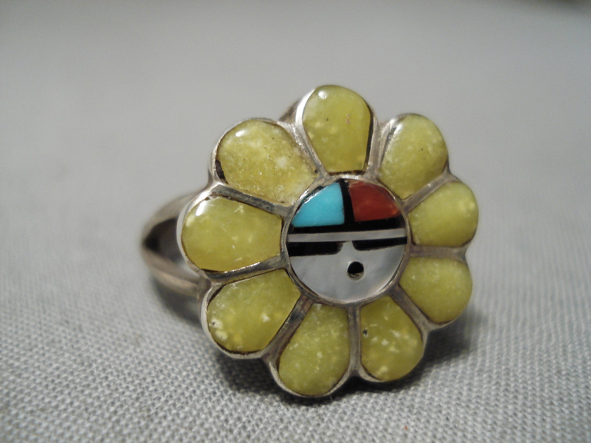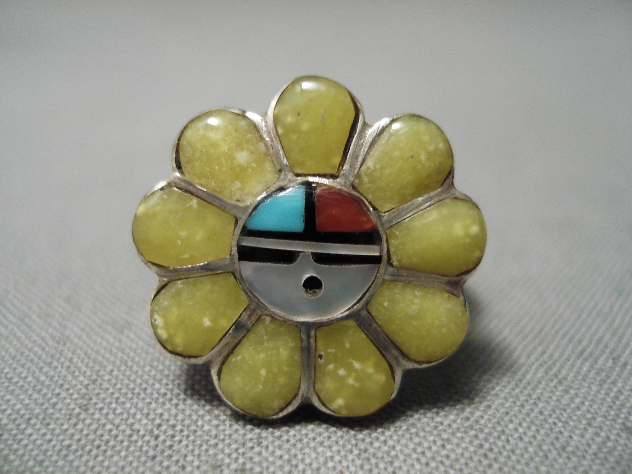 Up for sale is this fabulous vintage Zuni silver ring. This is a fantastic double rail inlay ring of a thick colorful floral motif - with a native sunface in the very center! Stones include turquoise, coral, mother of pearl and jet. The ring face measures around 5/8" x 3/4". Signed by Zuni artist, Morris Lahte. The ring size is around 6. Sterling silver. Sturdy 3 grams.
