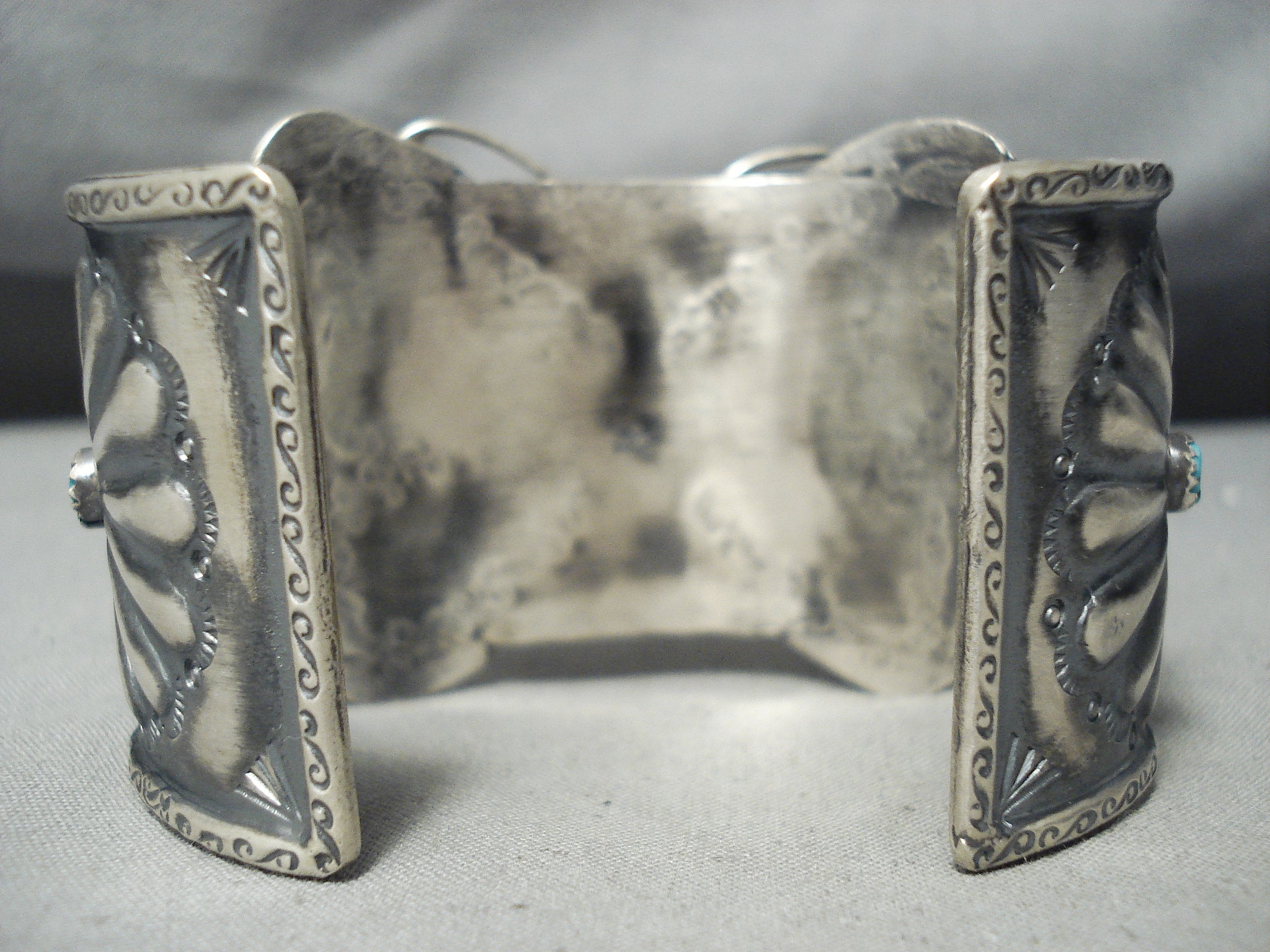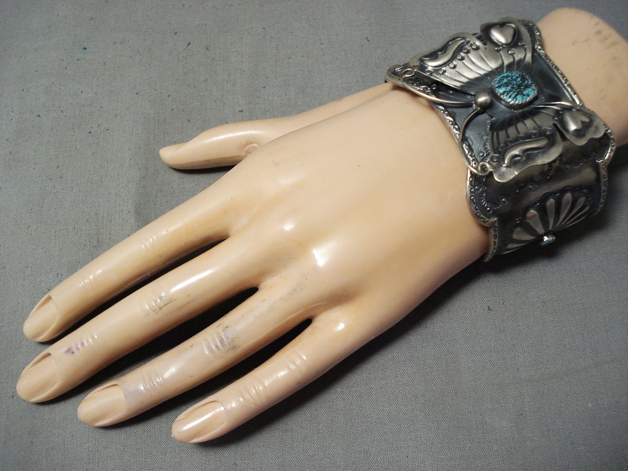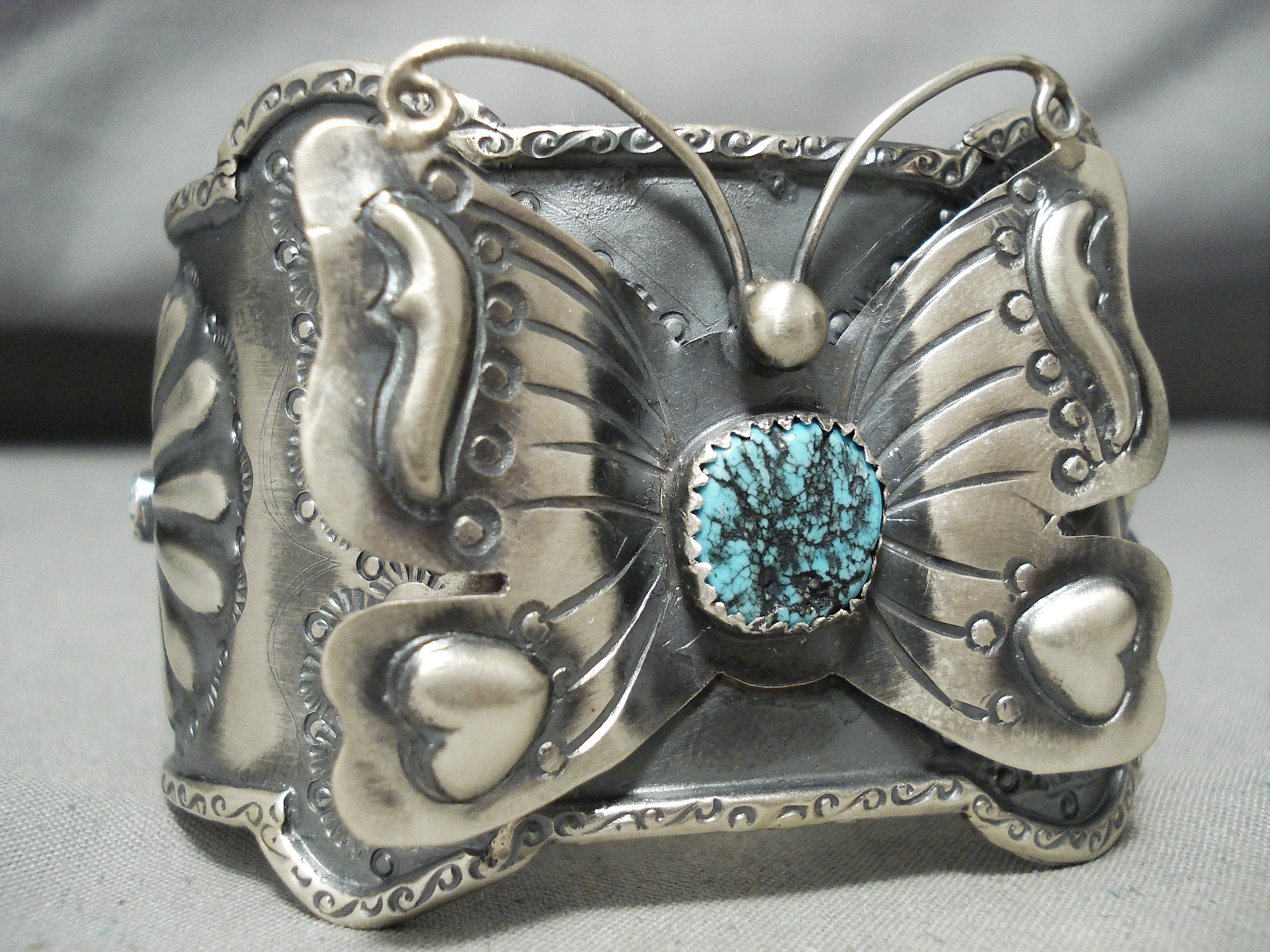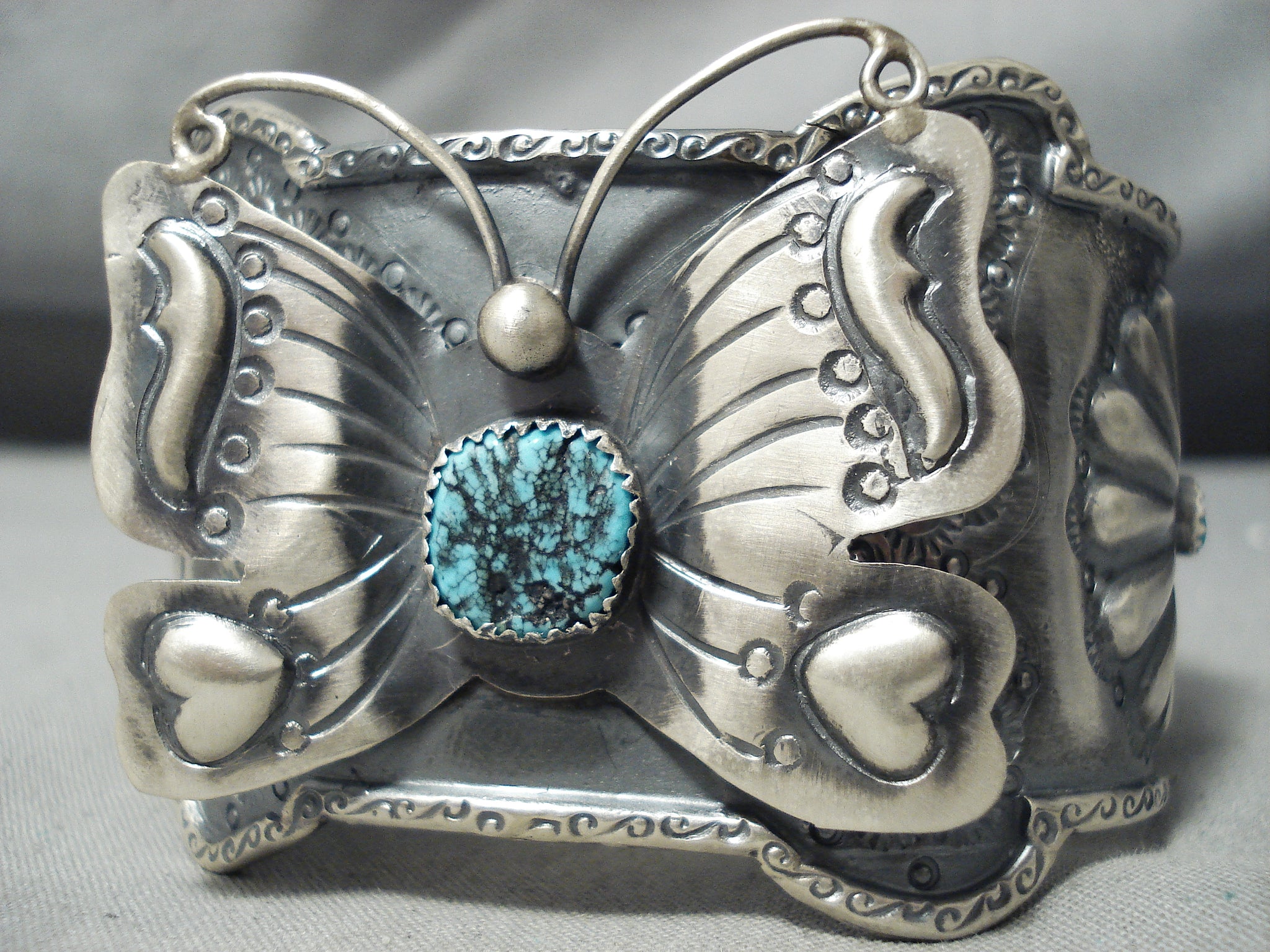 Detailed Huge Native American Navajo Butterfly Turquoise Sterling Silver Bracelet