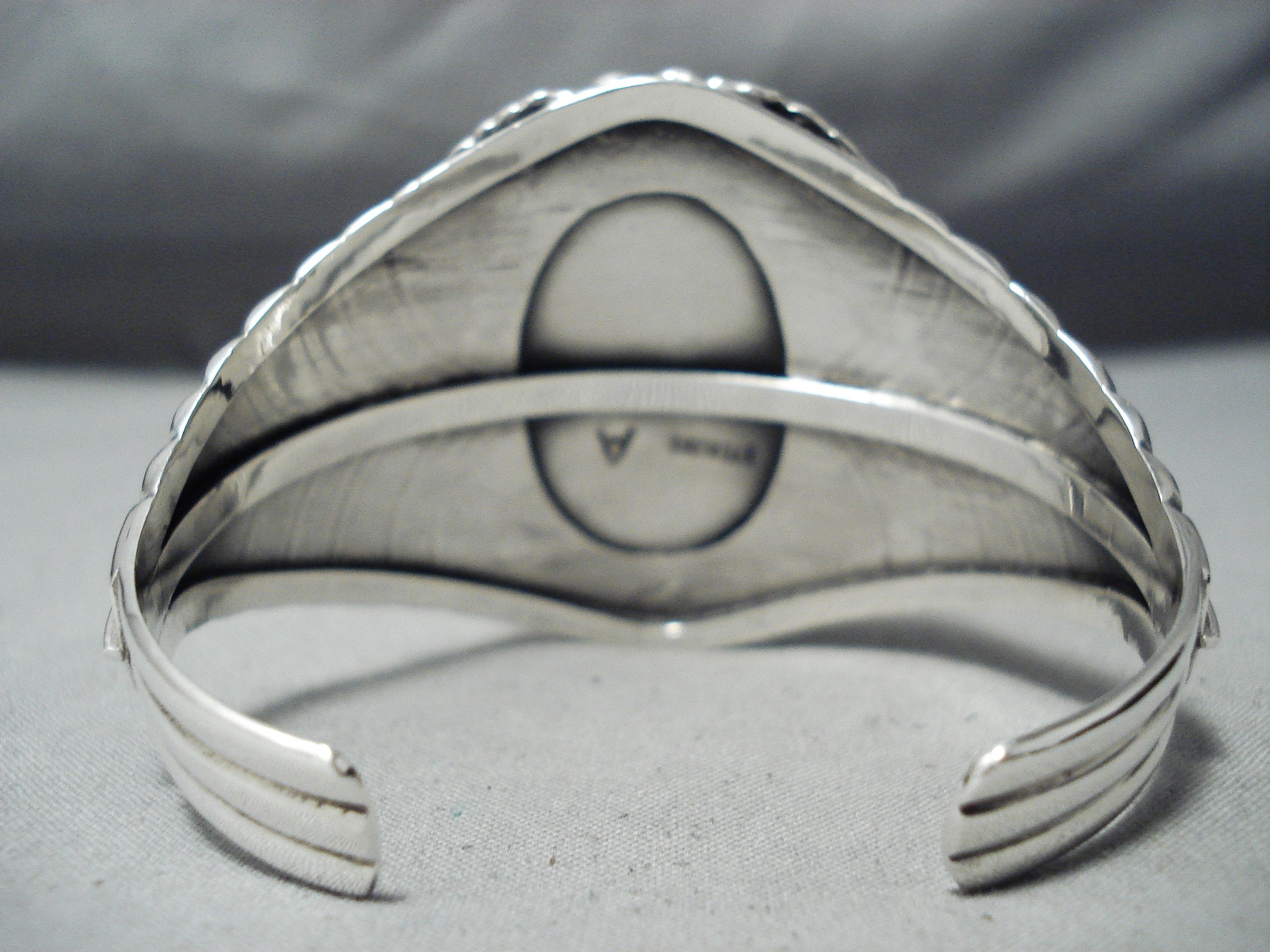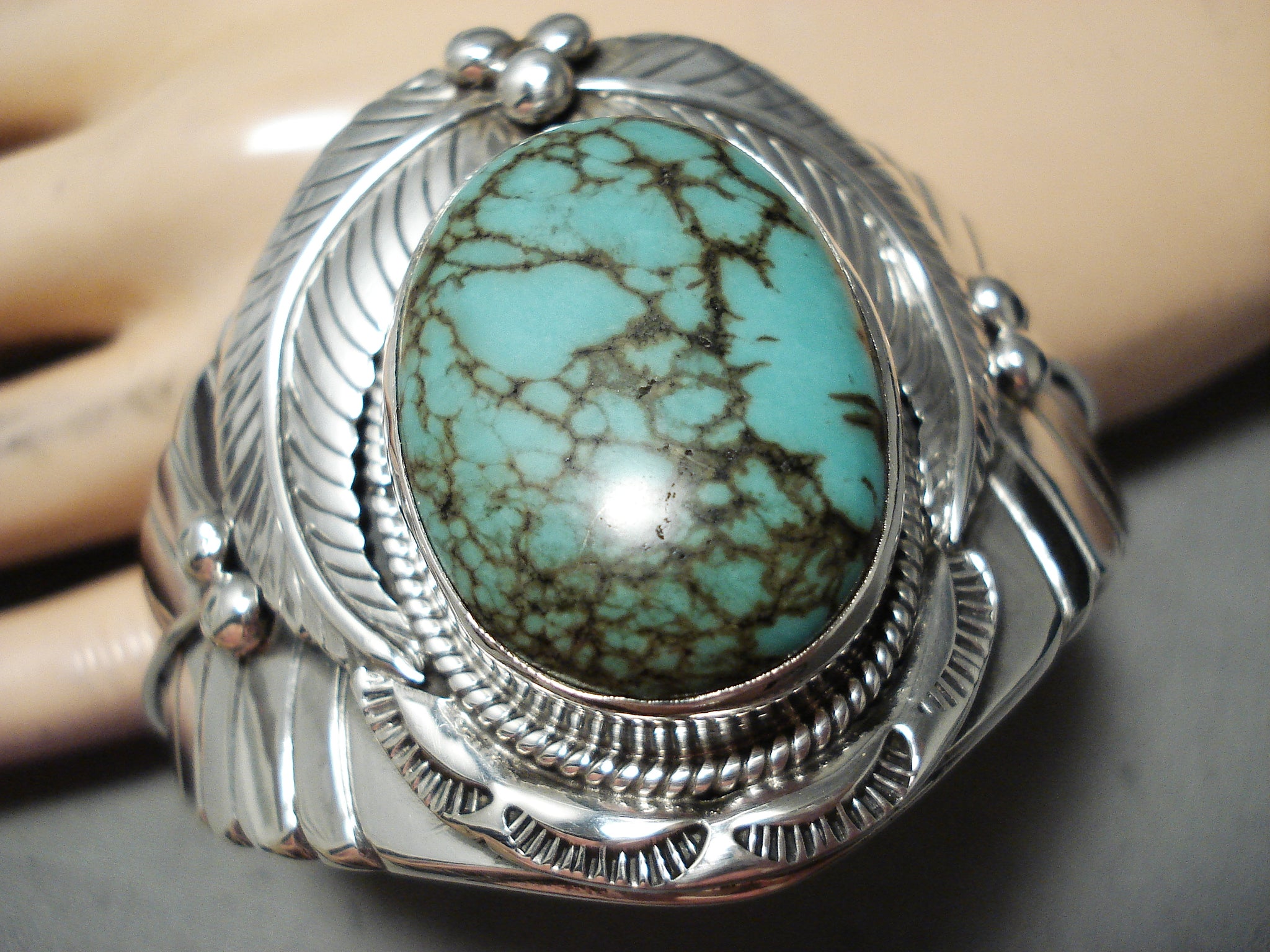 Detailed Huge Vintage Native American Navajo Green Turquoise Sterling Silver Leaf Bracelet