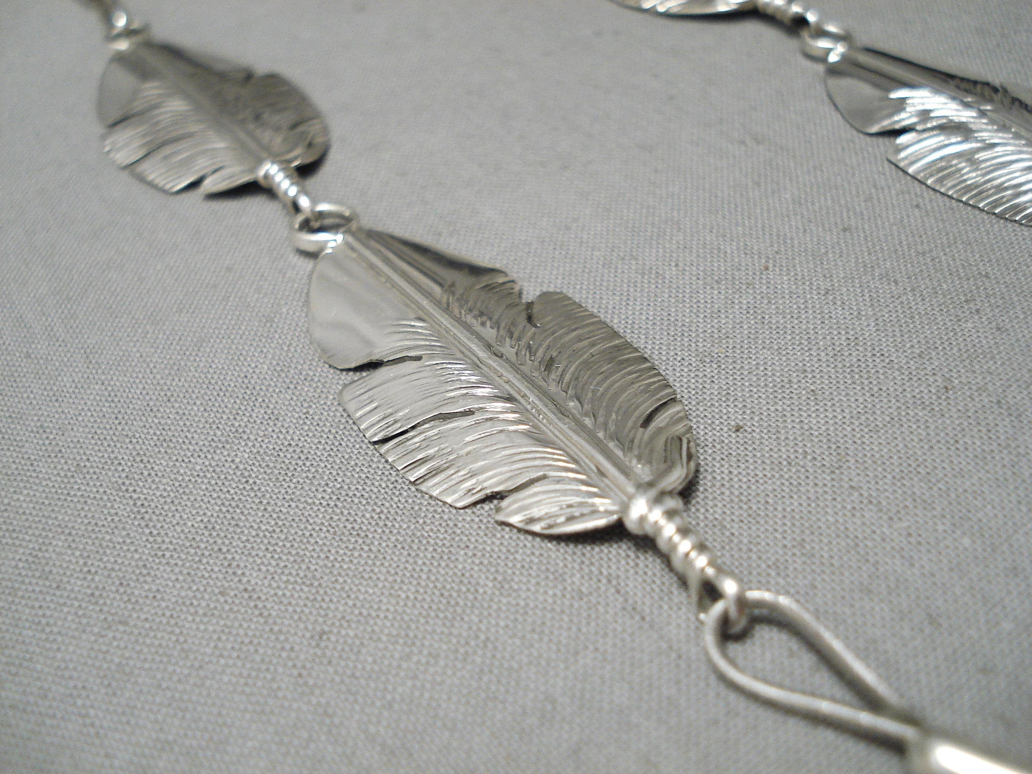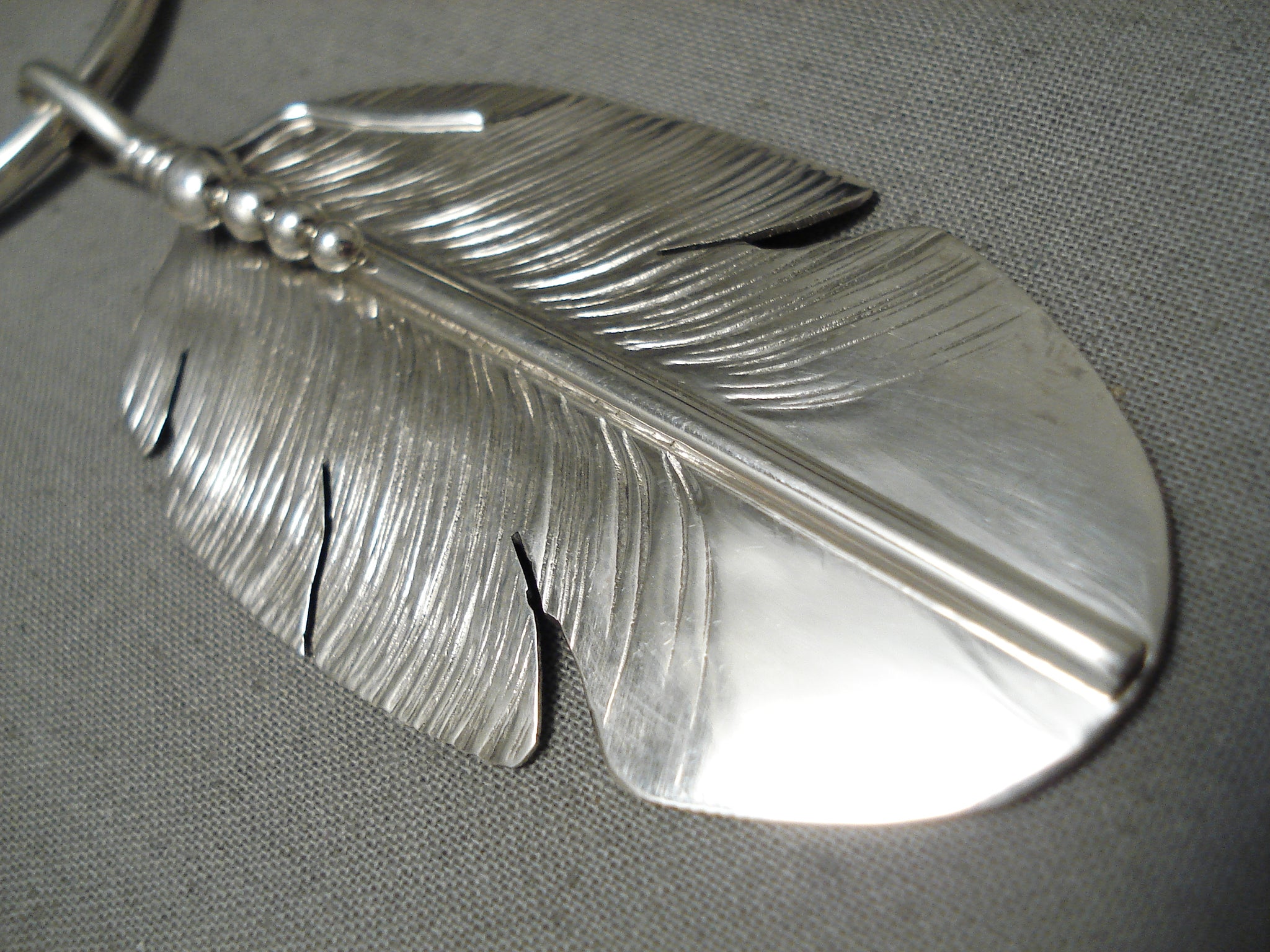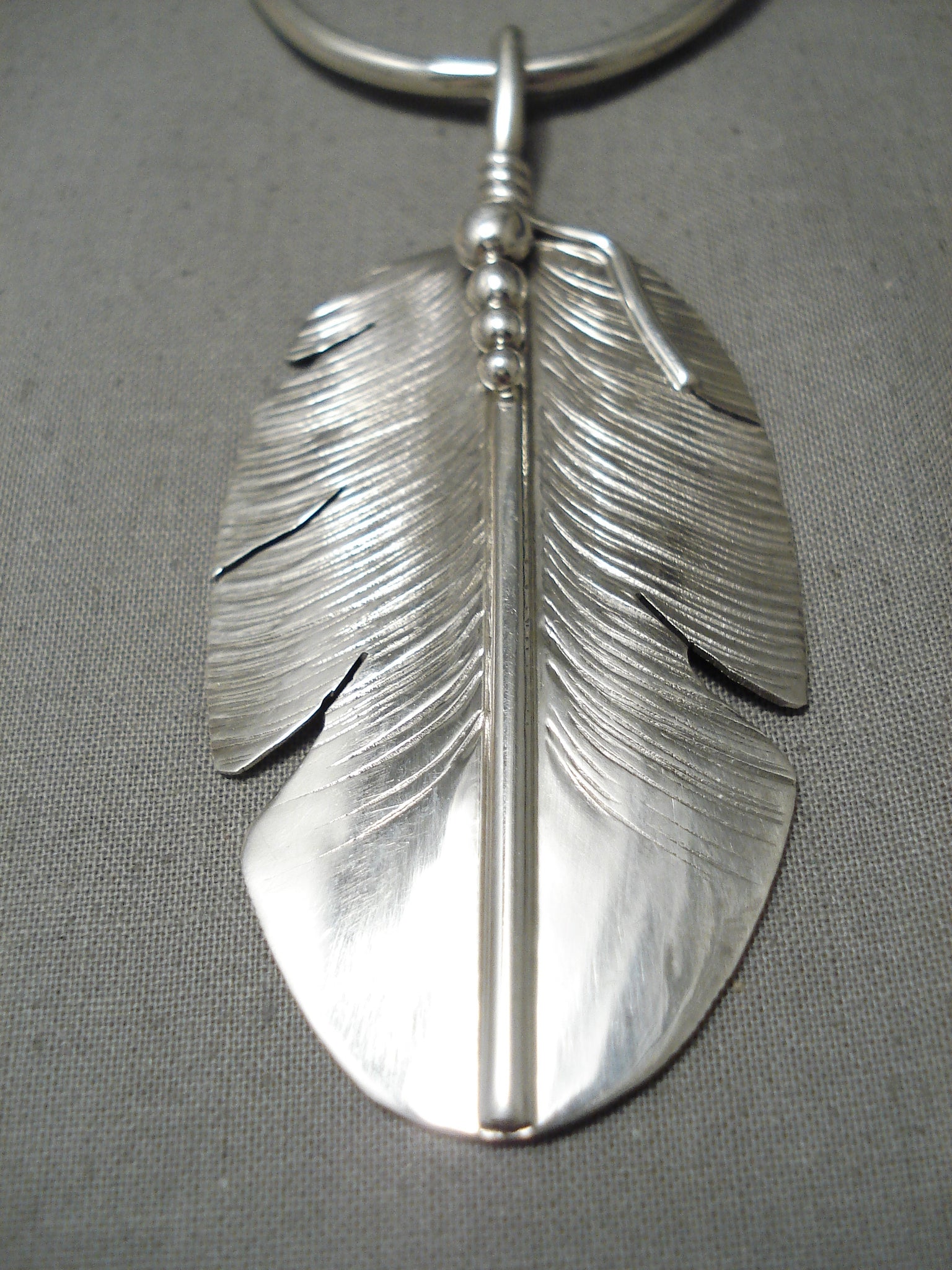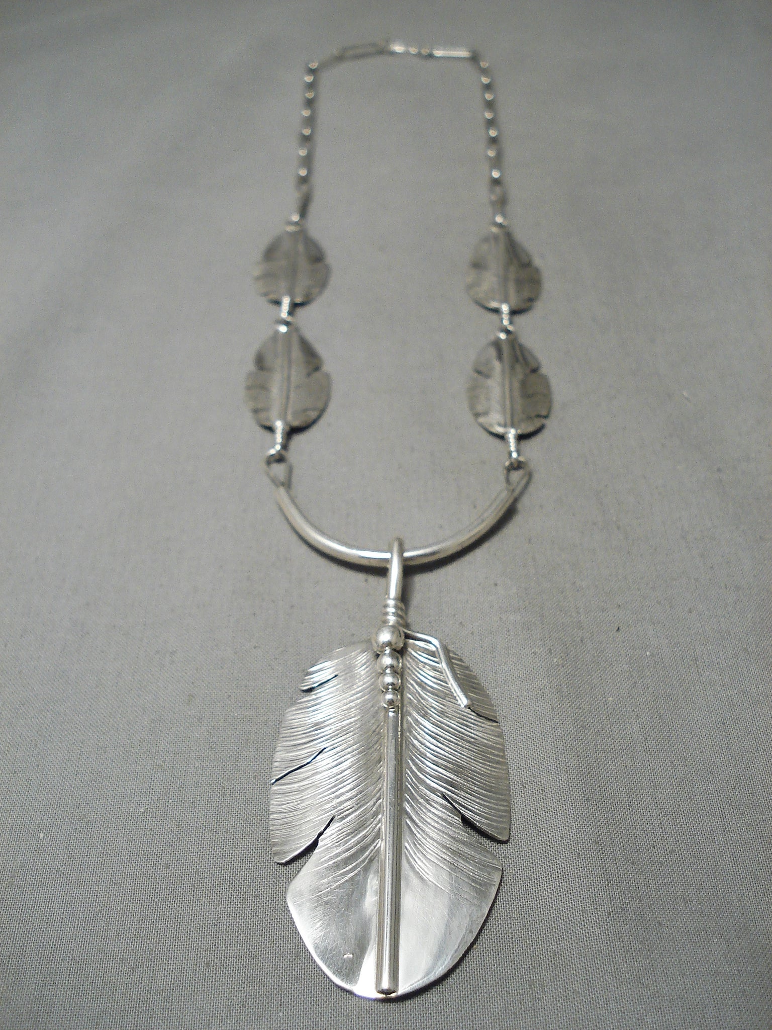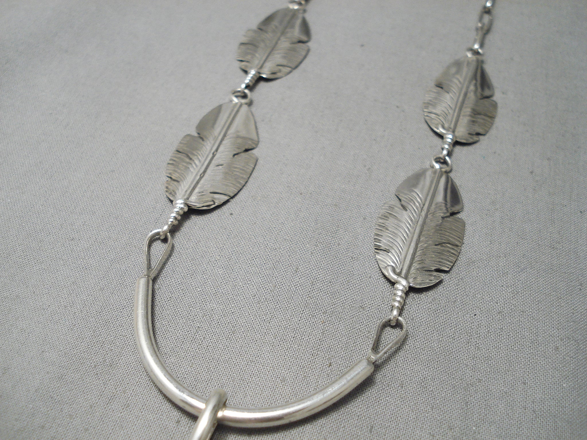 Detailed Intricate!! Hand Carved Native American Navajo Sterling Silver Feather Genius Necklace
