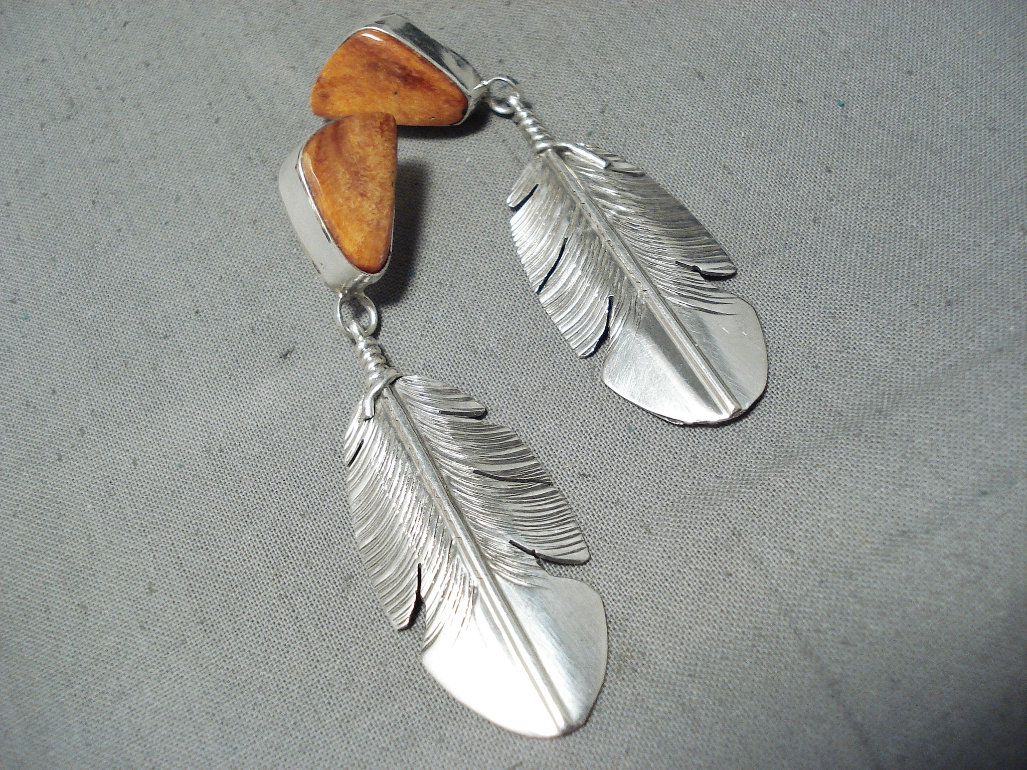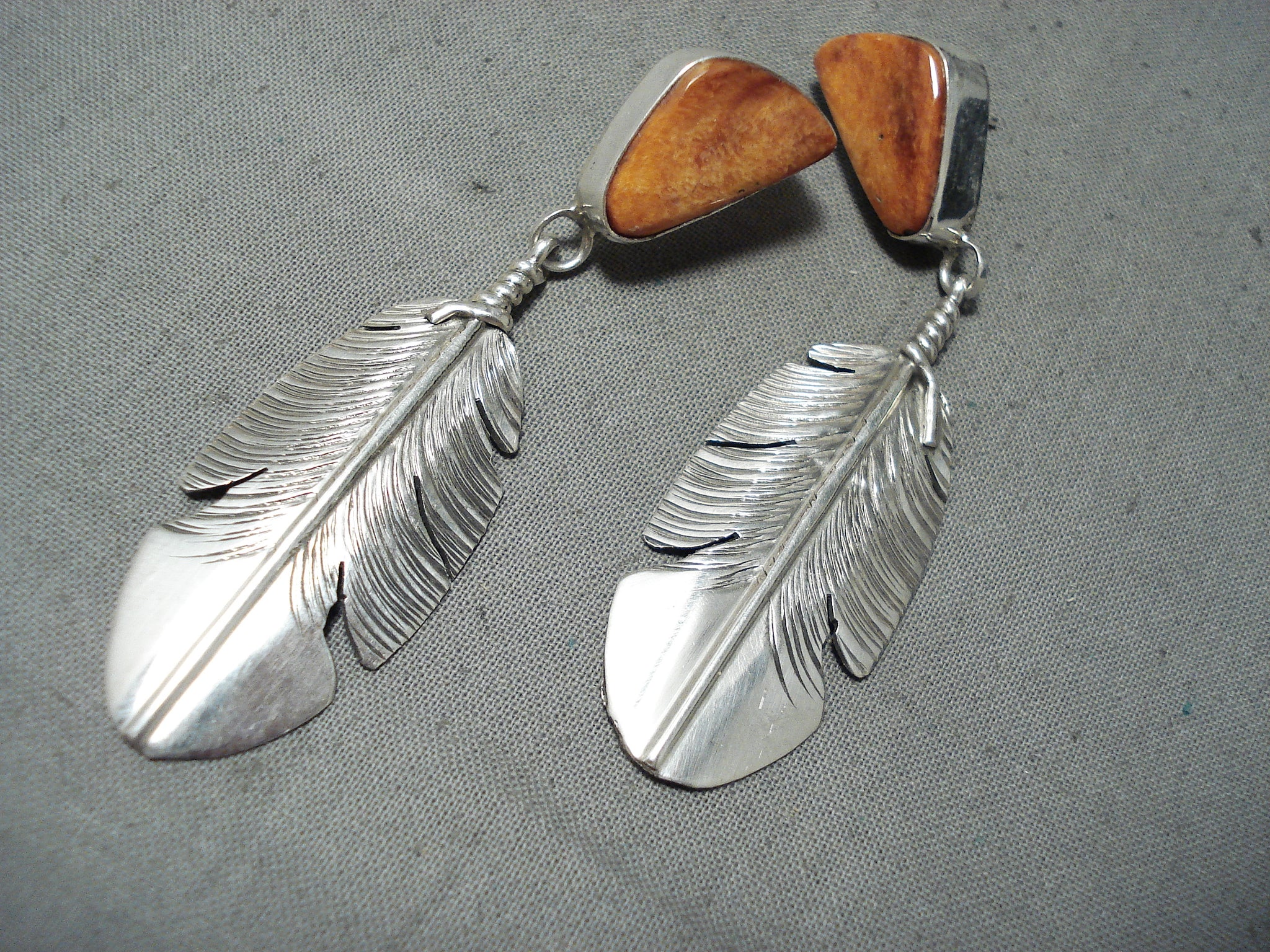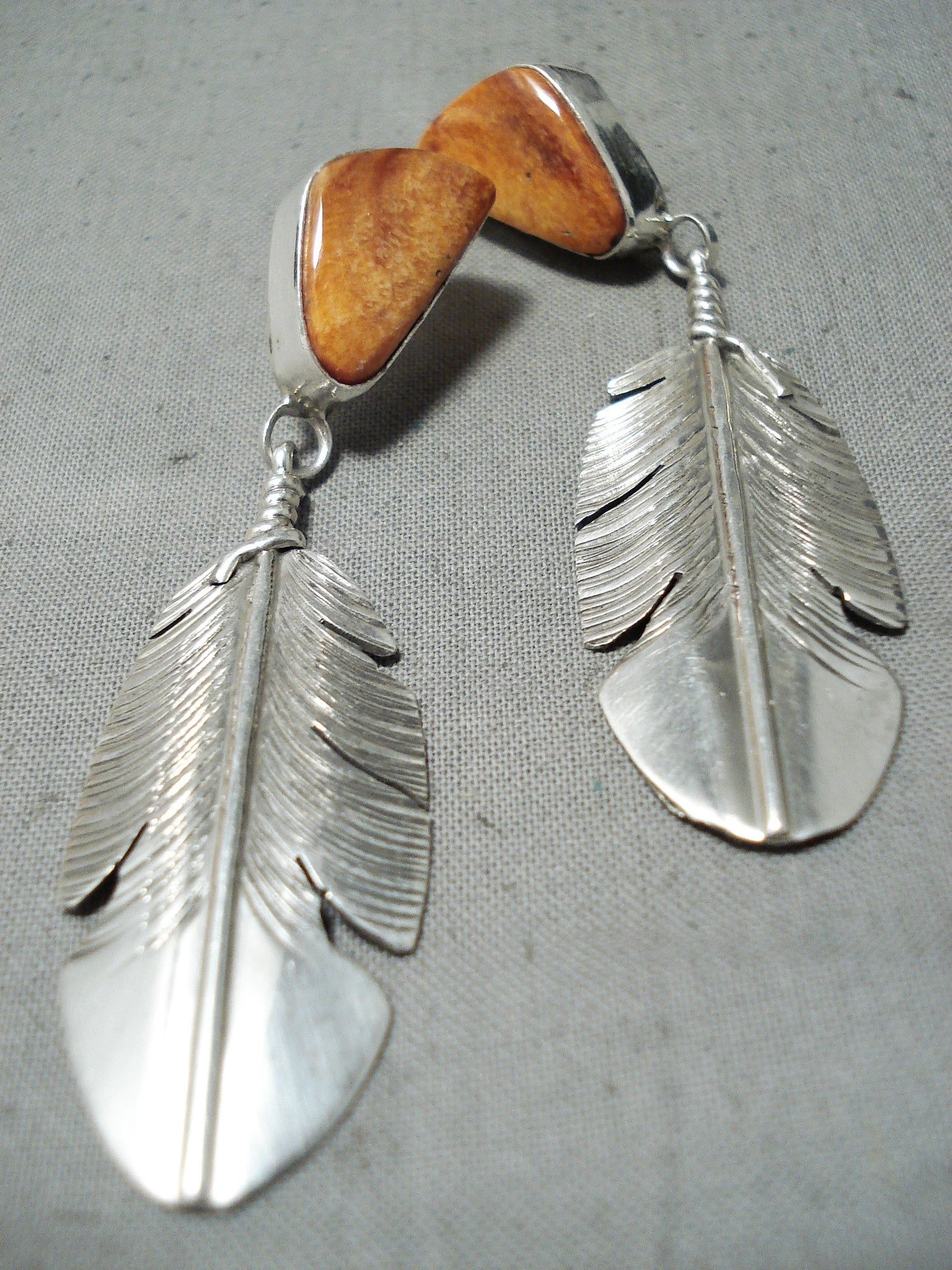 Detailed Native American Navajo Sterling Silver Feather Spiny Oyster Earrings