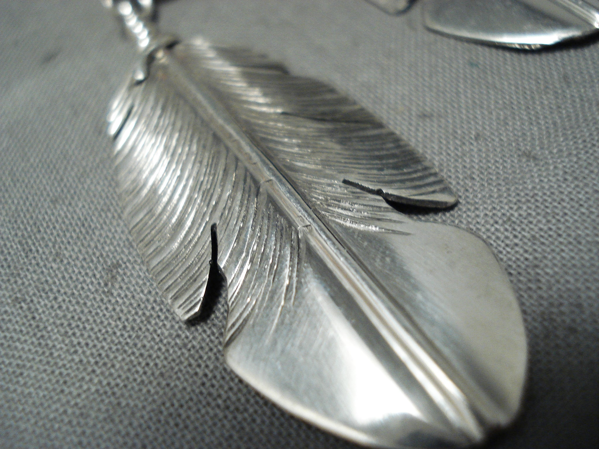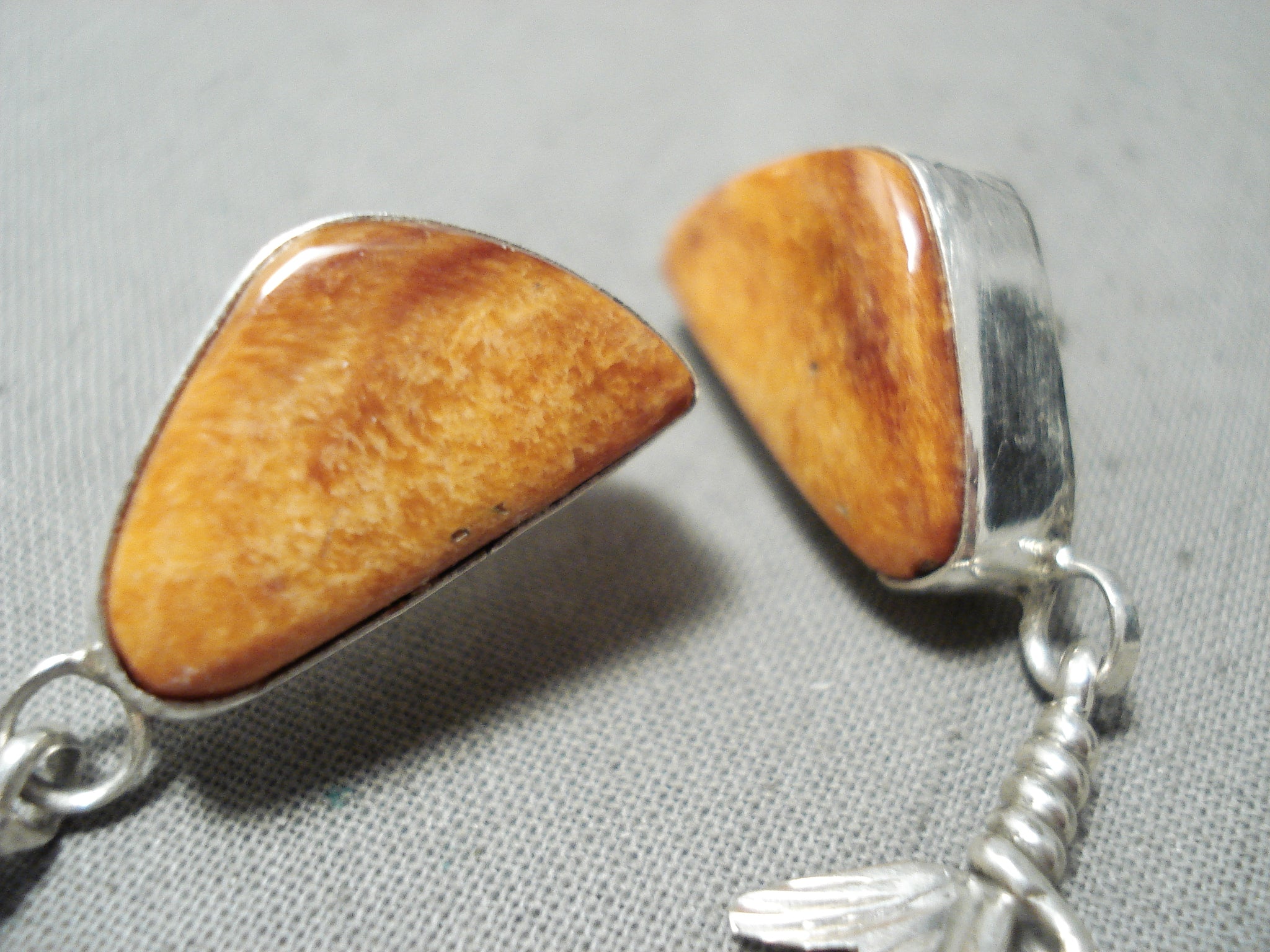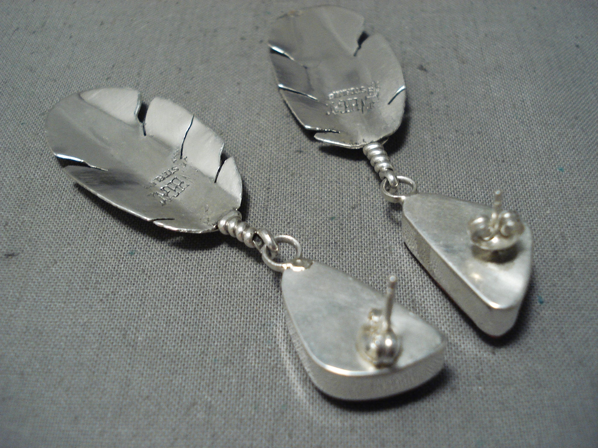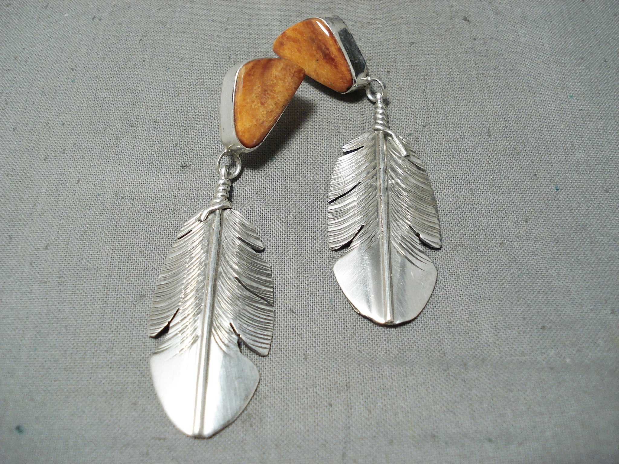Detailed Native American Navajo Sterling Silver Feather Spiny Oyster Earrings