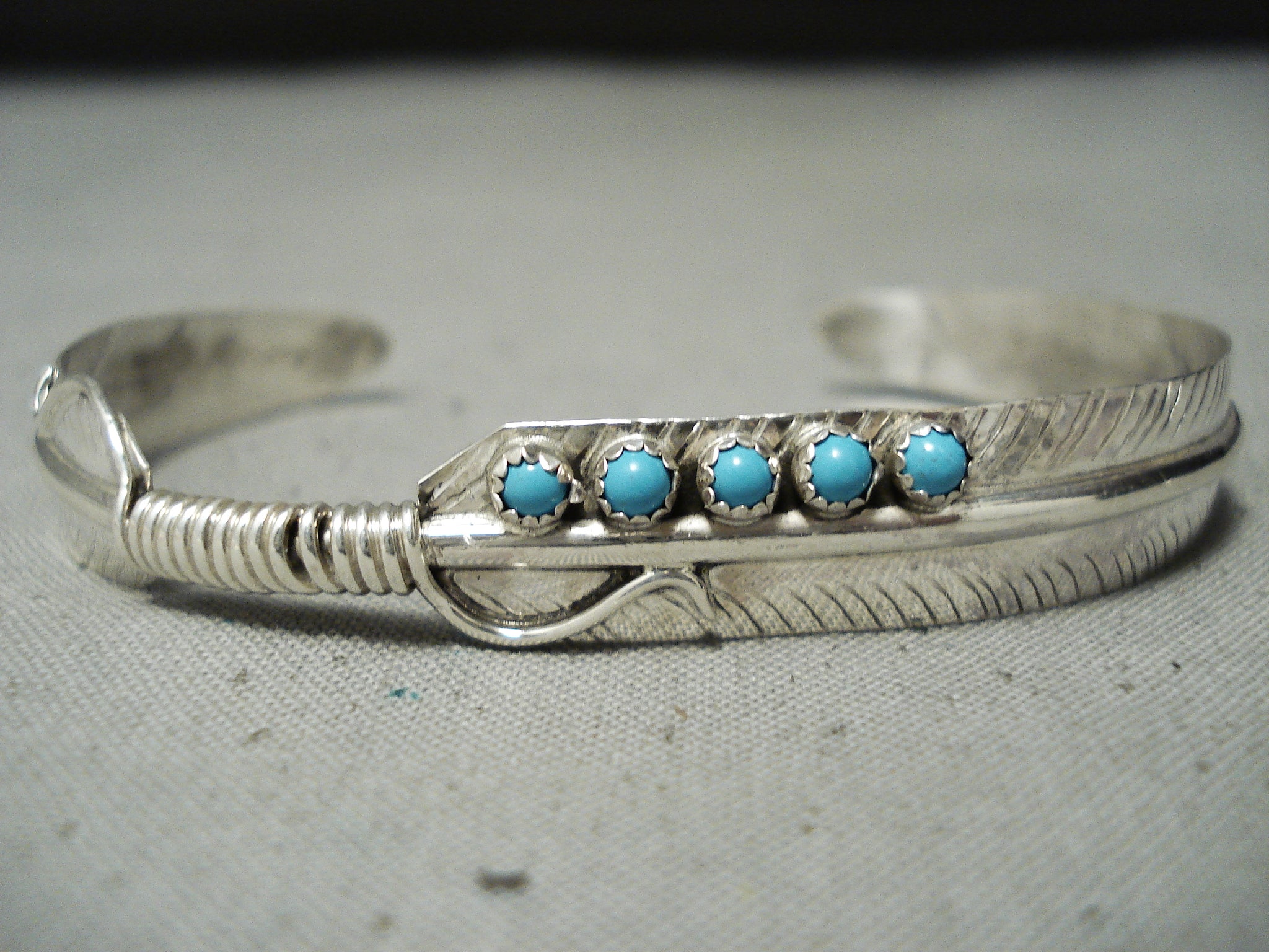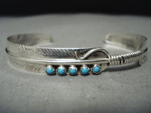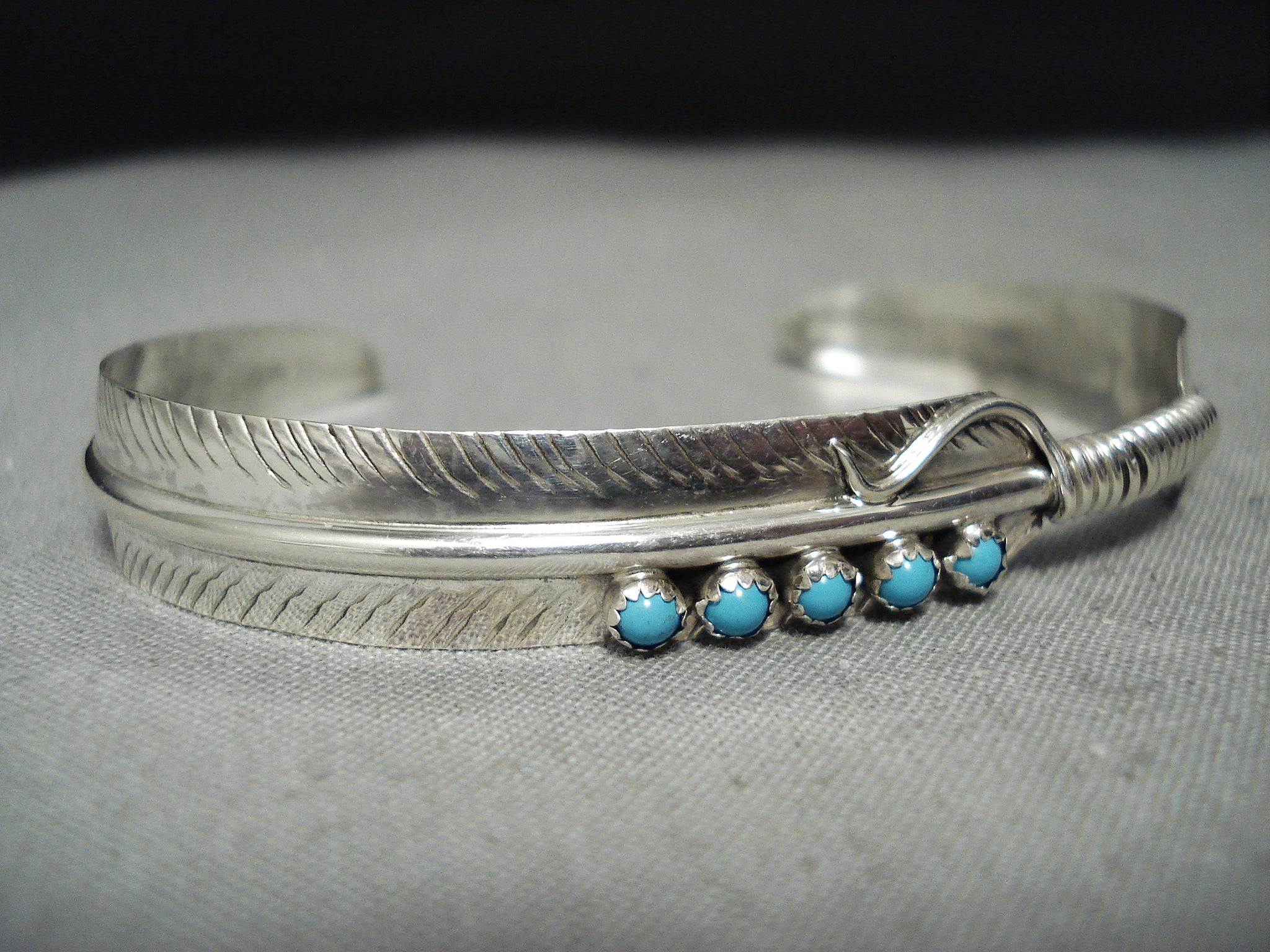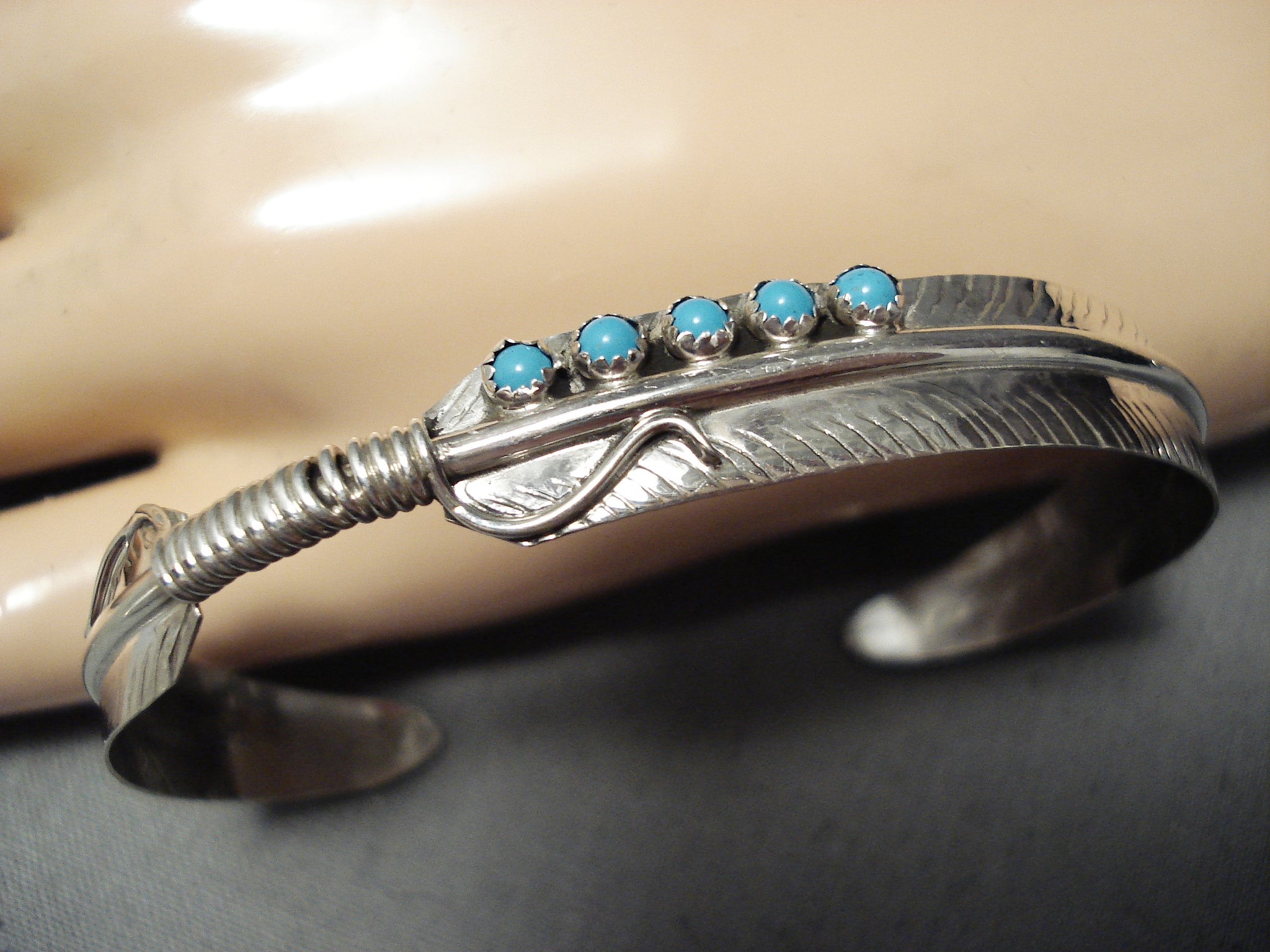 Detailed Native American Navajo Turquoise Snake Eyes Feather Sterling Silver Bracelet