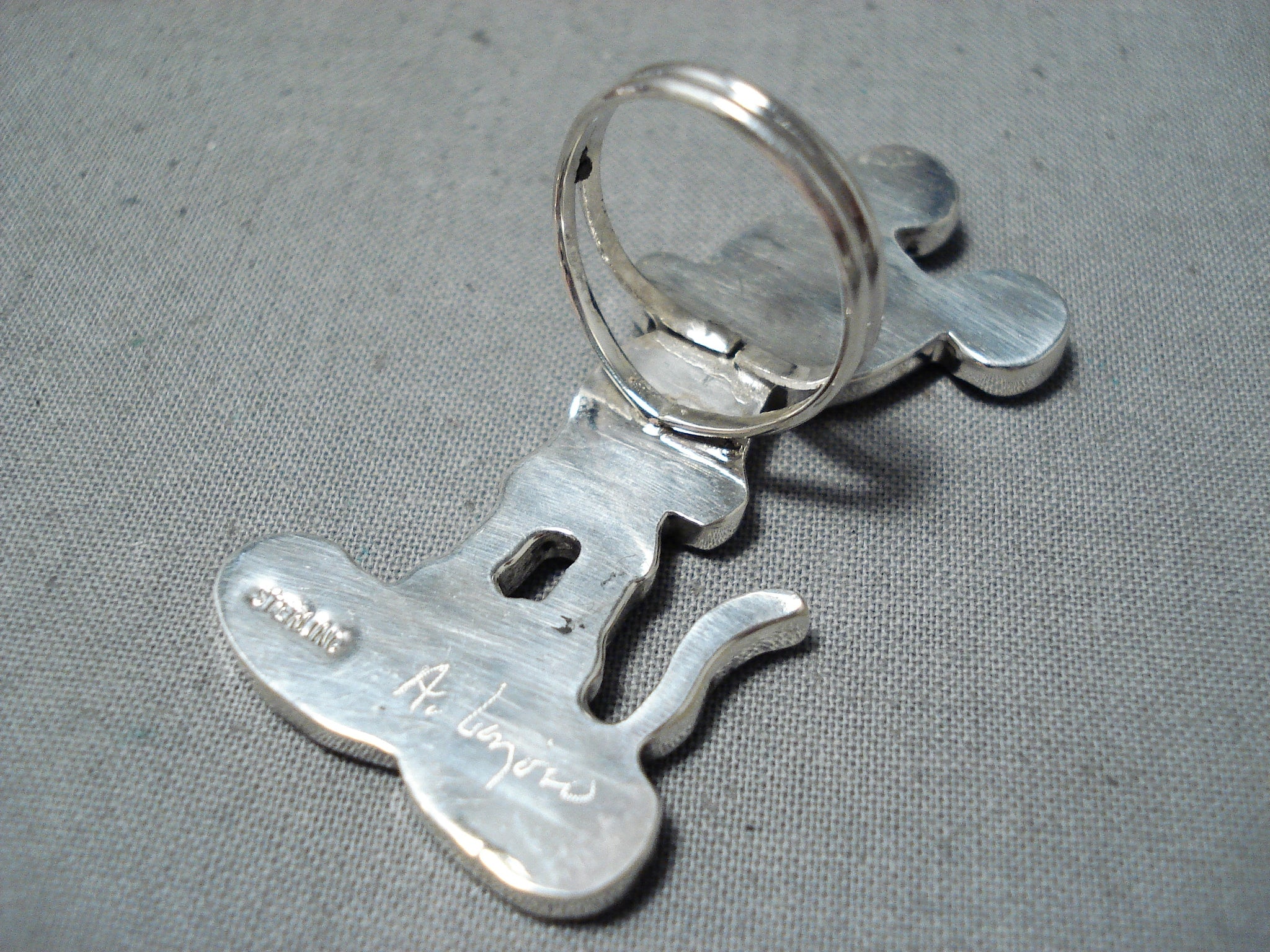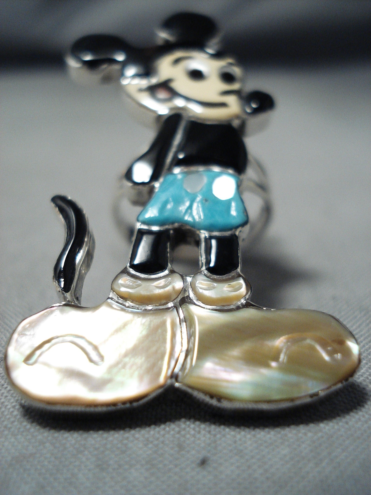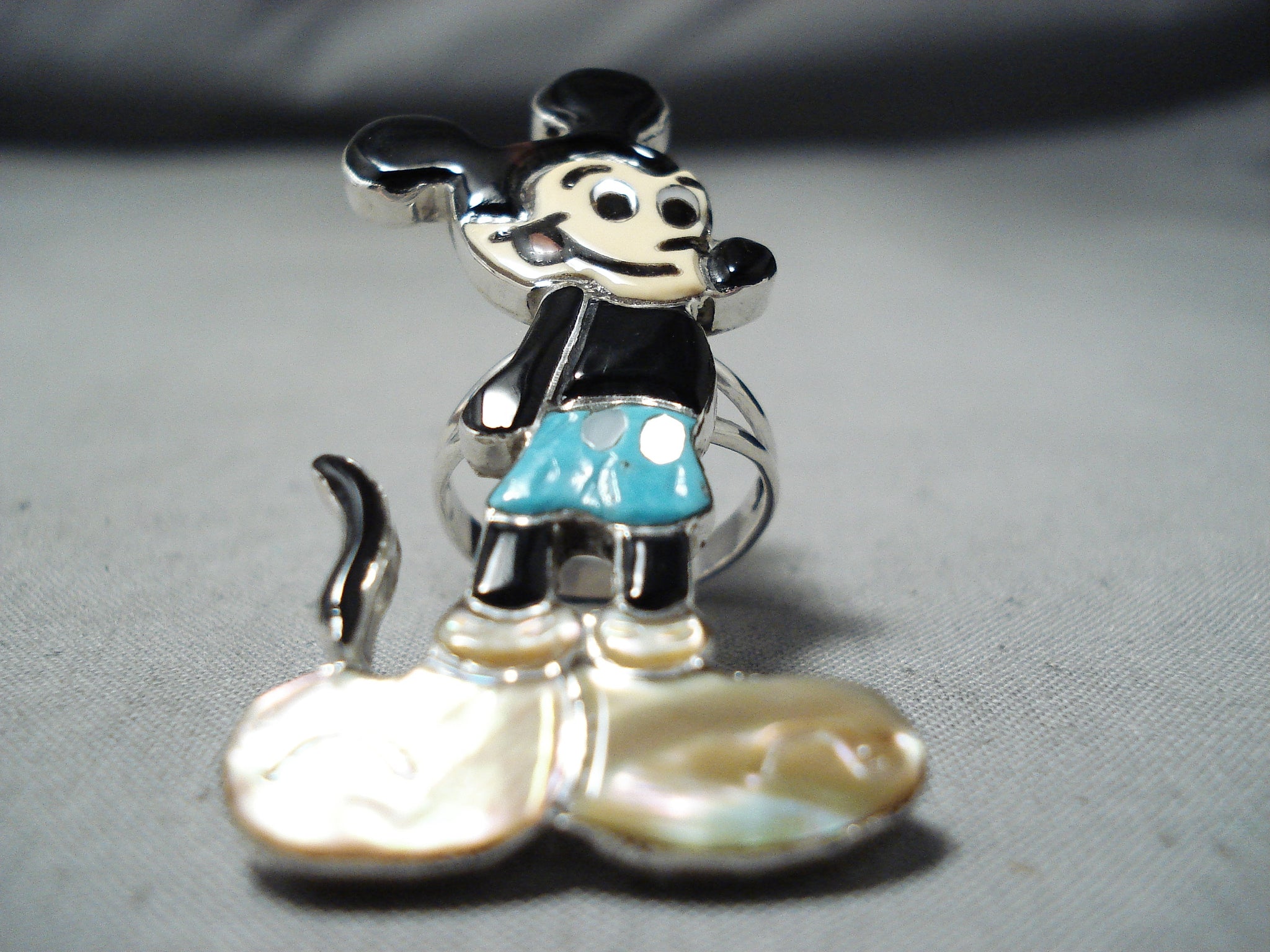 Detailed Native American Zuni Turquoise Mickey Mouse Sterling Silver Ring