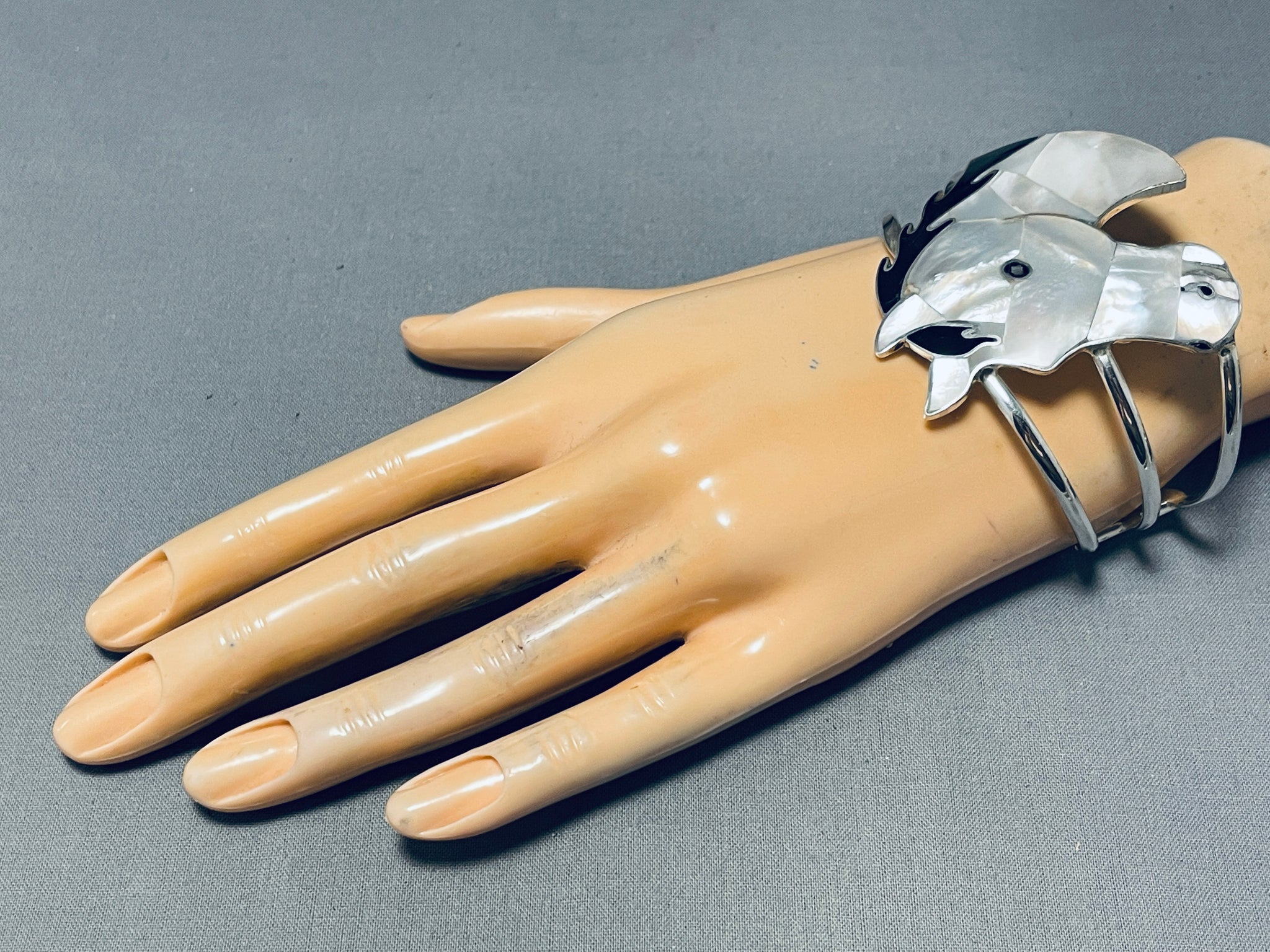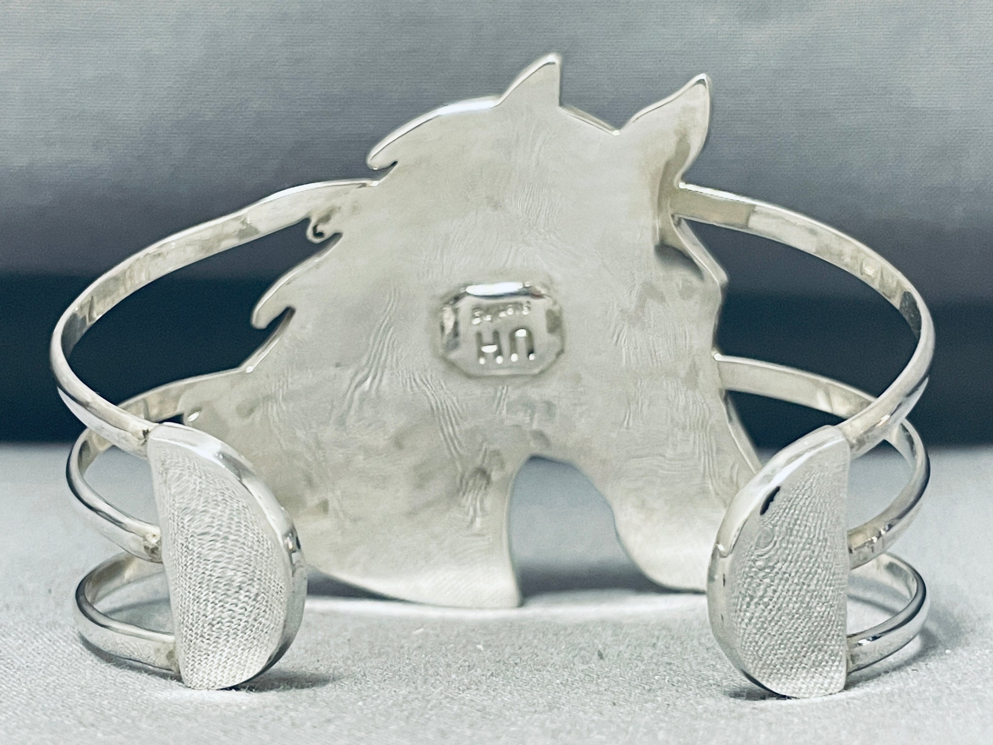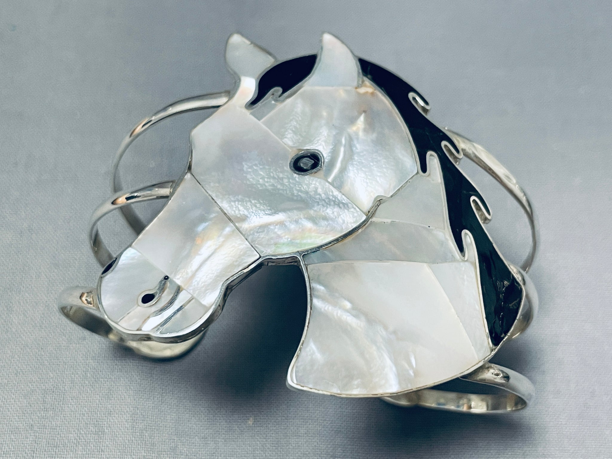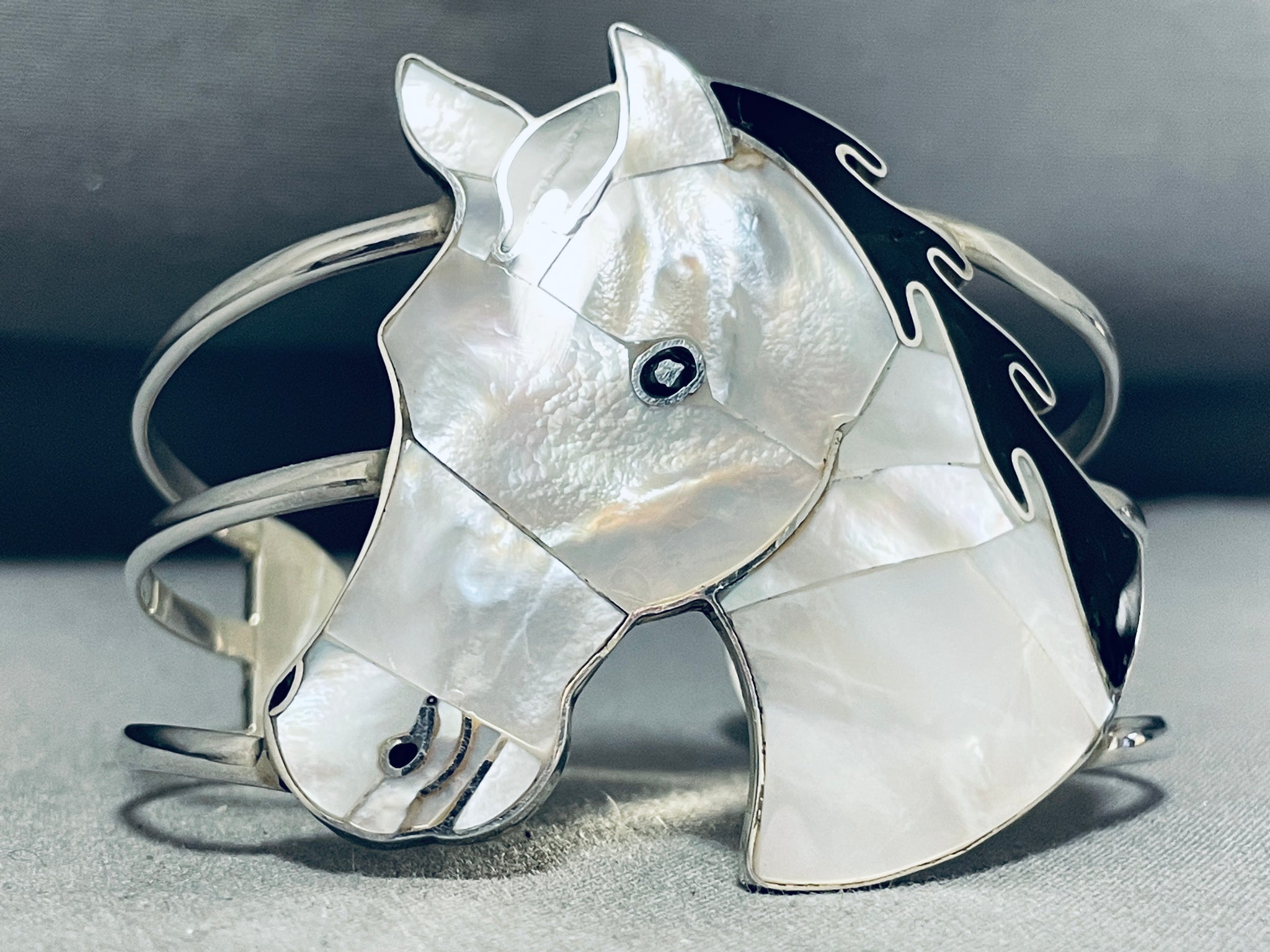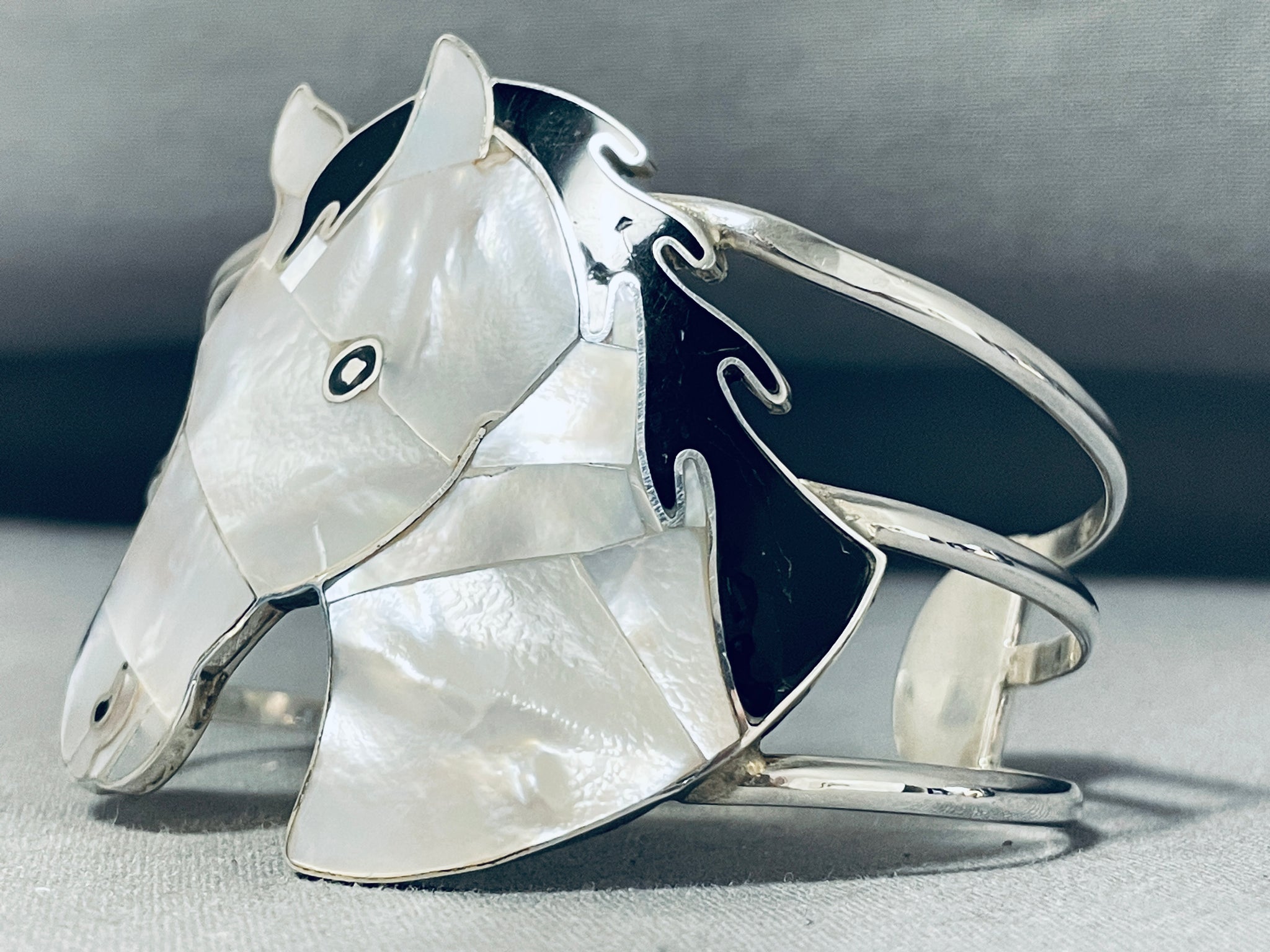 Detailed Southwestern Pearl Horse Sterling Silver Onyx Bracelet