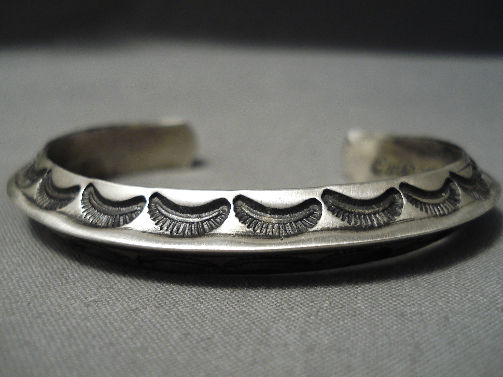 An astounding vintage Navajo silver bracelet. This is a dramatic, beveled bracelet – with fabulous handstamped sunrises decorating both sides! The width of the bracelet measures around 3/8". Signed by Navajo artist, Emerson Bill. Sterling silver, marked. The inside end to end measures around 5-1/2" with an additional 1" gap. Sturdy 46 grams.