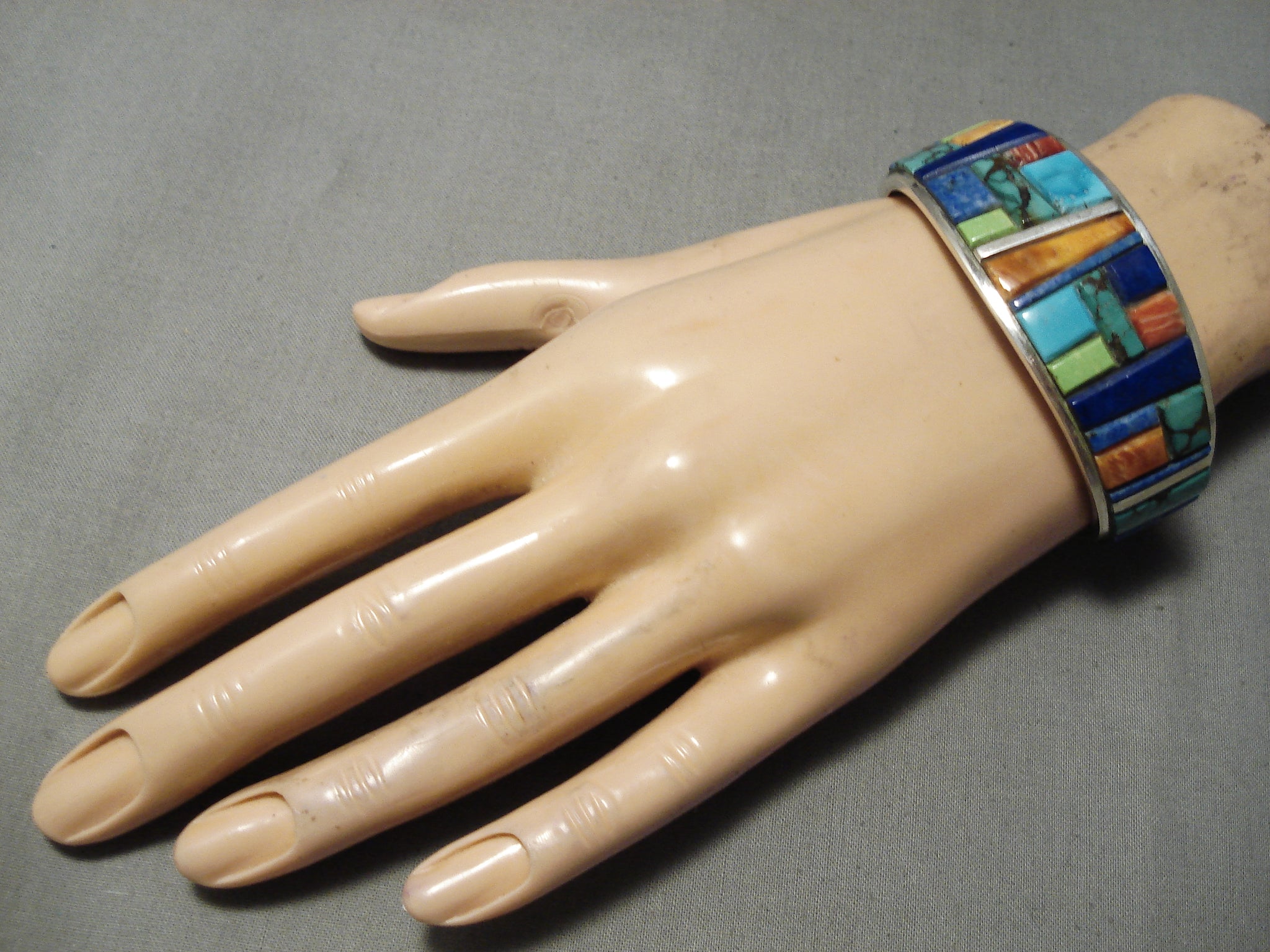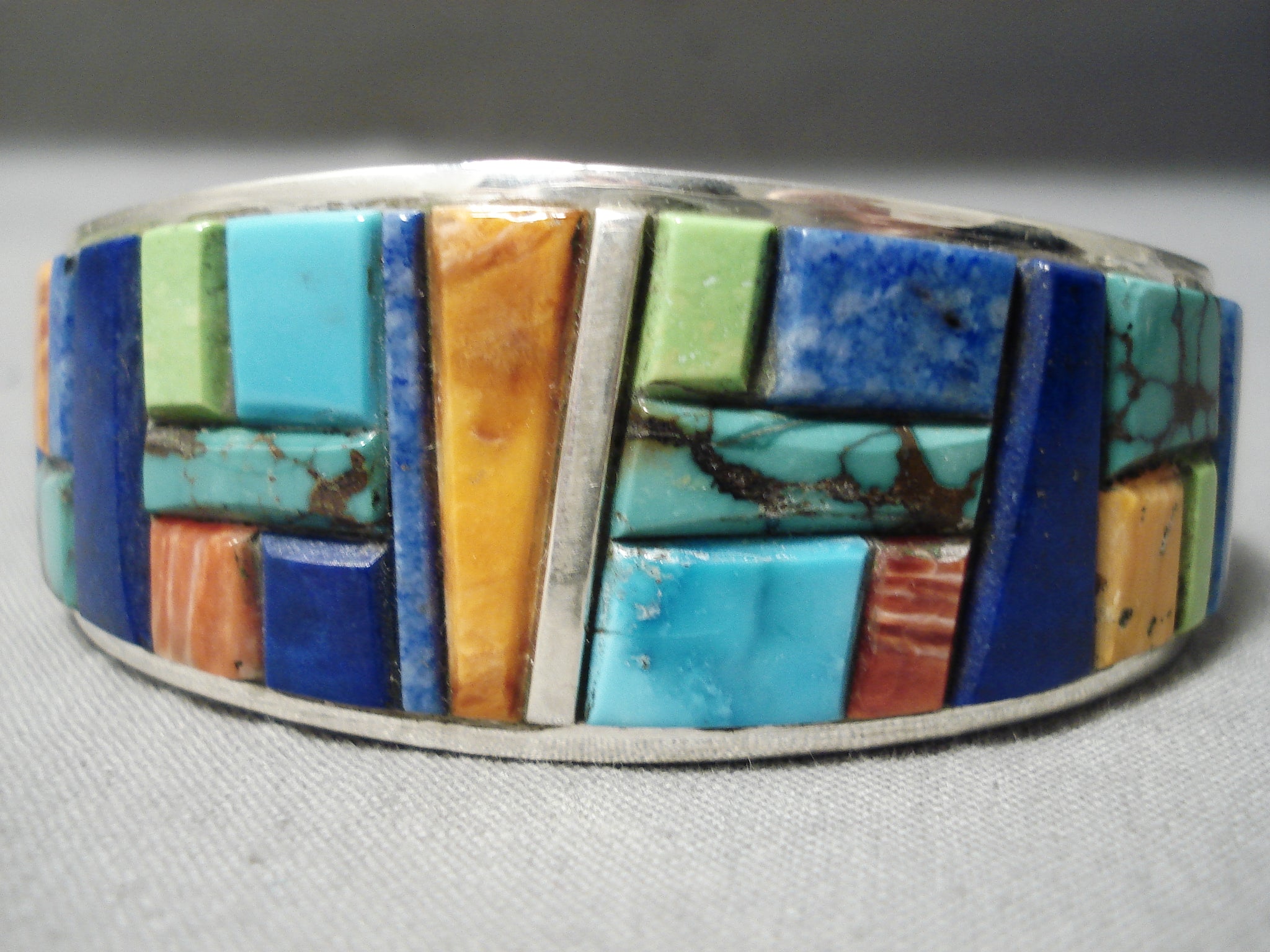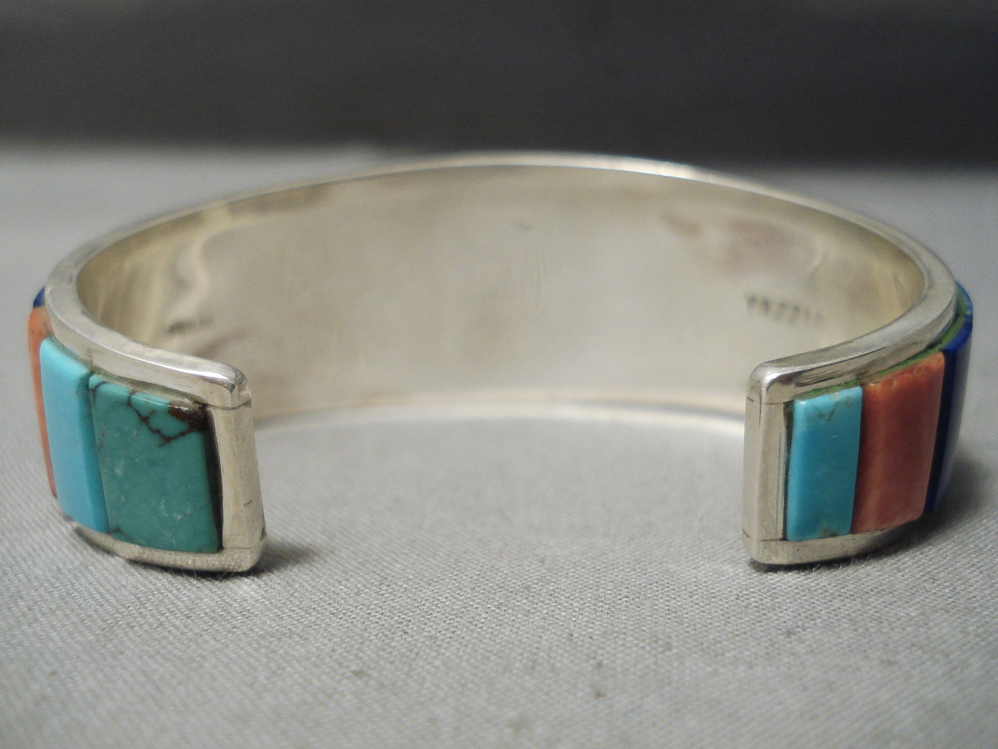 We are proud to offer this remarkable vintage Navajo silver bracelet. Can’t get over the absolutely fabulous bright colors of the mega amount of inlay stones that include turquoise, coral, lapis, denim lapis and gaspeite – arranged in a marvelous cobblestone design that reaches from end to end of the cuff – so it’s sure to be appreciated from every angle! Wow! The width of the bracelet measures around 1". Signed by Navajo artist, Yazzie. Sterling silver, marked. The inside end to end measures around 5-5/8" with an additional 1-1/8" gap. Sturdy 44 grams.