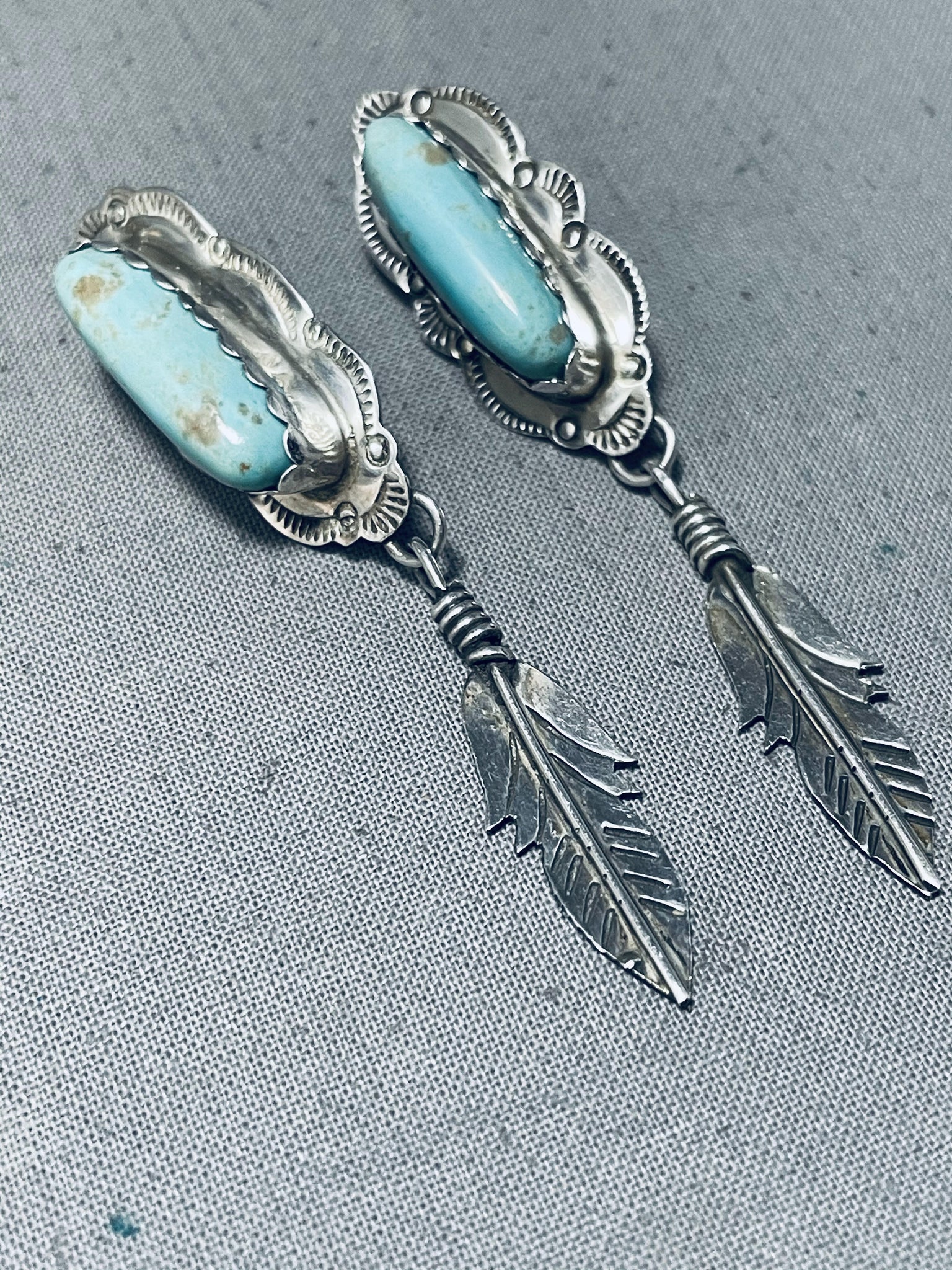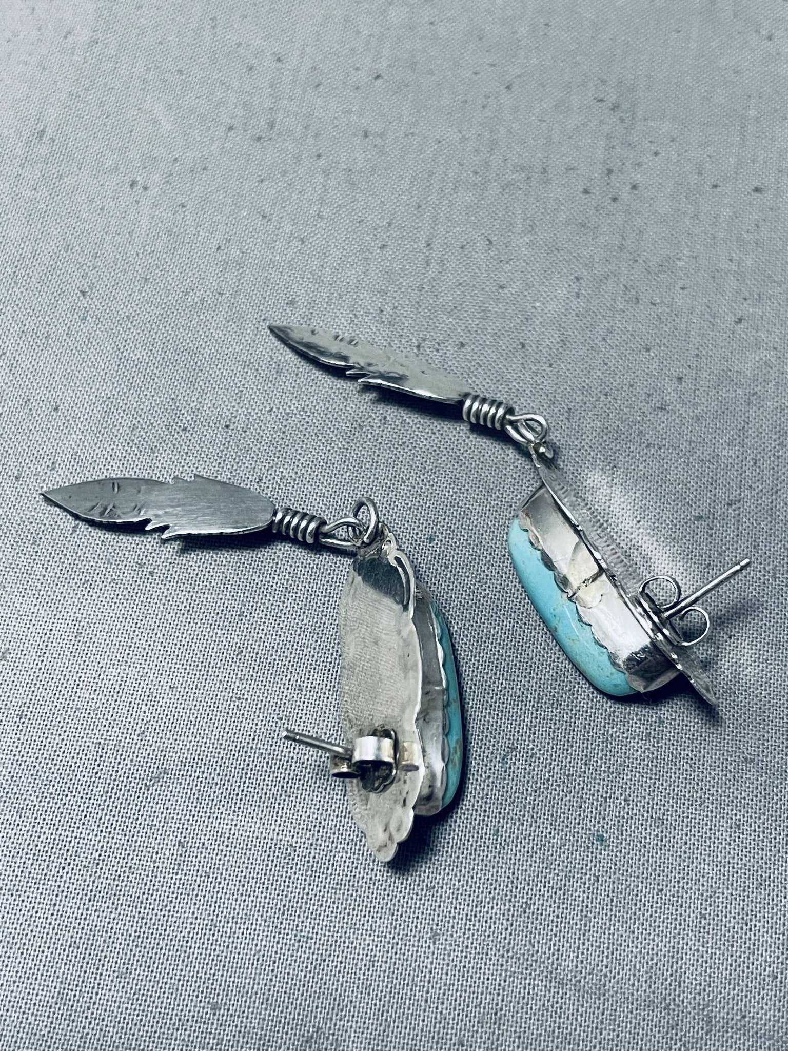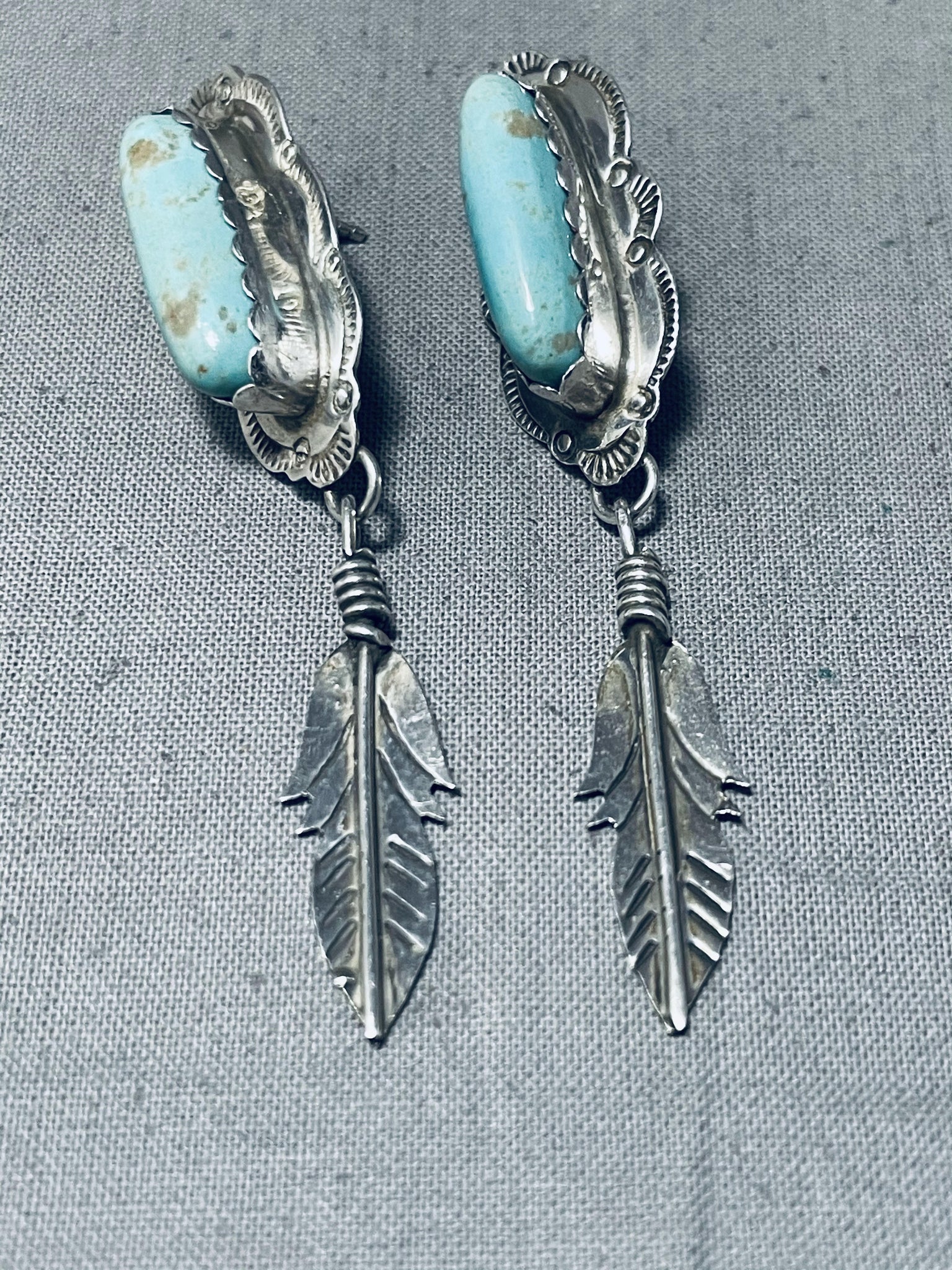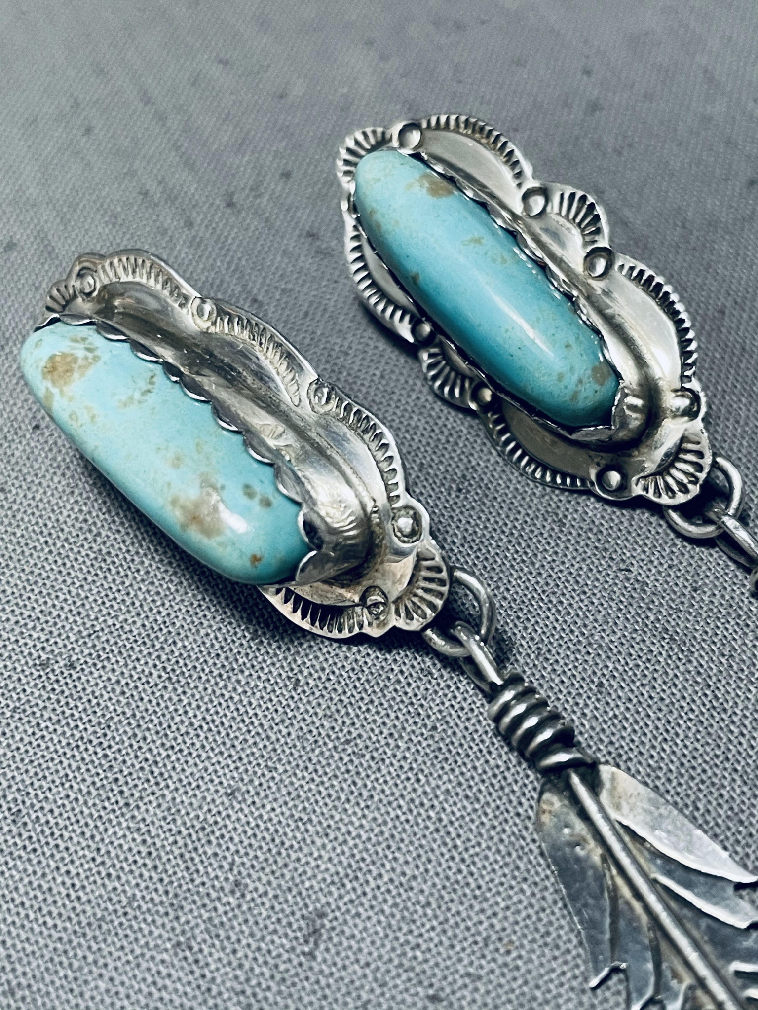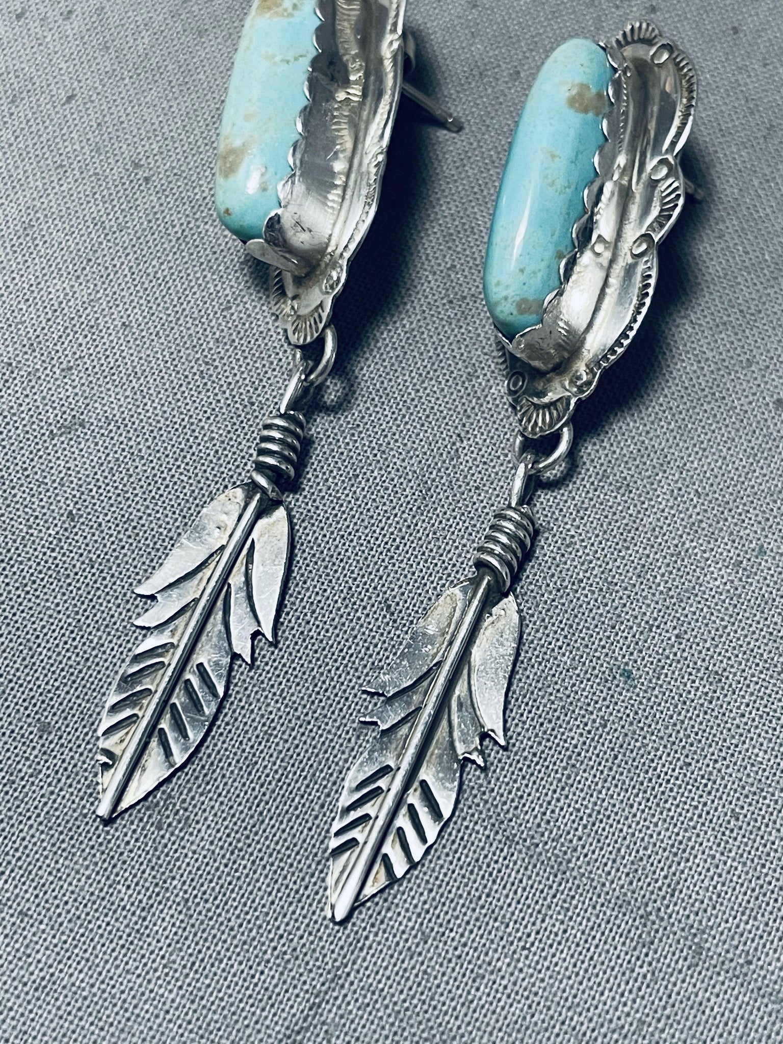 Detailed Vintage Native American Navajo #8 Turquoise Sterling Silver Earrings