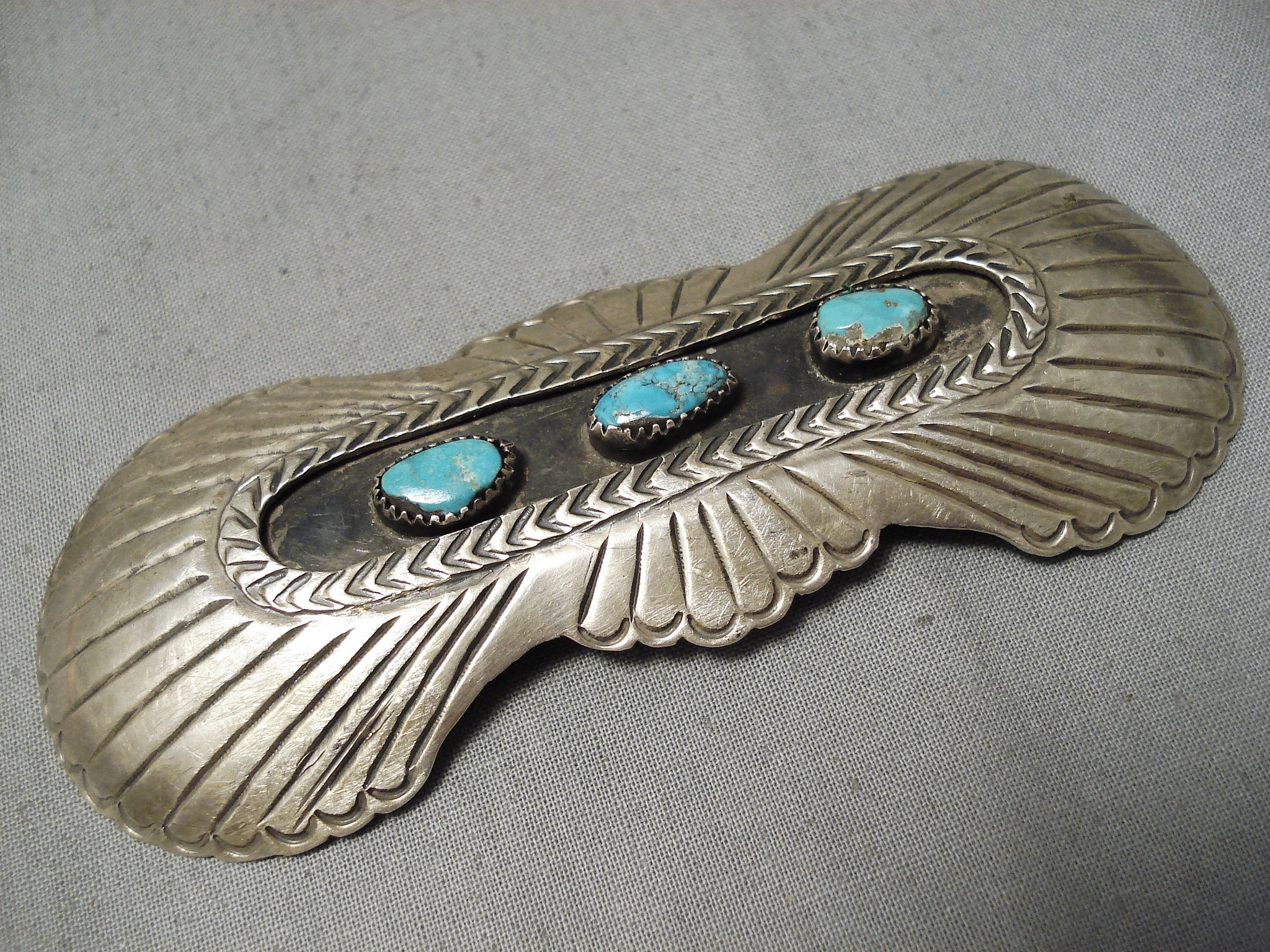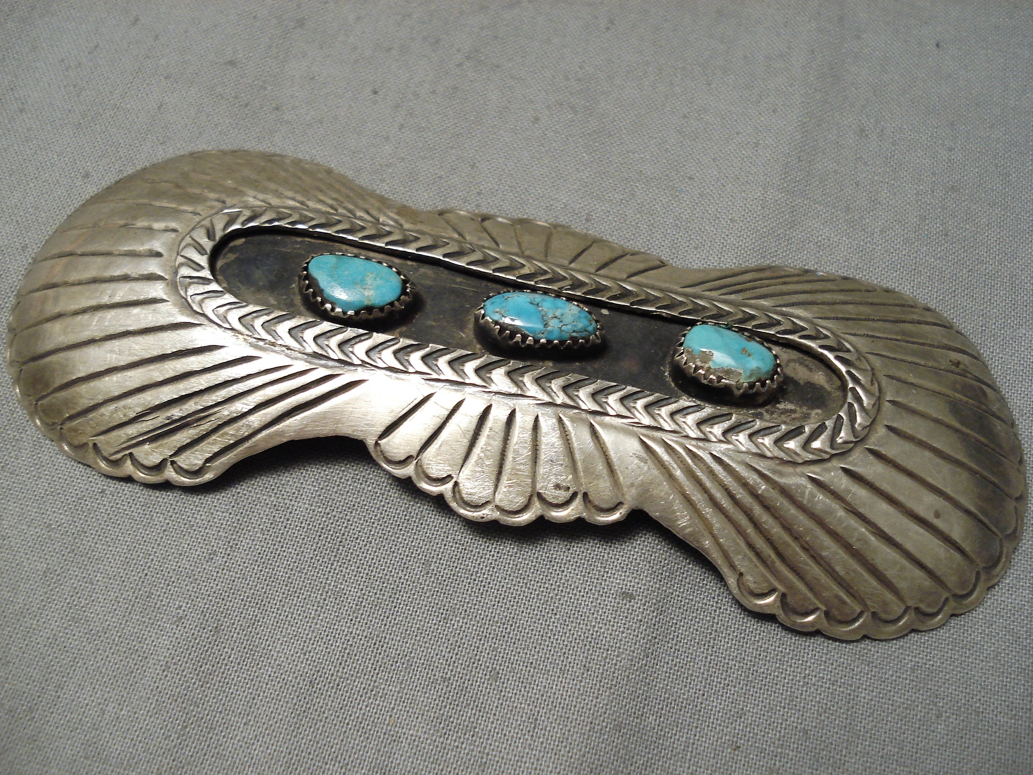 Detailed!! Vintage Native American Navajo Bursting Sterling Silver Turquoise Pin Old