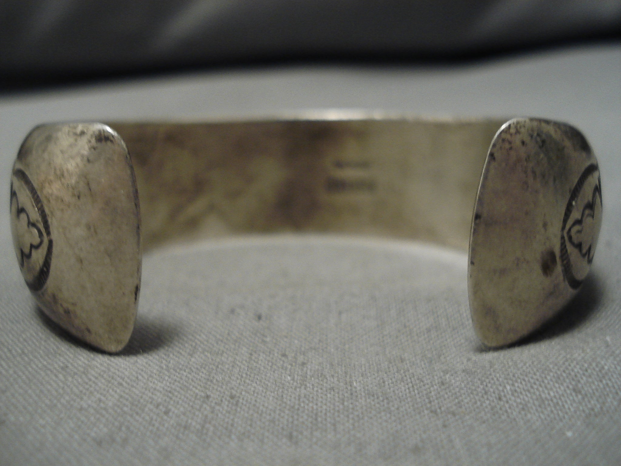 This is a magnificent vintage Navajo silver bracelet. The amazing handstamped designs of this dimensional cuff seemingly burst forth as they reach from end to end. The width of the bracelet measures around 3/4". Signed by Navajo artist, Albert Bighand. Sterling silver. The inside end to end measures around 5-1/4" with an additional 1-1/8" gap. Sturdy 26 grams.