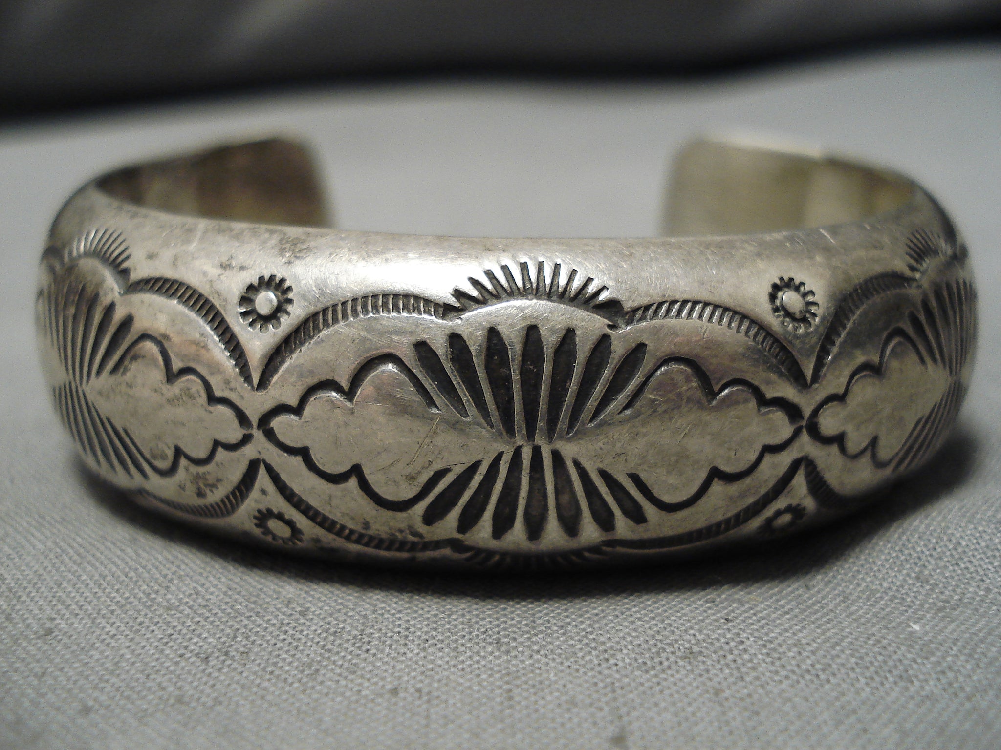 Detailed!! Vintage Native American Navajo Hand Tooled Cloud Sterling Silver Bracelet Old Cuff