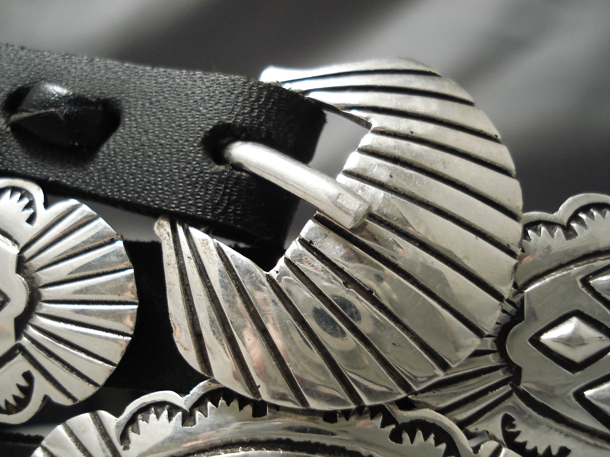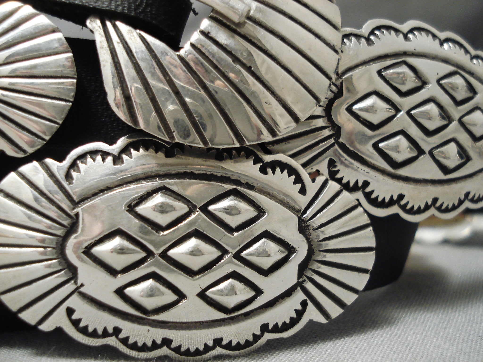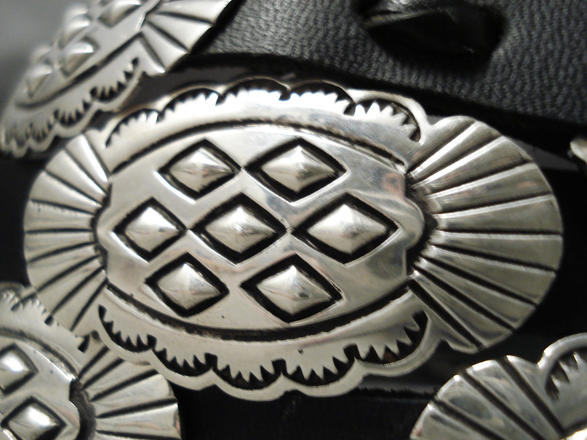 Detailed!! Vintage Native American Navajo Hand Tooled Sterling Silver Concho Belt