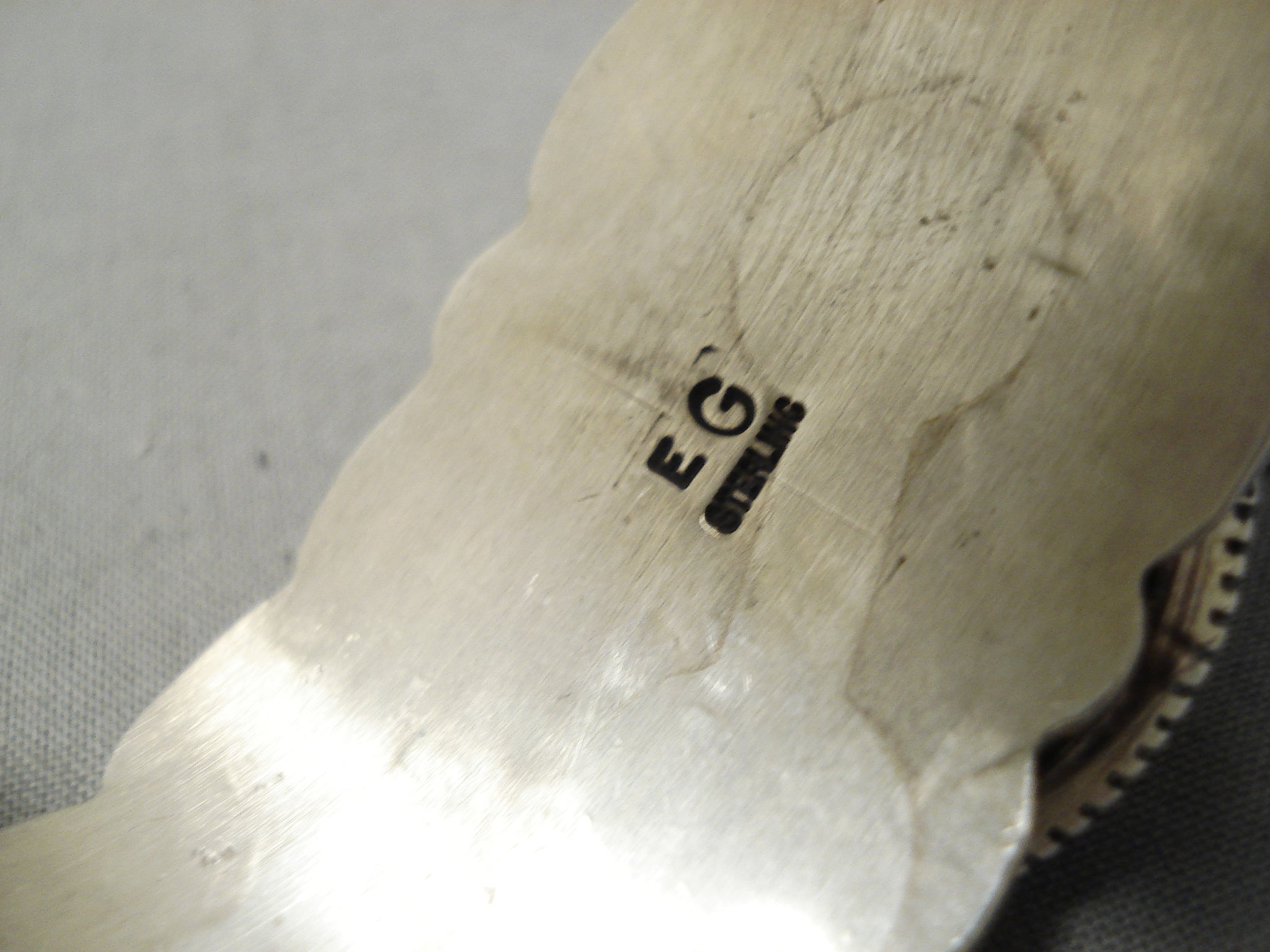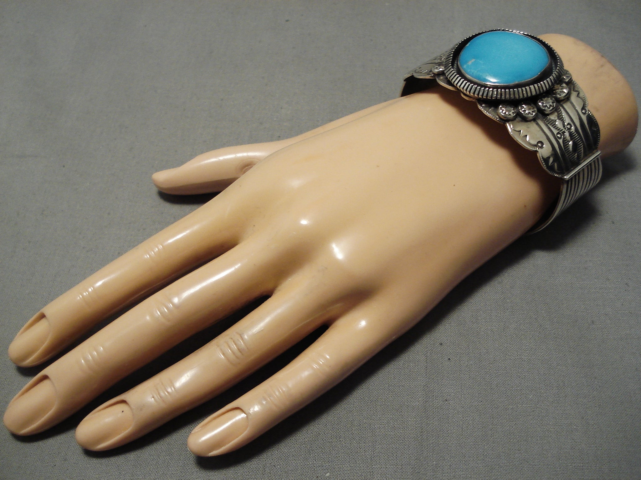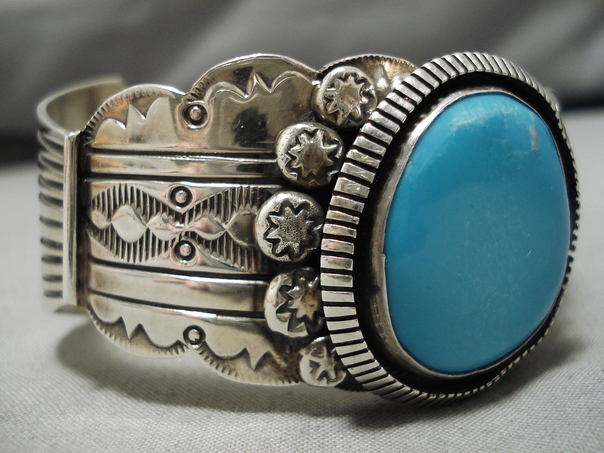 This is an impressive Navajo single stone silver bracelet. This piece contains a beautiful center rounded Blue Gem turquoise stone that is situated in a wonderful shadowbox setting. Bordering the shadowbox setting are stunning channel patterns. Accenting the sides of the stone are amazing starred silver beads. Running down the ends of the cuff are phenomenal silver sun bursting patterns with accenting sun stampings and dotted patterns. The center of the cuff is beautifully bordered with cloud patterns. The center stone measures around 1" x 1". The width of the bracelet measures around 1-1/4". Signed by Navajo artist, Eddie Gruber . Sterling silver, marked. Cir. 1970's+. The inside end to end measures around 5-3/4" with an additional 1-1/4" gap. Sturdy 70 grams.