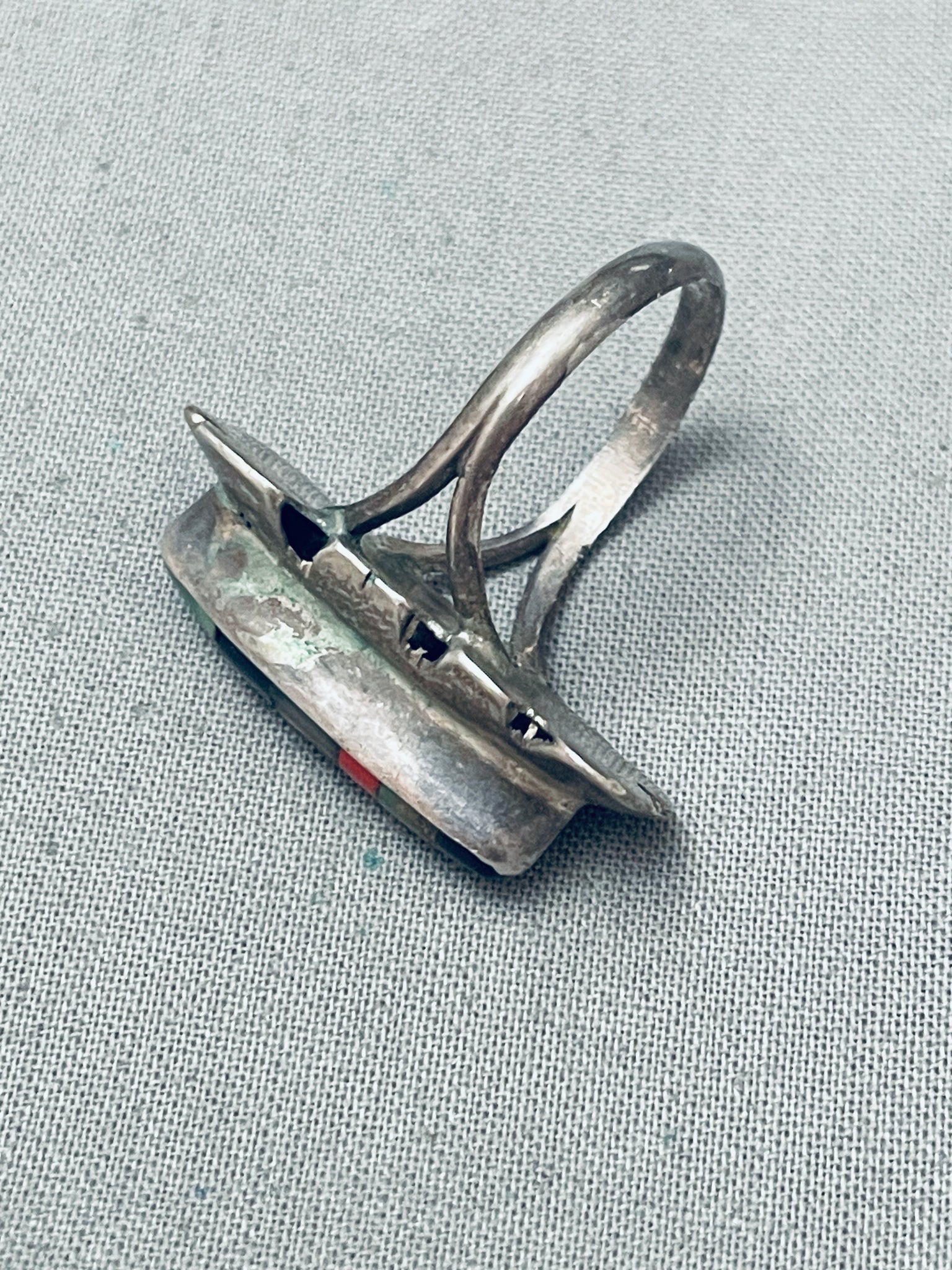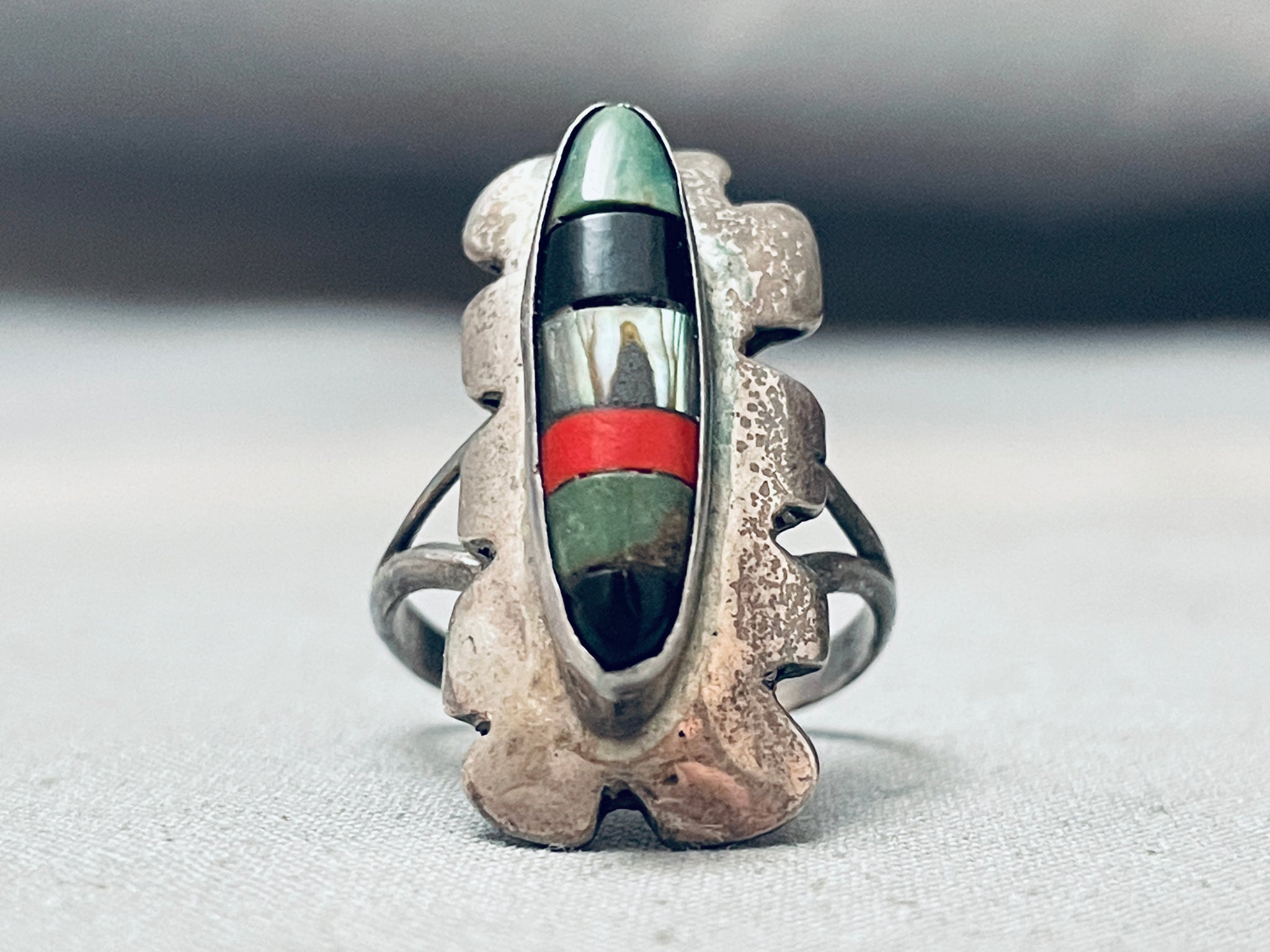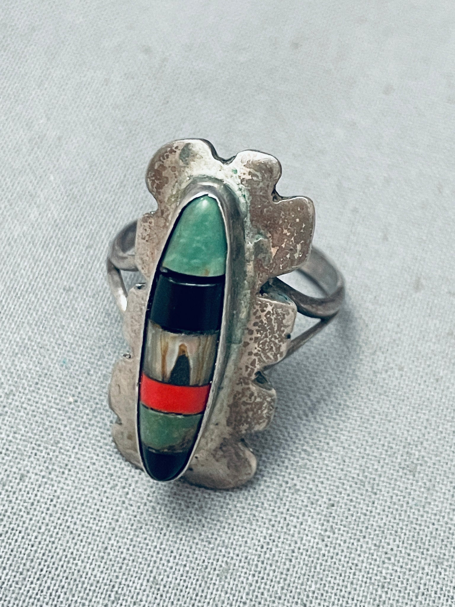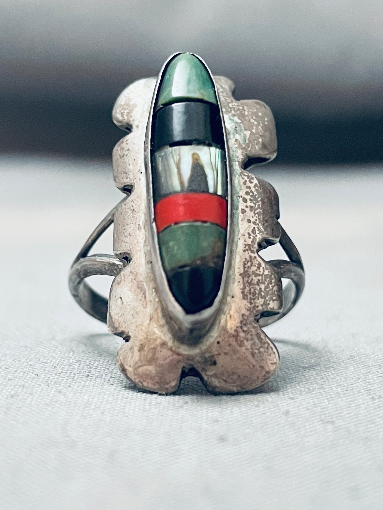 This is a striking vintage Navajo inlaid silver ring. This ring contains a center channel inlaid section that consists of abalone, coral, Royston turquoise, and onyx. The inlaid section is beautifully situated on a stunning waving silver plate. The ring contains a double silver shank that graduates into one shank on the back. The ring contains old natural patina. The ring face measures around 1-1/8" x 1/2". The ring size is around 8.5. Cir. Mid century+. Sterling silver. Sturdy 4 grams.