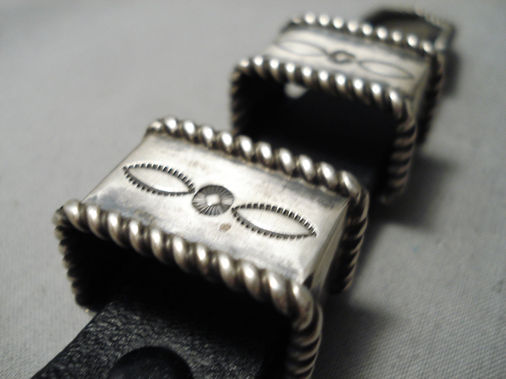 A tremendous vintage Navajo silver ranger buckle. This impressive ranger buckle set comes with the incredible 2-1/8” x 1-7/8” buckle with the vibrant Red Mountain turquoise stone in the center. It has 2 retainers that are 5/8” high – nice to accommodate a thicker belt. And the tip measures about 1-1/8” x ¾”. All matching pieces have fabulous handstamped designs and a thick silver rope outer border. The center stone measures around 1/2" x 7/16". Sterling silver, marked. Signed by Navajo artist, H. Morgan . Sturdy 80 grams.