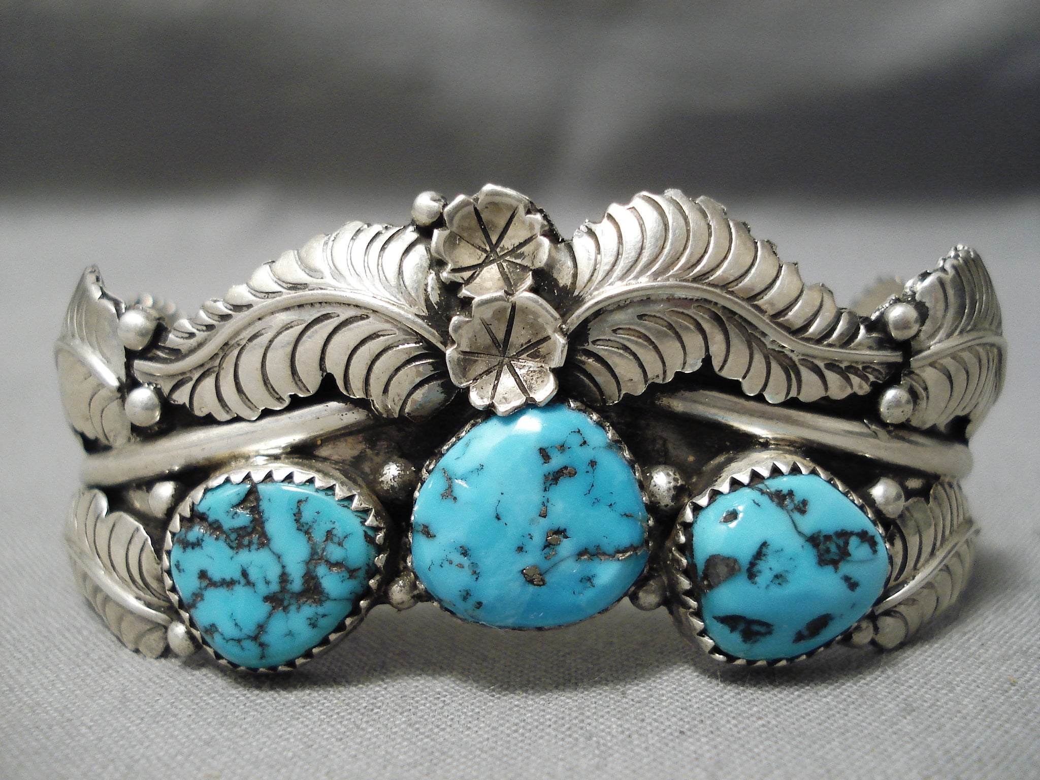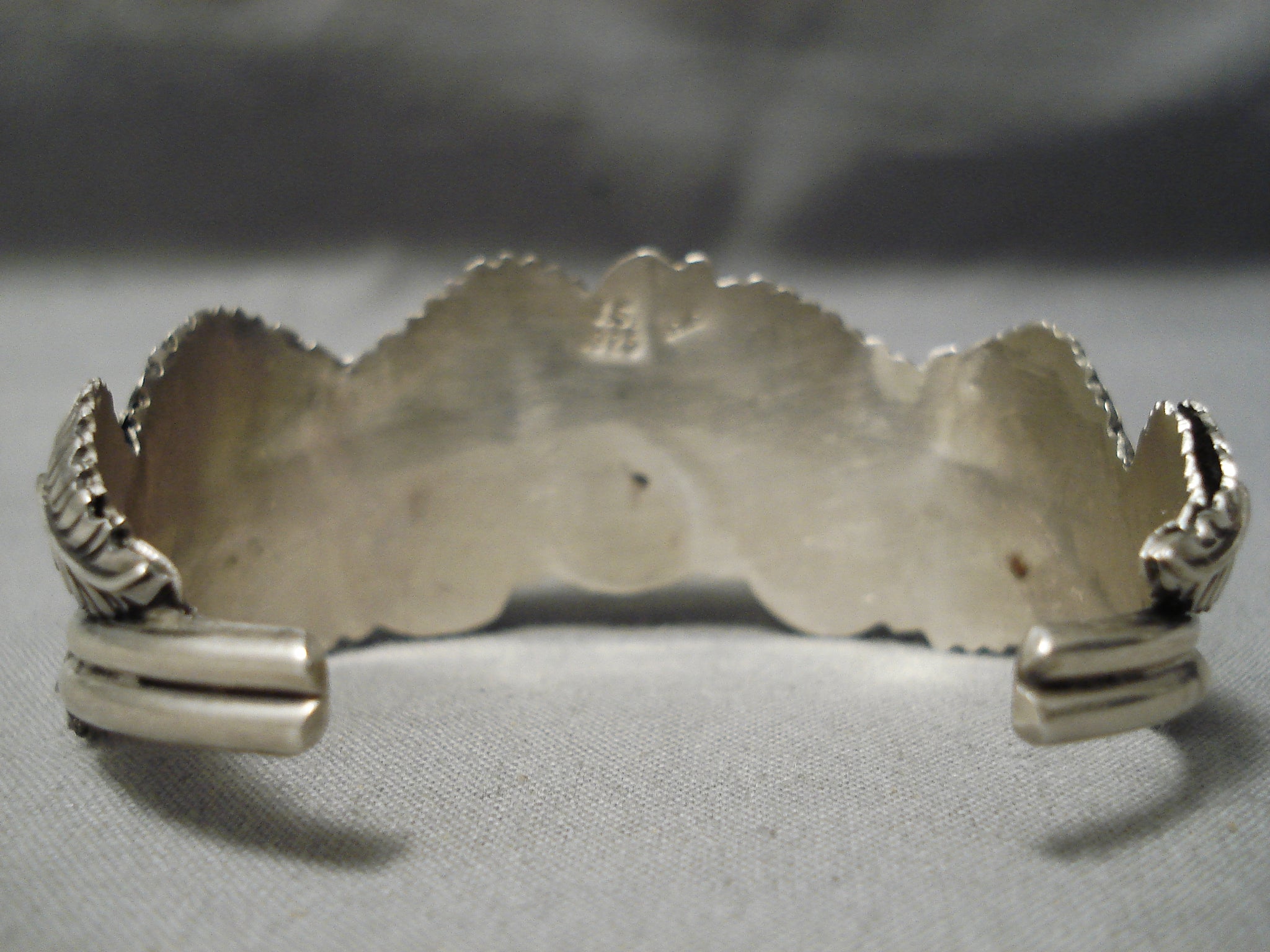 Detailed!! Vintage Native American Navajo Spiderweb Turquoise Sterling Silver Leaf Bracelet