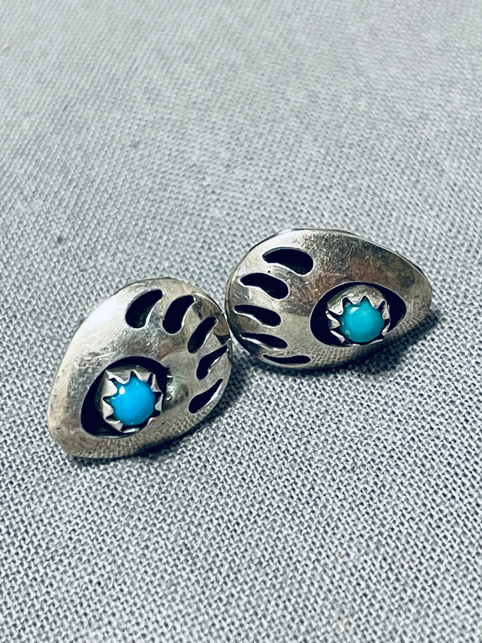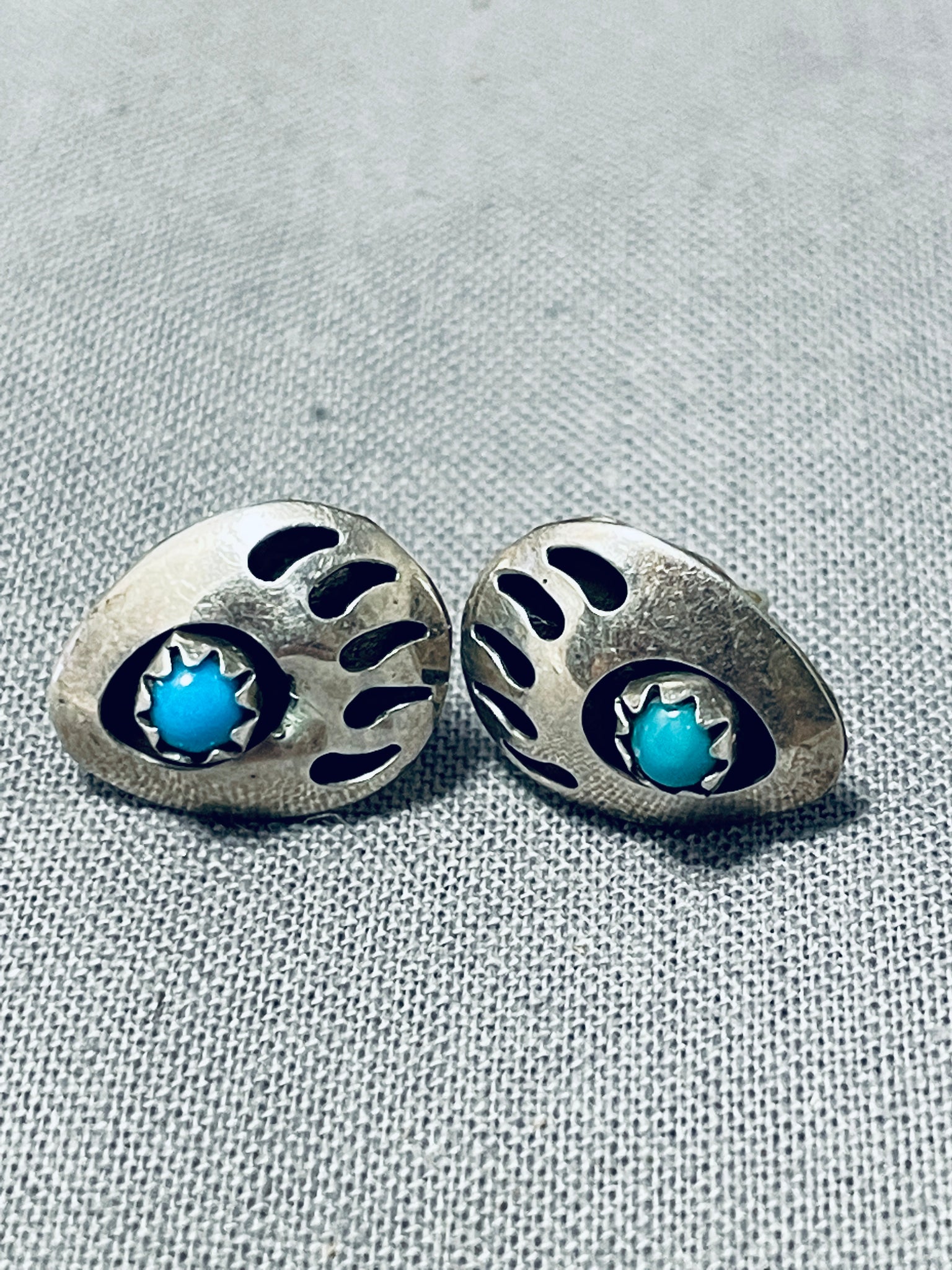 This is a striking Navajo turquoise and silver pair of earrings. These earrings are amazing as they are hand carved into paw prints with accenting snake eye shaped Sleeping Beauty turquoise stones. Each earring measures around 1/2" X 3/8" and is egg shaped. Sterling silver . The earrings weigh around 1 gram.