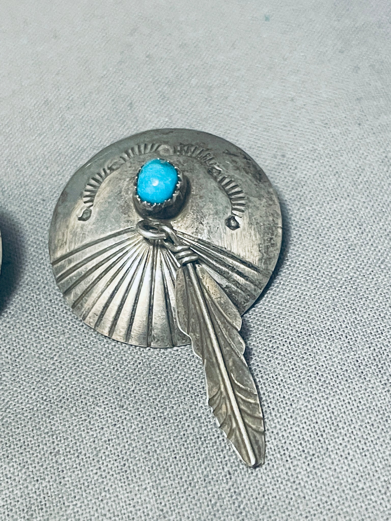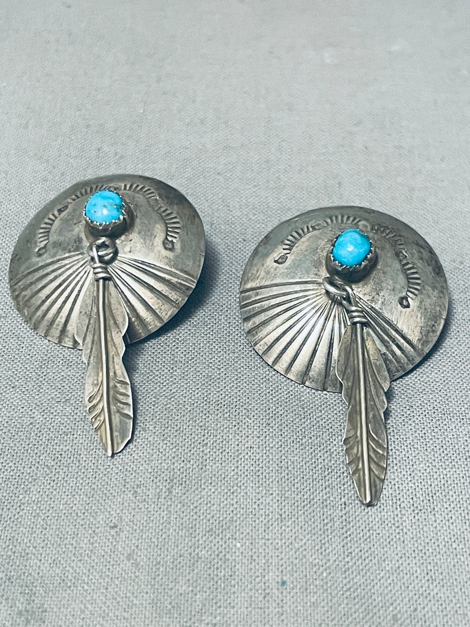 This is a striking vintage Navajo pair of silver earrings. These earrings are beautiful as they each consist of a center large snake eye shaped blue turquoise stone. Accenting the stones are marvelous silver works that include sun bursting patterns, sun stampings, dotted works and remarkable dangling handmade silver feather designs. The workmanship is just spectacular. Each earring measures around 1" in diameter. Sterling silver. Cir. Mid century . The earrings weigh around 6 grams.